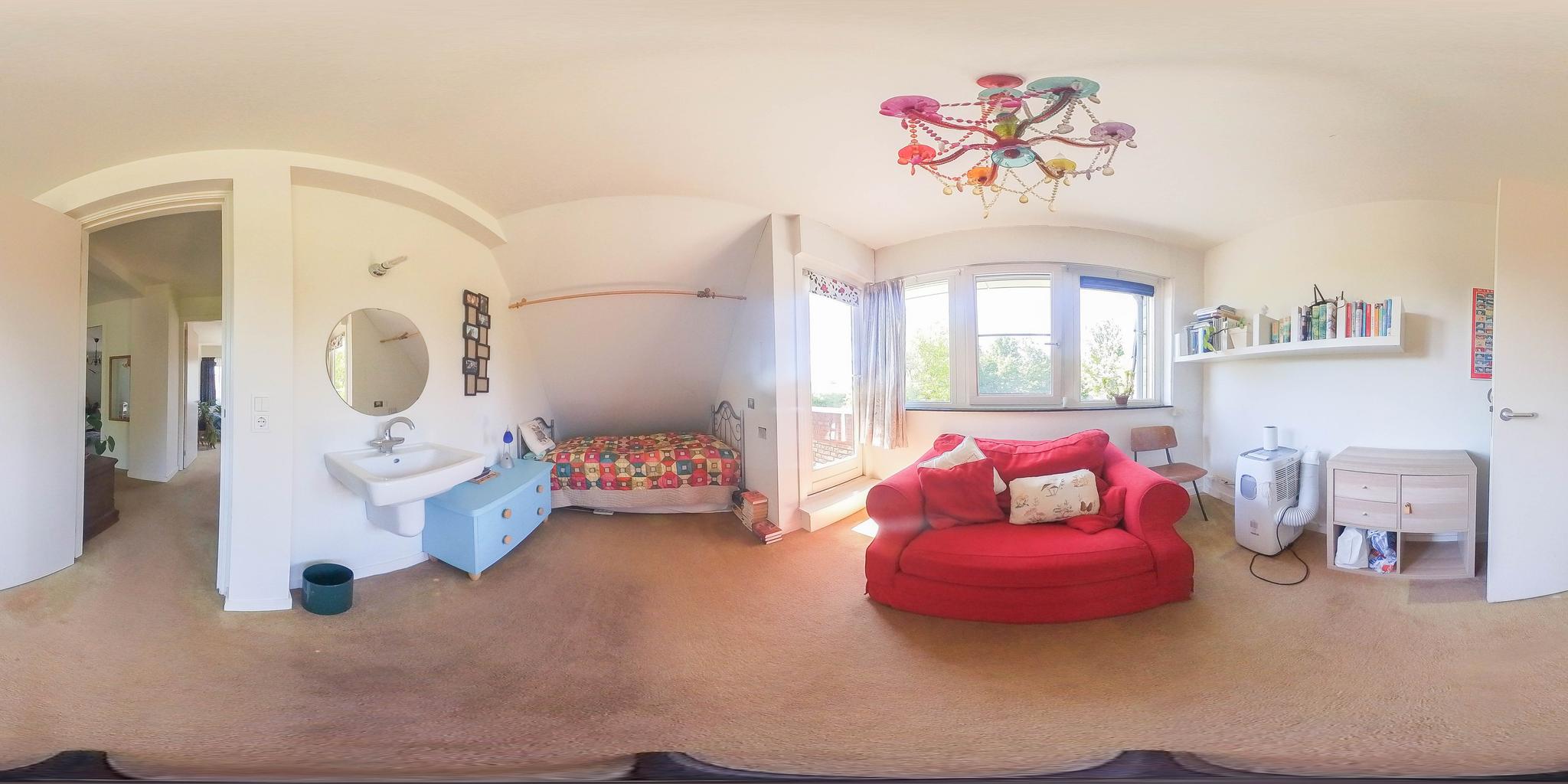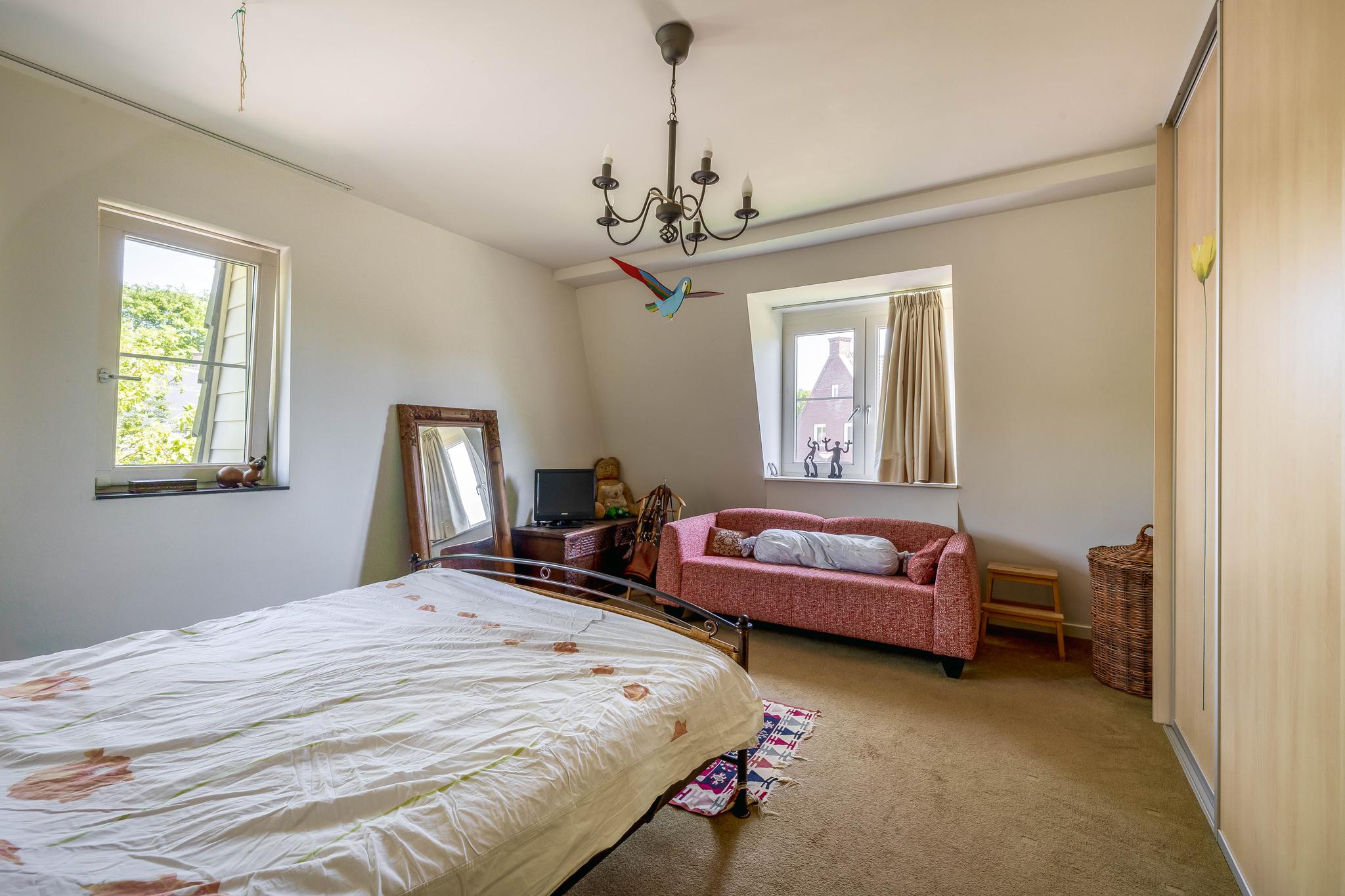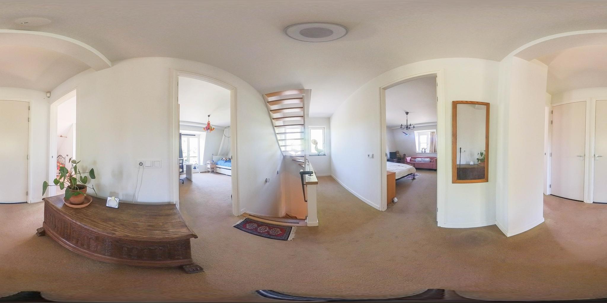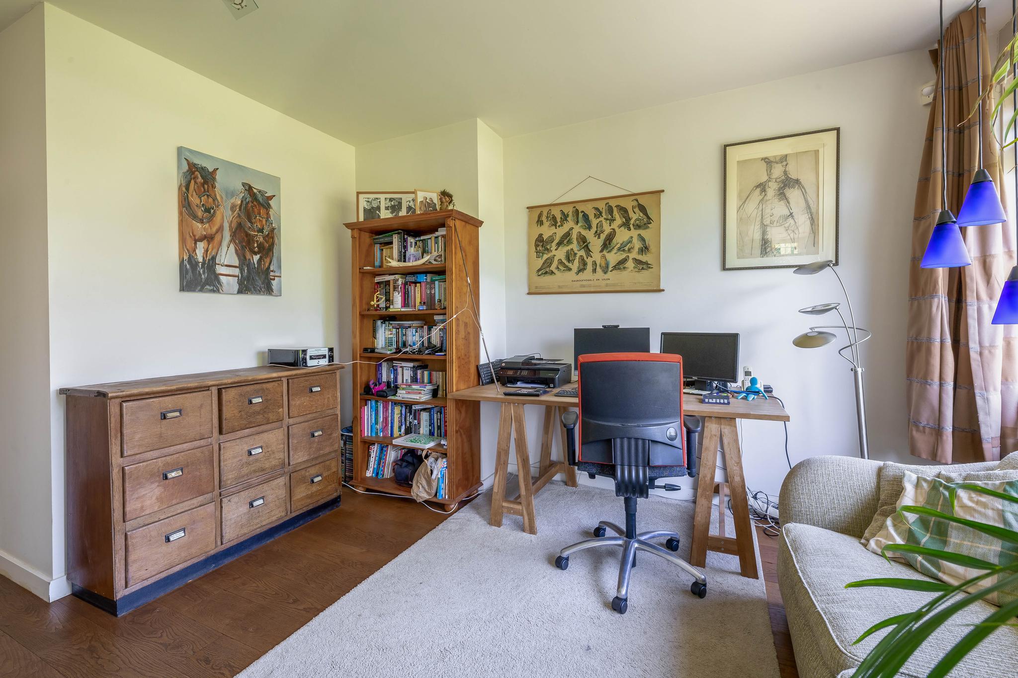A fixed open staircase from the landing leads to the spacious attic. This space could be converted into an extra room. It houses the heat pump installation and the solar boiler. There is also cupboard space under the sloping roof and two Velux skylights provide daylight.