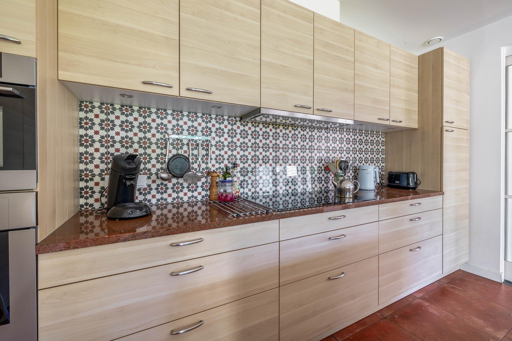 The spacious kitchen/diner is adjacent to the living room and is connected by double sliding doors. Here too, large windows provide plenty of light. The kitchen layout is practical with three areas: a wall unit with various built-in appliances such as a 5-burner induction hob, extractor hood, oven, combi-oven microwave, and refrigerator. The worktop is made of composite and the back wall has Portuguese tiles. There is also a sink island with a dishwasher, composite worktop, and one and a half sinks, and a built-in cupboard wall.