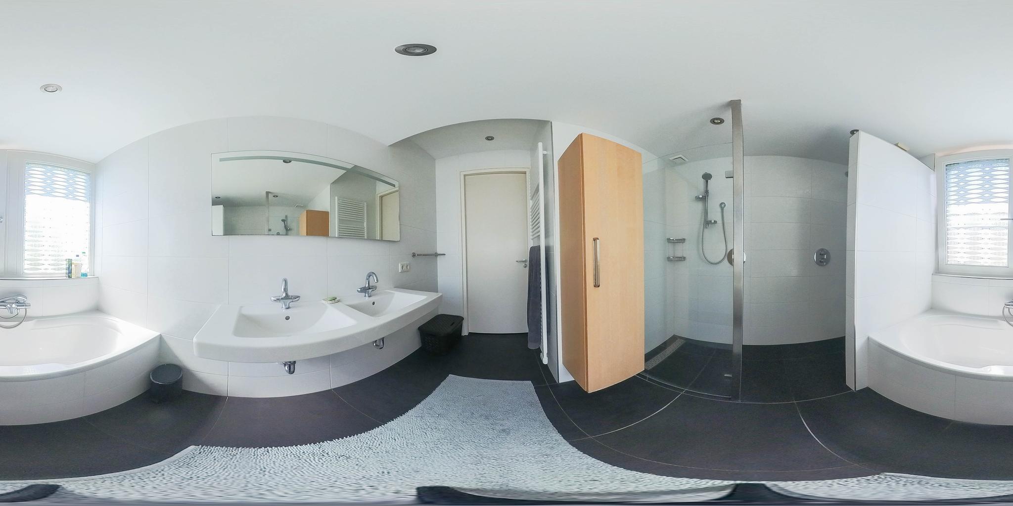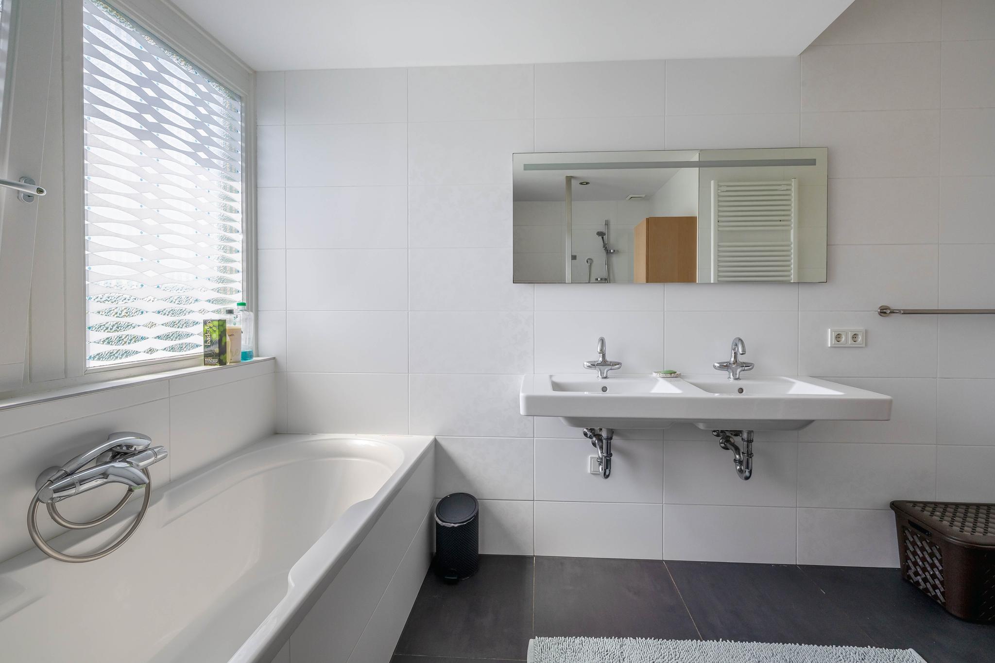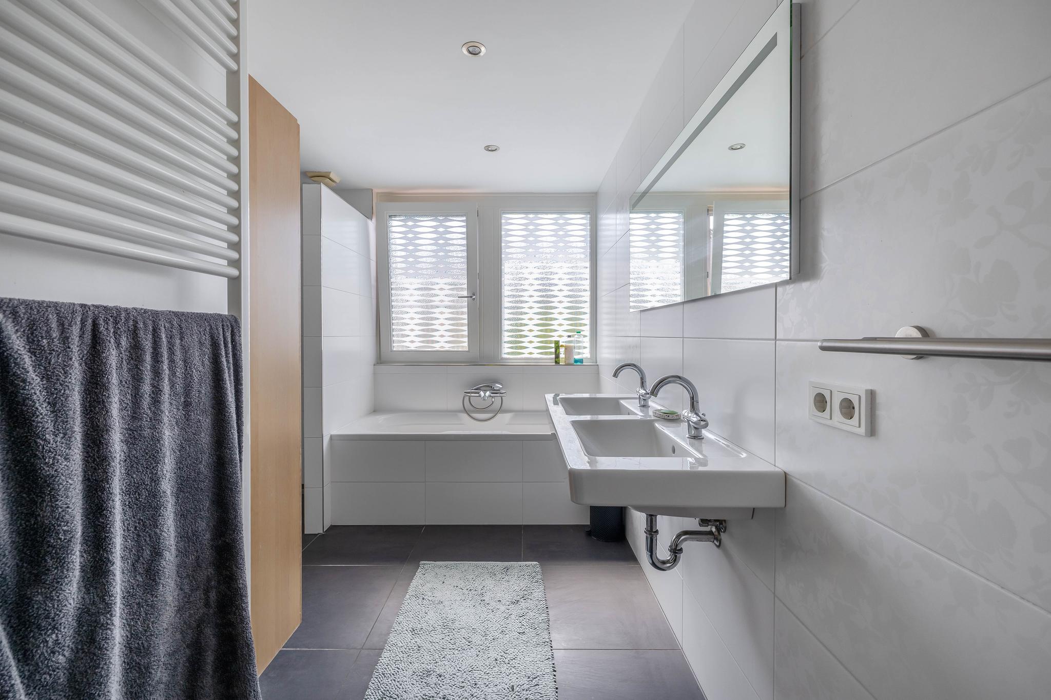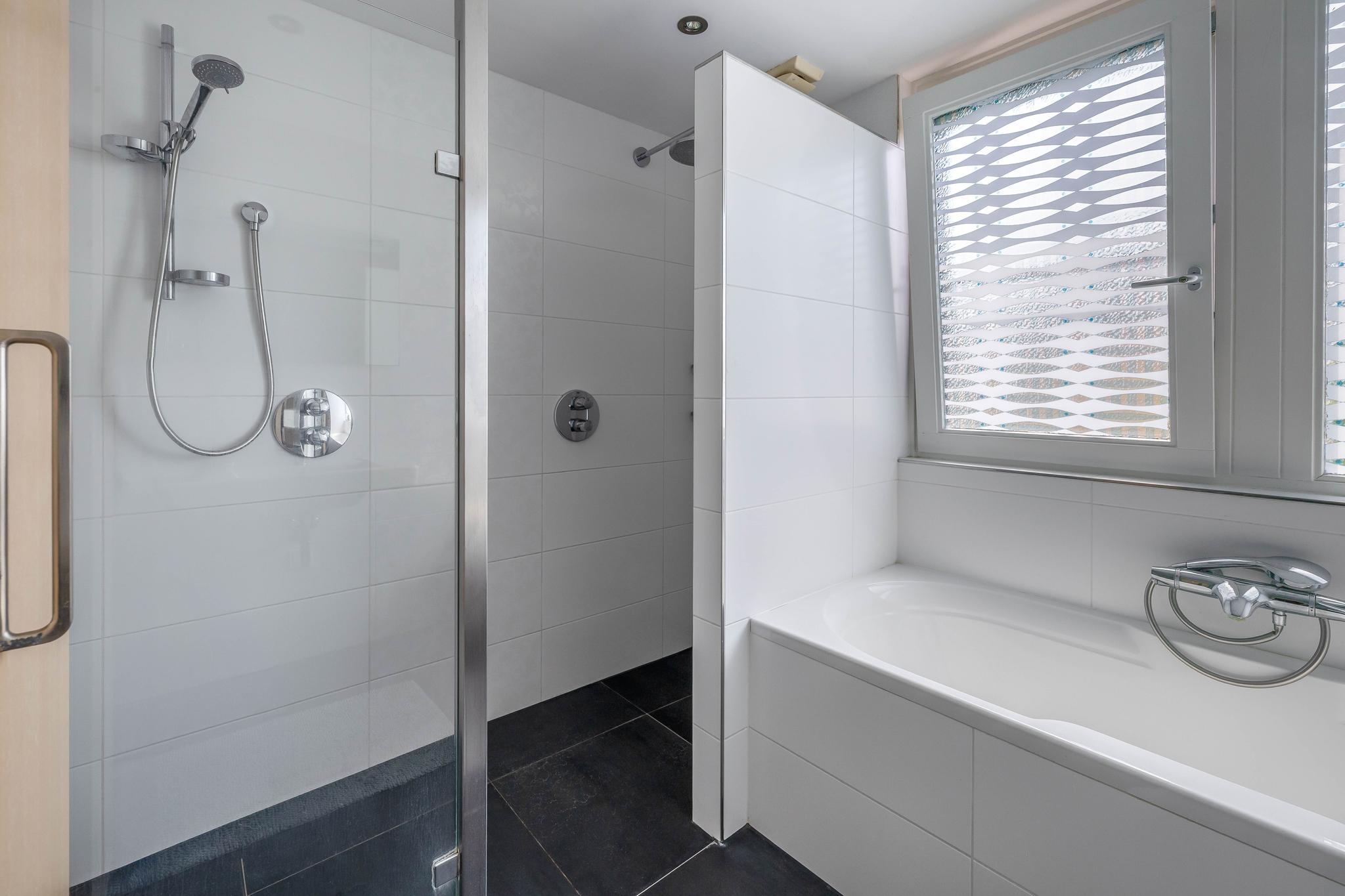 The fully tiled bathroom is equipped with all modern conveniences: a bathtub with thermostat and shower set, a very spacious double walk-in shower with rain and hand shower, two integrated thermostat taps, and two shower drains. The shower has a glass shower wall. There is also a double sink, an electric designer radiator, and underfloor heating.