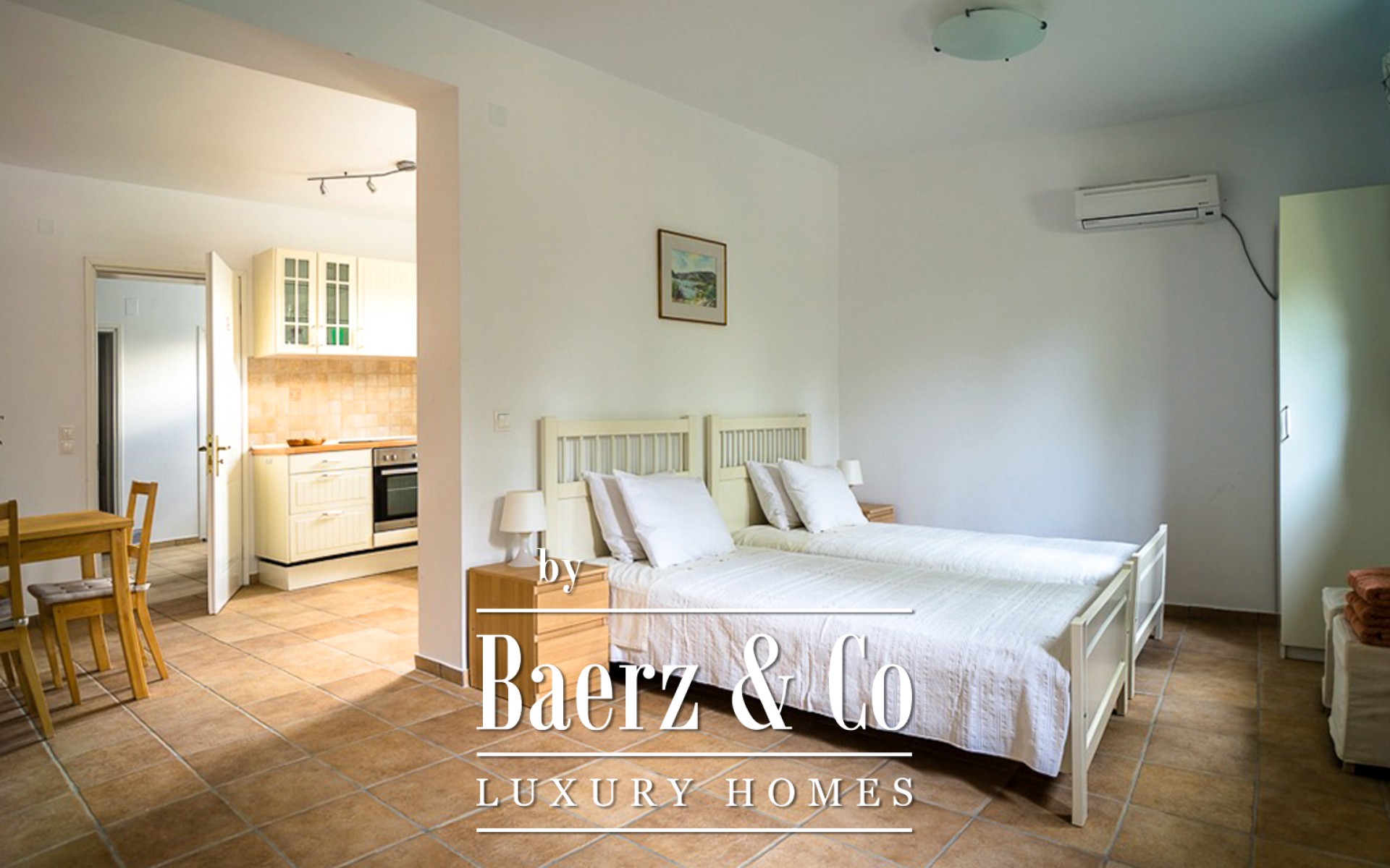 Distinctive features include underfloor heating in selected areas, air conditioning in all bedrooms and the guest apartment, a granite staircase, fireplace, and a fully equipped kitchen. Three private parking spaces and two shared spaces are provided within a legally defined co-ownership structure. The villa’s setting is peaceful yet accessible, with paved access and a landscape of mountain and nature views enhancing the sense of openness. Suitable for private residence or rental activity, Villa Ellomeno offers timeless quality and considered design on the Ionian coast.