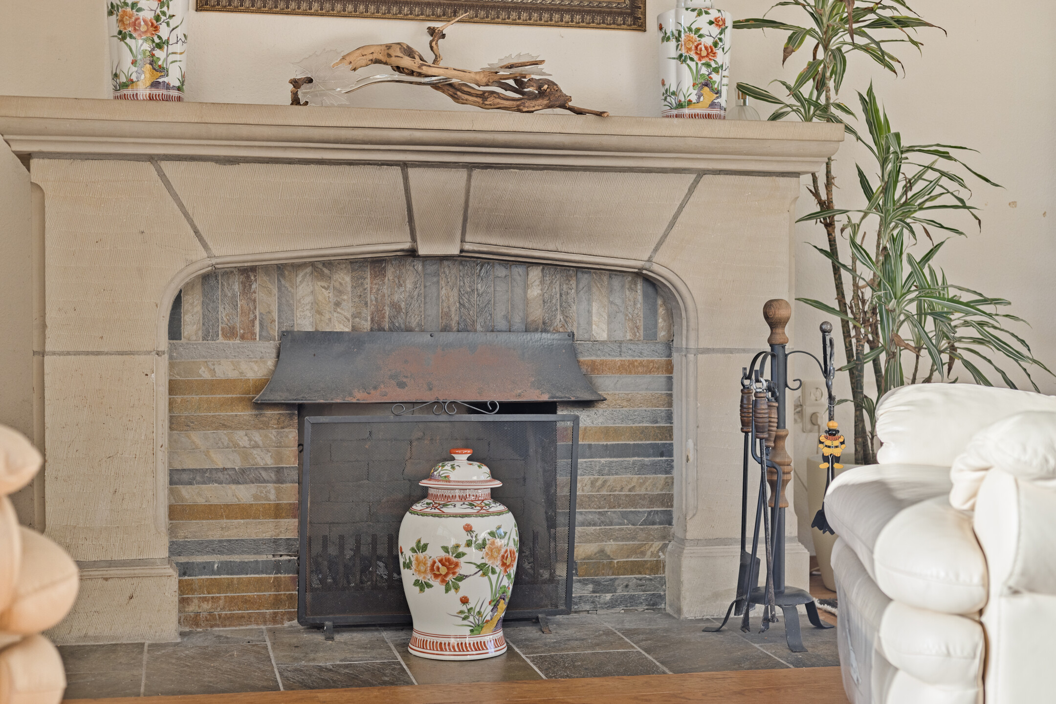Covered entrance into a hallway with a striking double staircase and access to the guest toilet. From here, step into the L-shaped living and dining room with a cozy fireplace and classic mantel. The separate kitchen is fully equipped with built-in appliances, including a refrigerator, oven, microwave, dishwasher, and 4-zone induction hob with extractor. Three versatile rooms—currently used as bedrooms—are also accessible from the hall, two of which feature fitted wardrobes and en-suite bathrooms. Two of the bedrooms offer direct access to the beautifully landscaped rear garden, complete with a large partially covered terrace, lily pond, and lush greenery including rare and exotic plants.