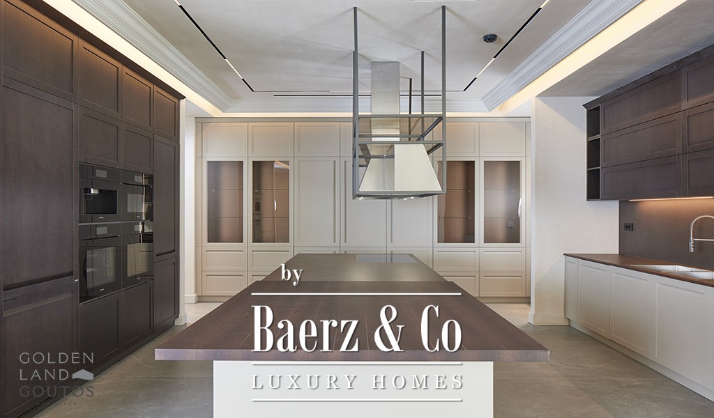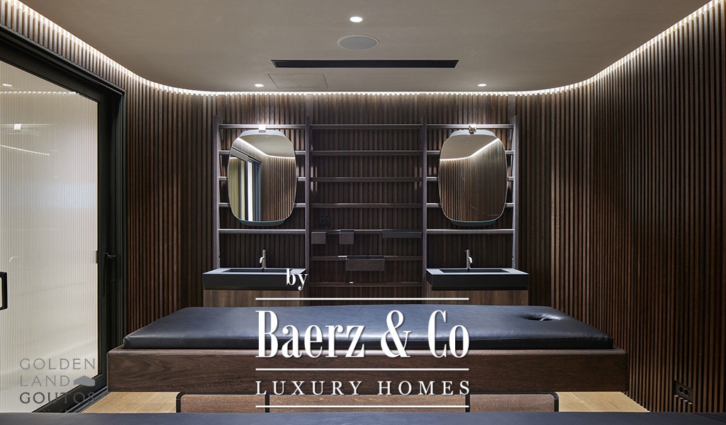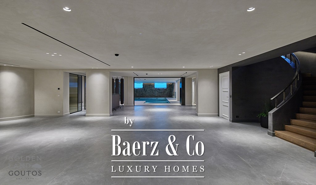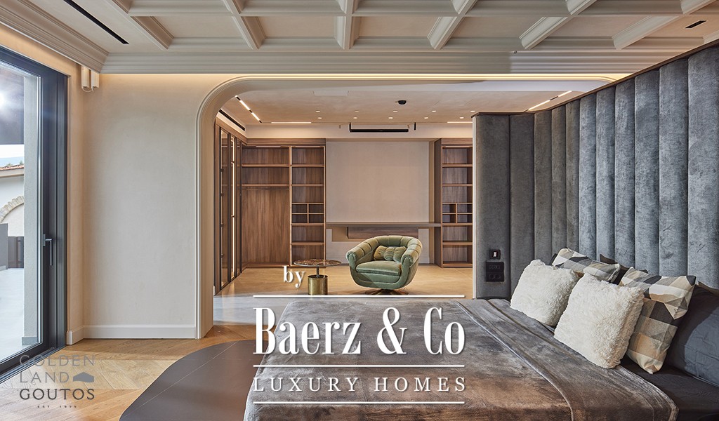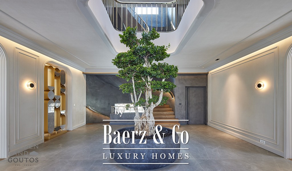 Entering the villa, expansive reception spaces unfold, with formal and informal areas, a fully fitted kitchen, and an open family room balanced by guest facilities. The principal suite offers two dressing rooms and a private balcony, complemented by four addition ensuite bedrooms on the same level. Further accommodation includes a guest suite, maid’s quarters, and separate provisioning for a security guard, ensuring discretion and comfort throughout.