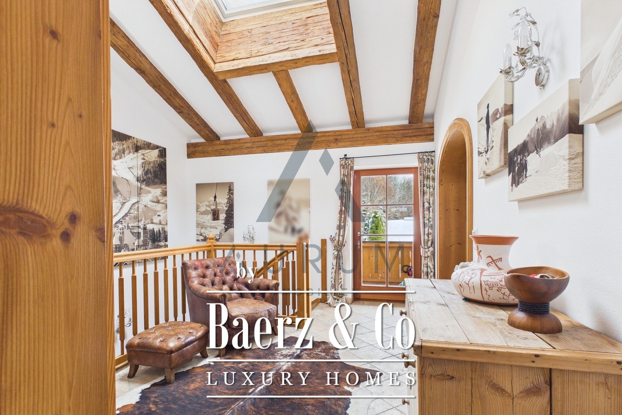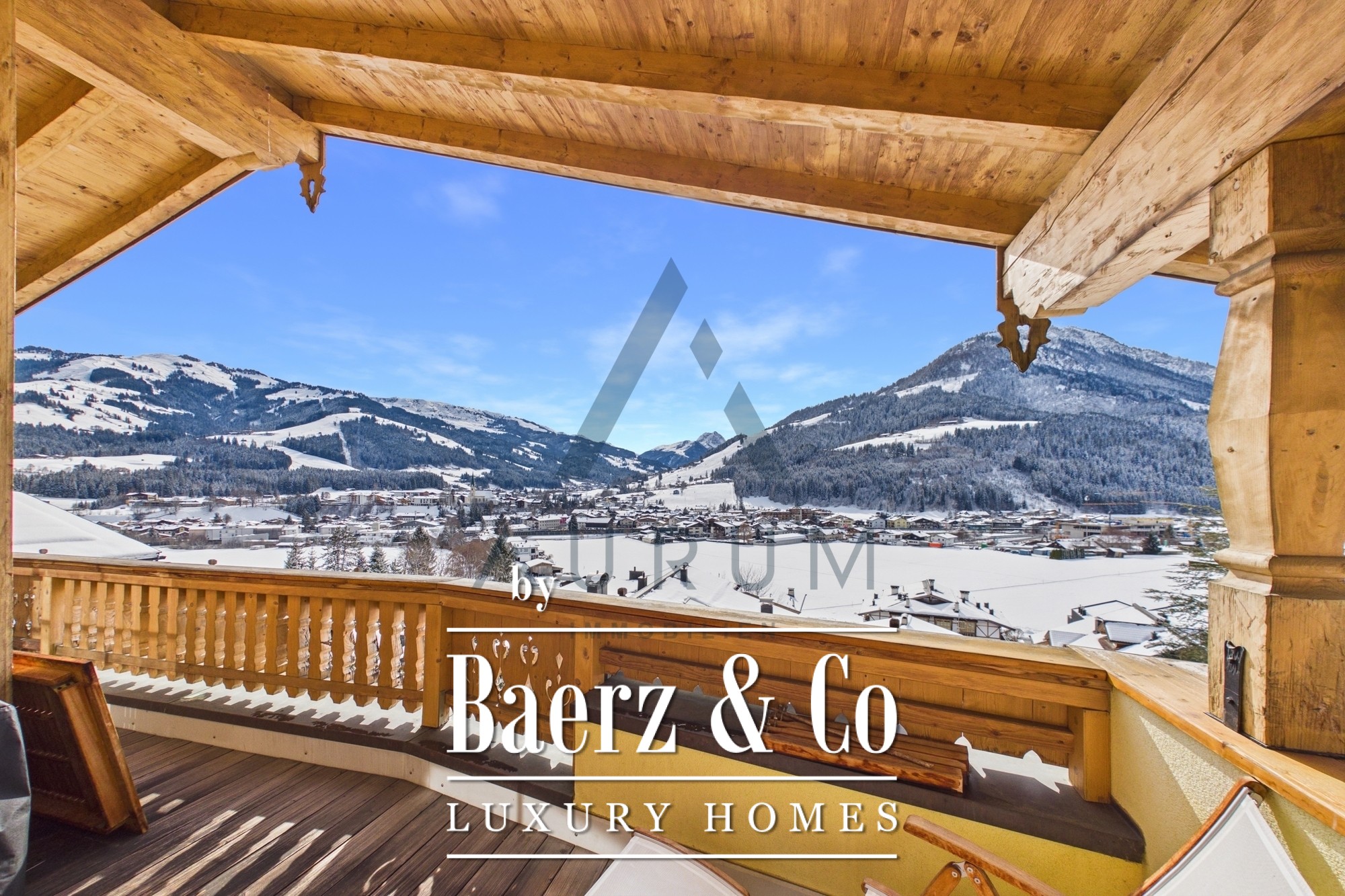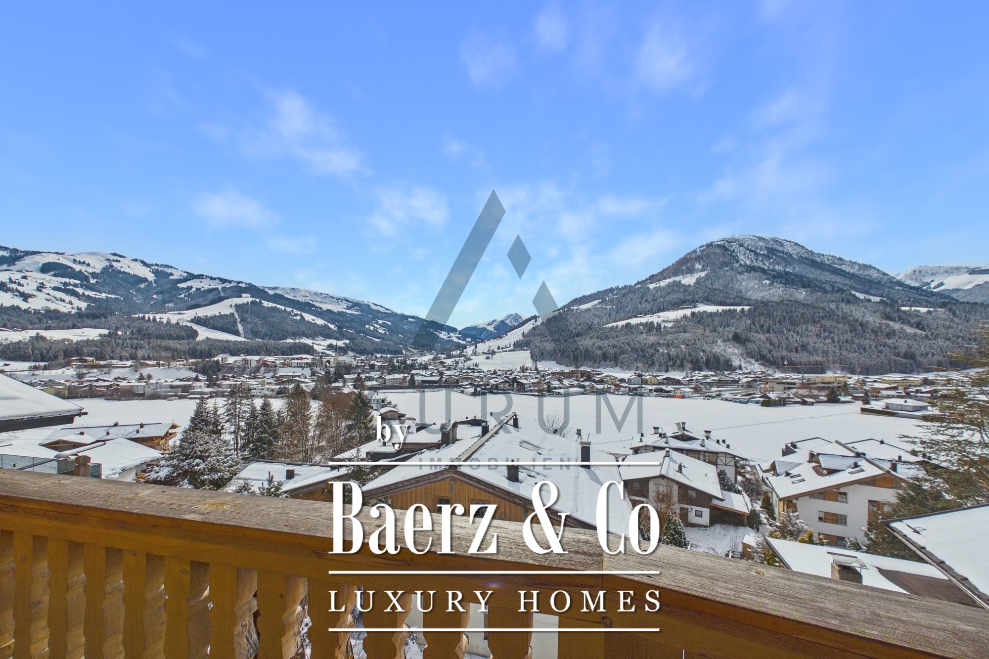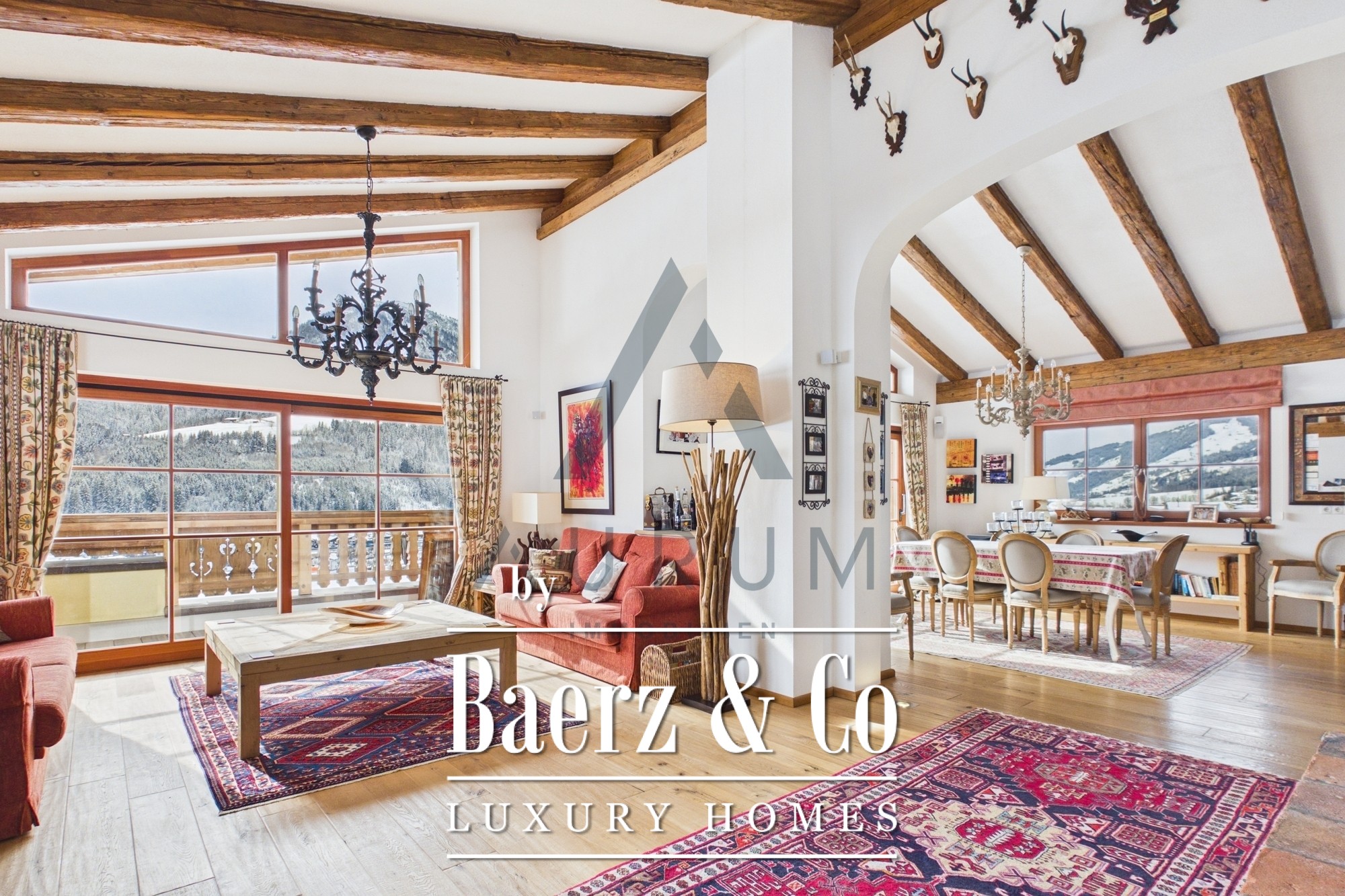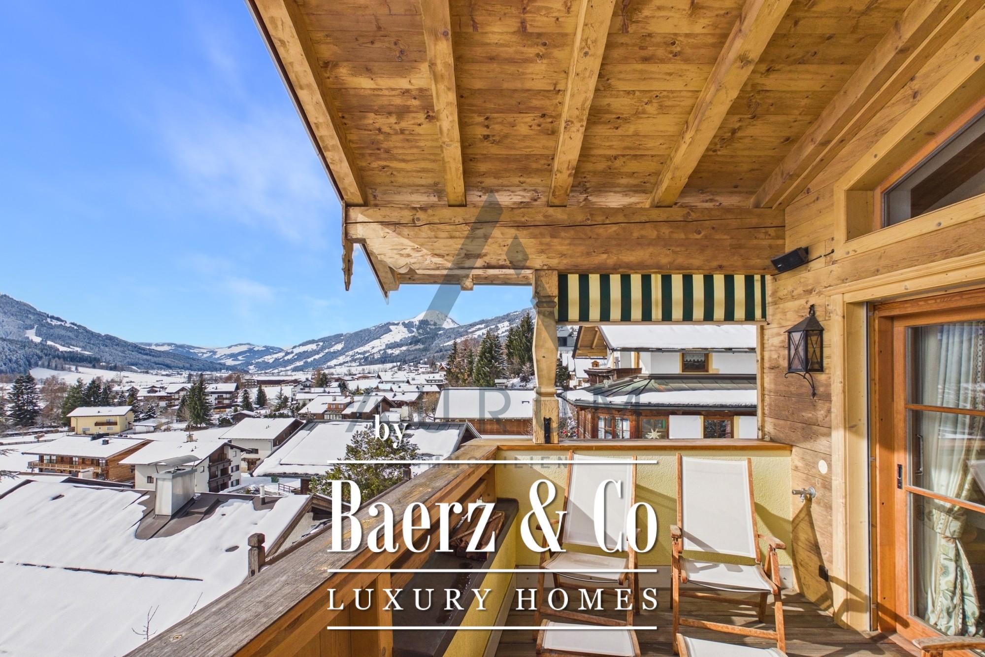 Penthouse maisonette Kirchberg in Tirol stands as a rare alpine residence, offering 197 m² of thoughtfully arranged living space over three floors in a discreet, sunlit position just above the village center. This penthouse maisonette welcomes you with a traditionally inspired, light-filled top floor. A living and dining room, accented by antique wood trusses and an open fireplace, flows into a country-style kitchen and out to a balcony that grants sweeping views of the Großer Rettenstein and Brixental valley. Floor-to-ceiling windows keep the alpine light central, while underfloor heating and solid wood floors create an atmosphere of enduring warmth.
