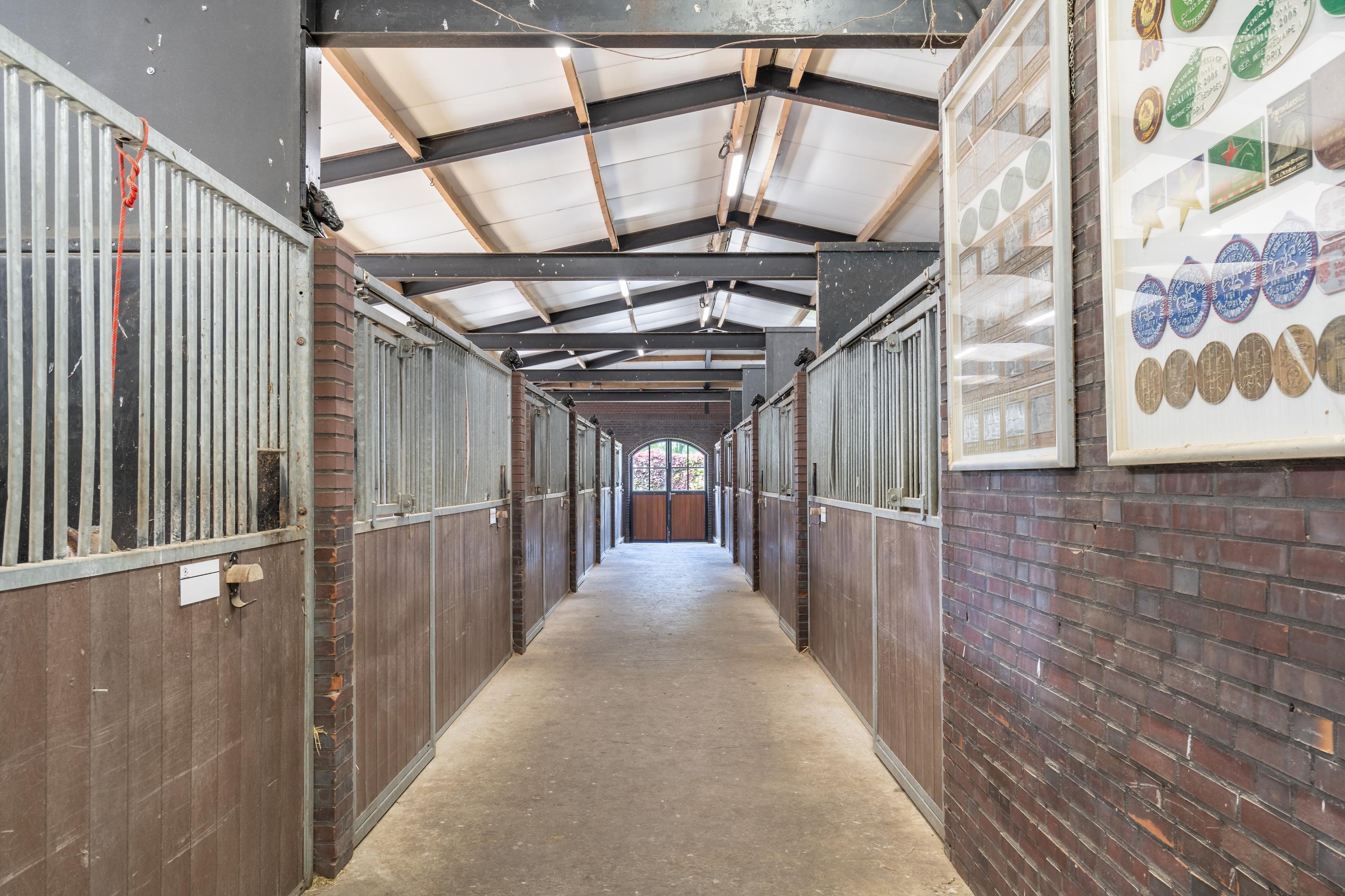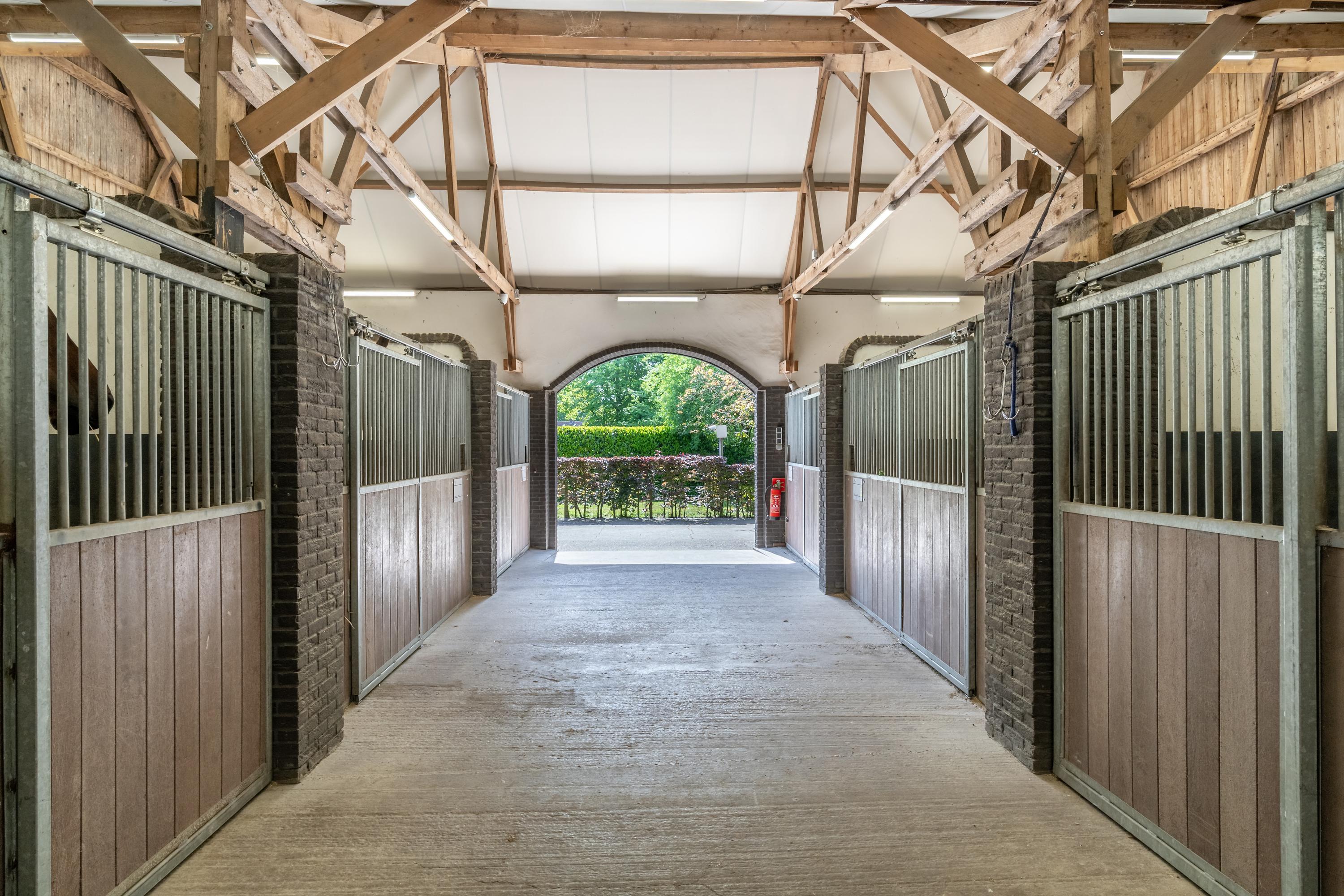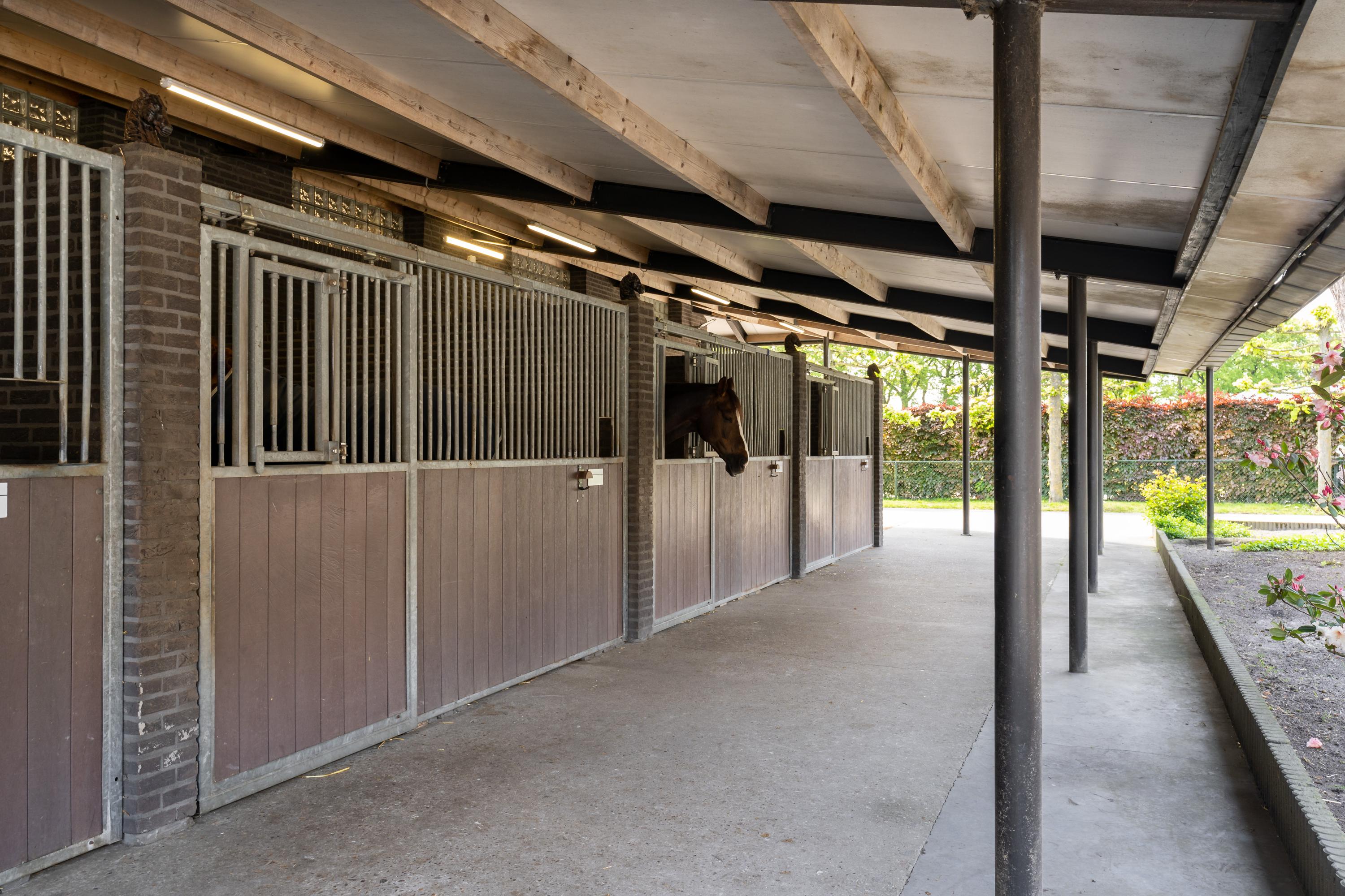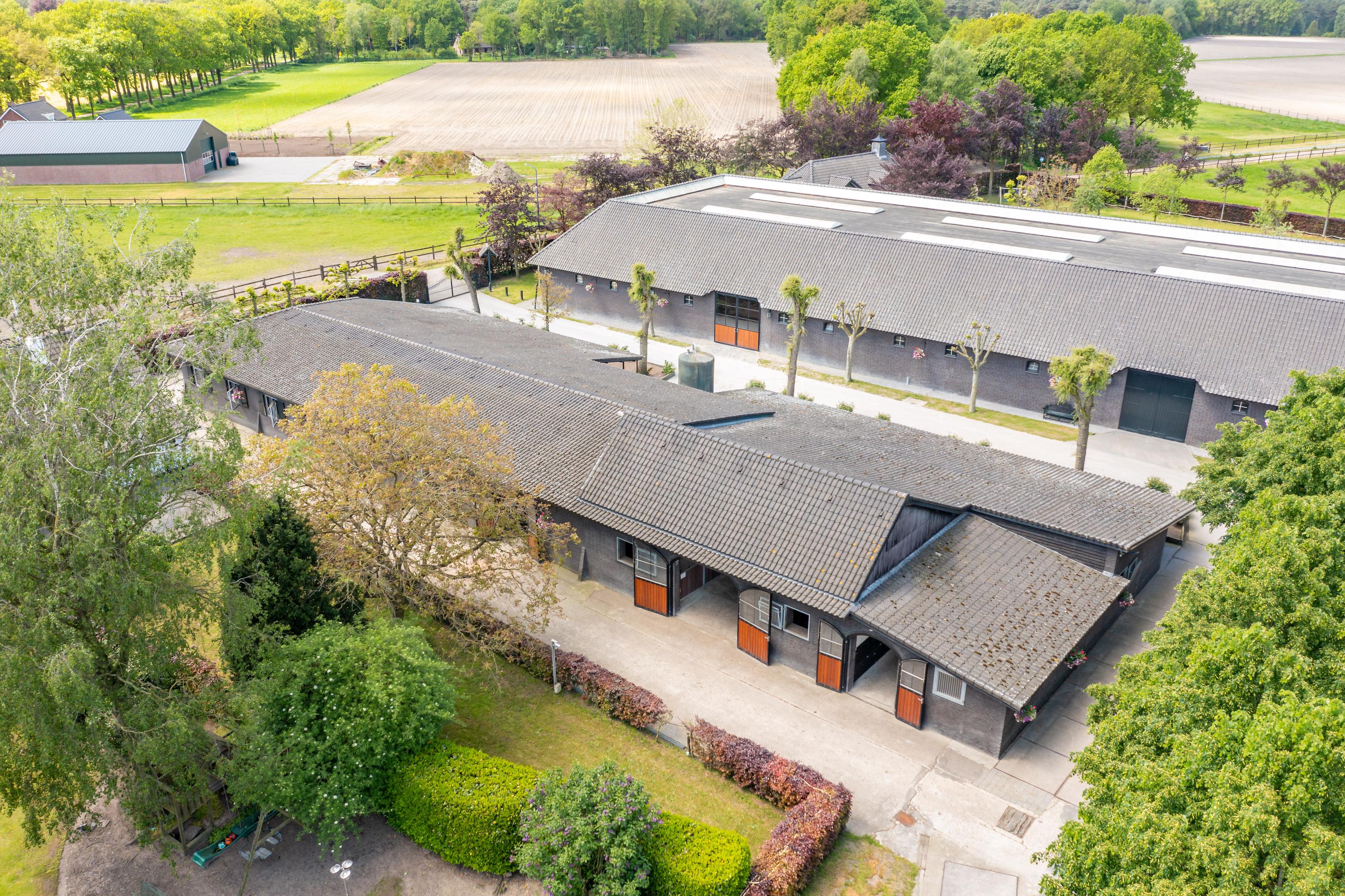 This beautiful, complete equestrian accommodation offers plenty of possibilities thanks to the presence of a detached house and living areas, a total of 33 horse stalls divided over various units, a spacious indoor and outdoor arena (approx. 22x62 metres), a storage shed with rearing stalls and large pastures. In addition, the property is situated in a beautiful location with plenty of privacy and on the edge of the Leenderbos forest with excellent riding opportunities!