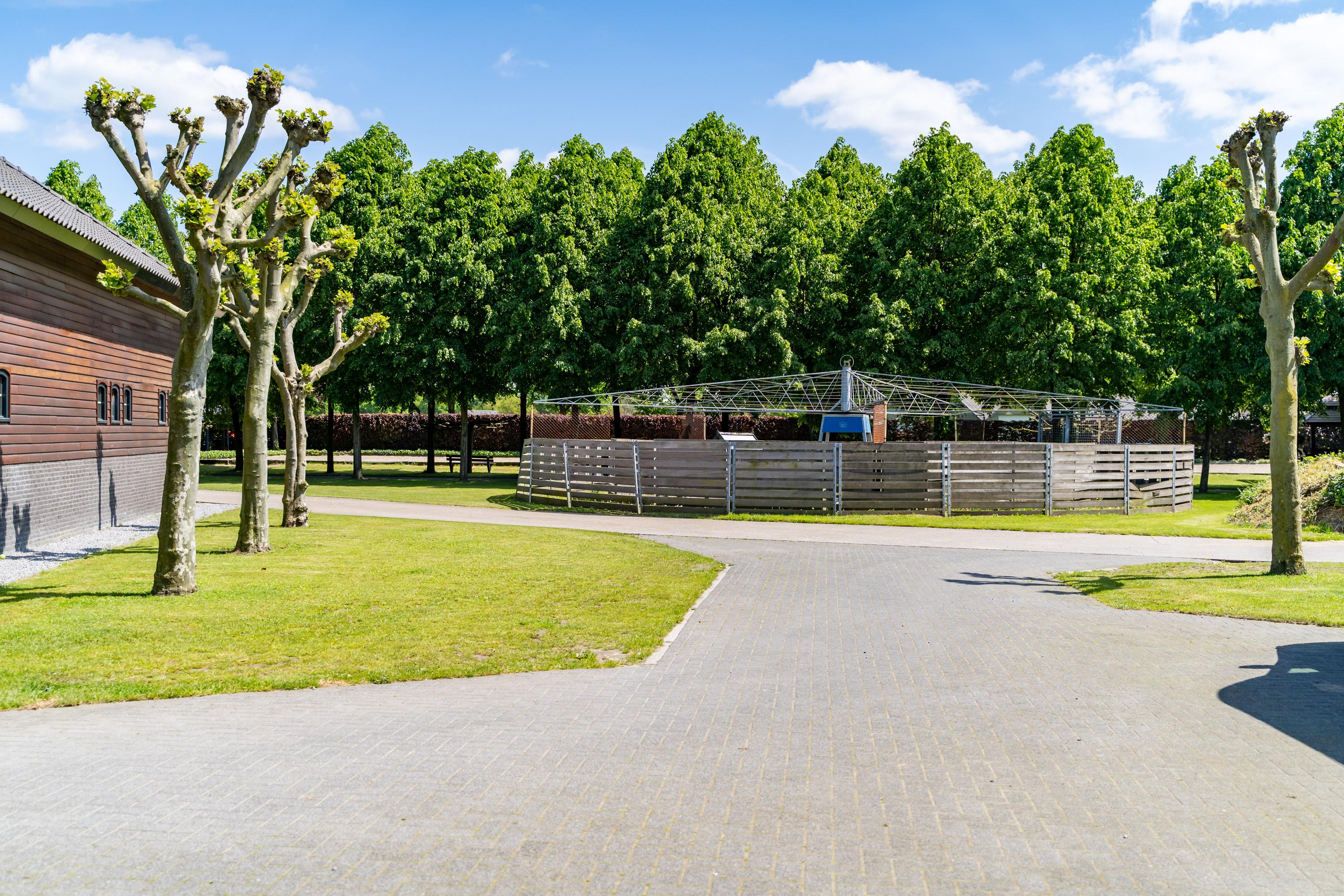 There are three paddocks, which have a sand floor and a wooden fence. The paddocks are also accessible via a rear entrance to the plot. The surrounding meadows are also fenced with wood.