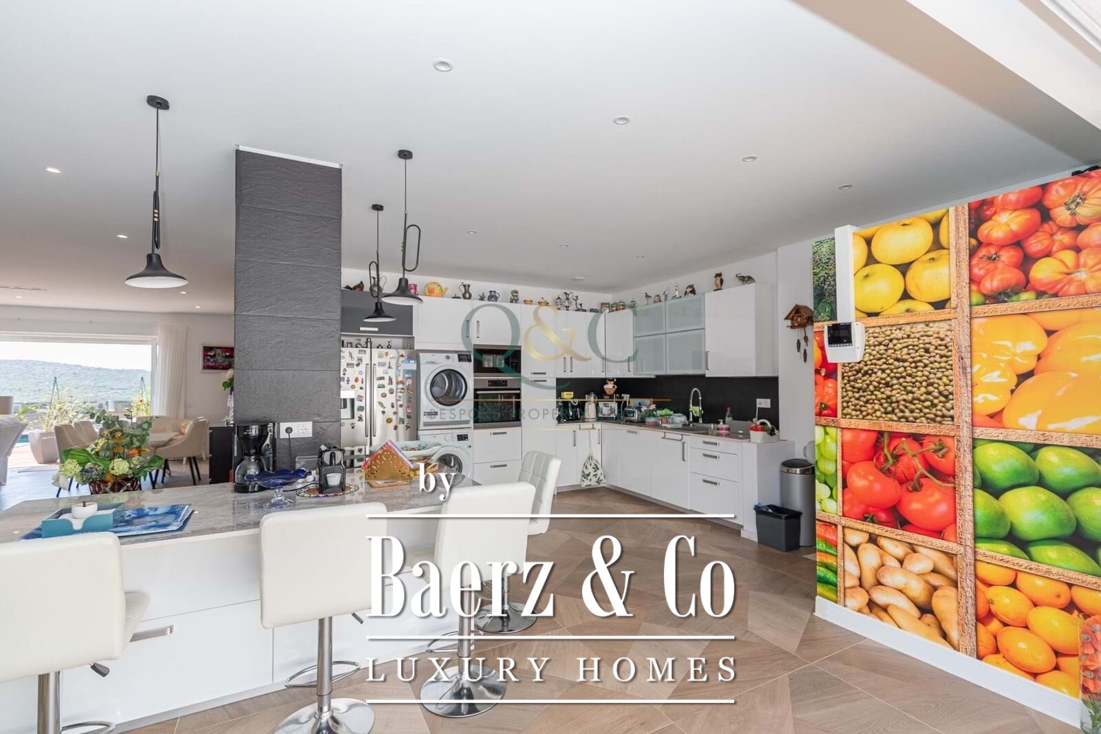 Inside, the bright living room features expansive sliding doors that fully retreat, integrating the main lounge with the pool terrace. A wood-burning stove suggests a subtle warmth during cooler evenings. The open-plan kitchen flows around a central island and is equipped with a built-in extractor, opening to another terrace and direct access to the garage. Subtly zoned spaces include two en-suite bedrooms, both with fitted wardrobes, and a versatile third room currently used as an office or bedroom. A dedicated dressing room offers potential for a private study.