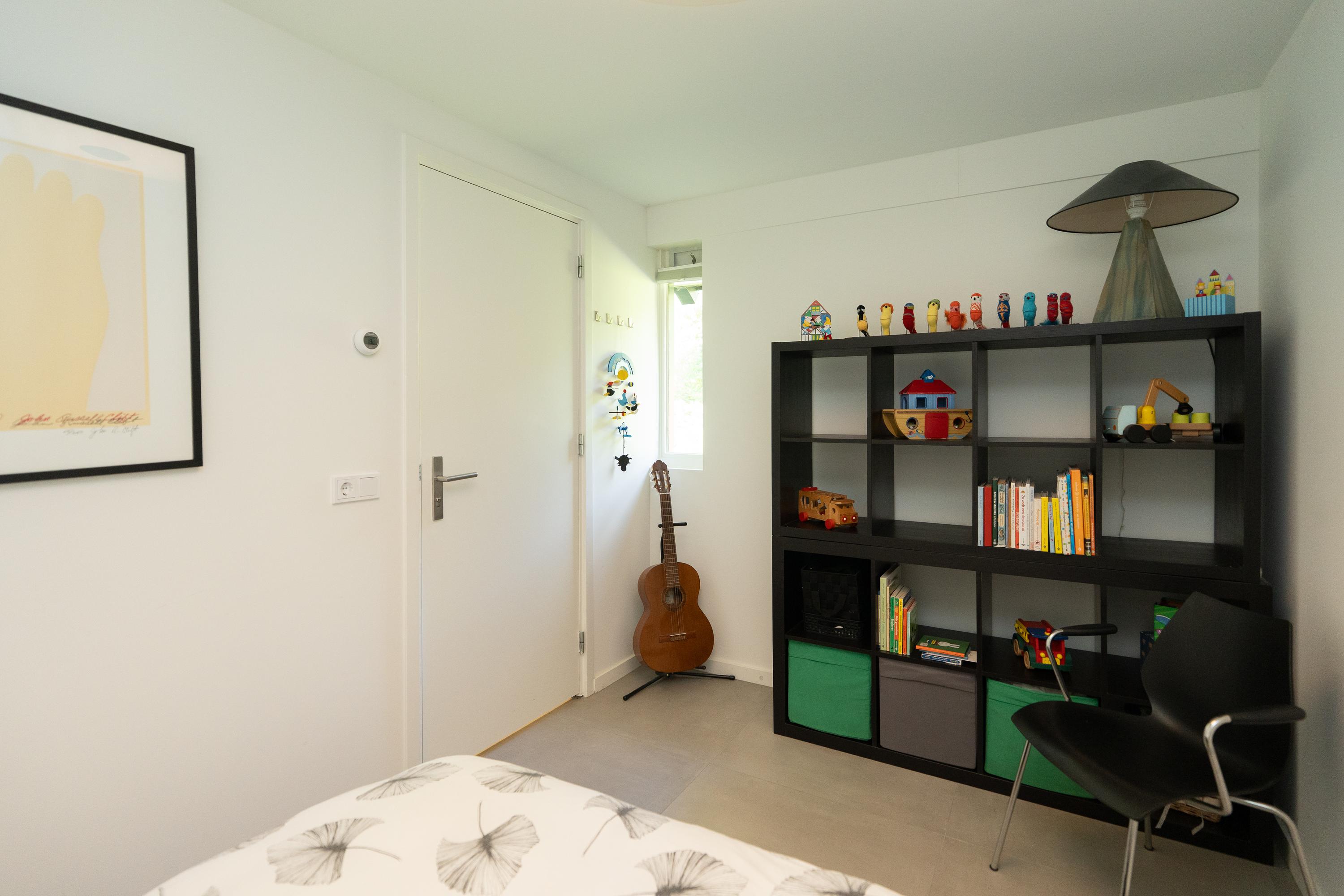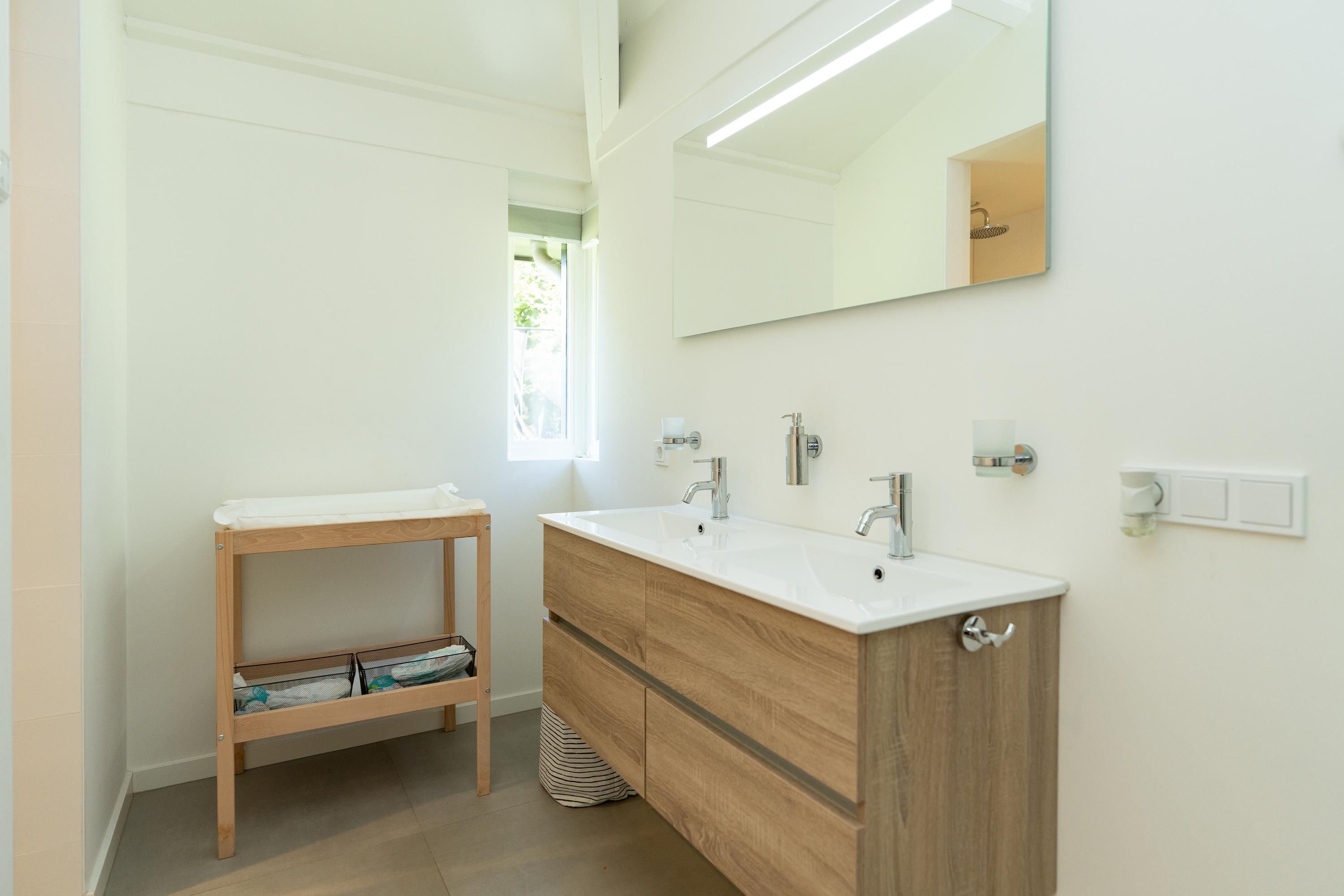 Entrance hall, spacious hall that immediately emphasises the spacious character of the house. The hall contains the meter cupboard, loft and the first toilet with washbasin. A spacious living room with high ceiling, where the many windows on all sides provide beautiful light and an open atmosphere. There are sliding doors to the front and back gardens at both the front and rear. There is also a spacious indoor storage room under the stairs and the staircase itself is beautifully concealed. Modern open kitchen with a large cooking island. The tall cabinets are beautifully concealed in the wall and the kitchen is equipped with various luxury built-in appliances. The utility room is located at the front of the house and has a kitchen unit, heat pump and boiler, and an extra outside door.