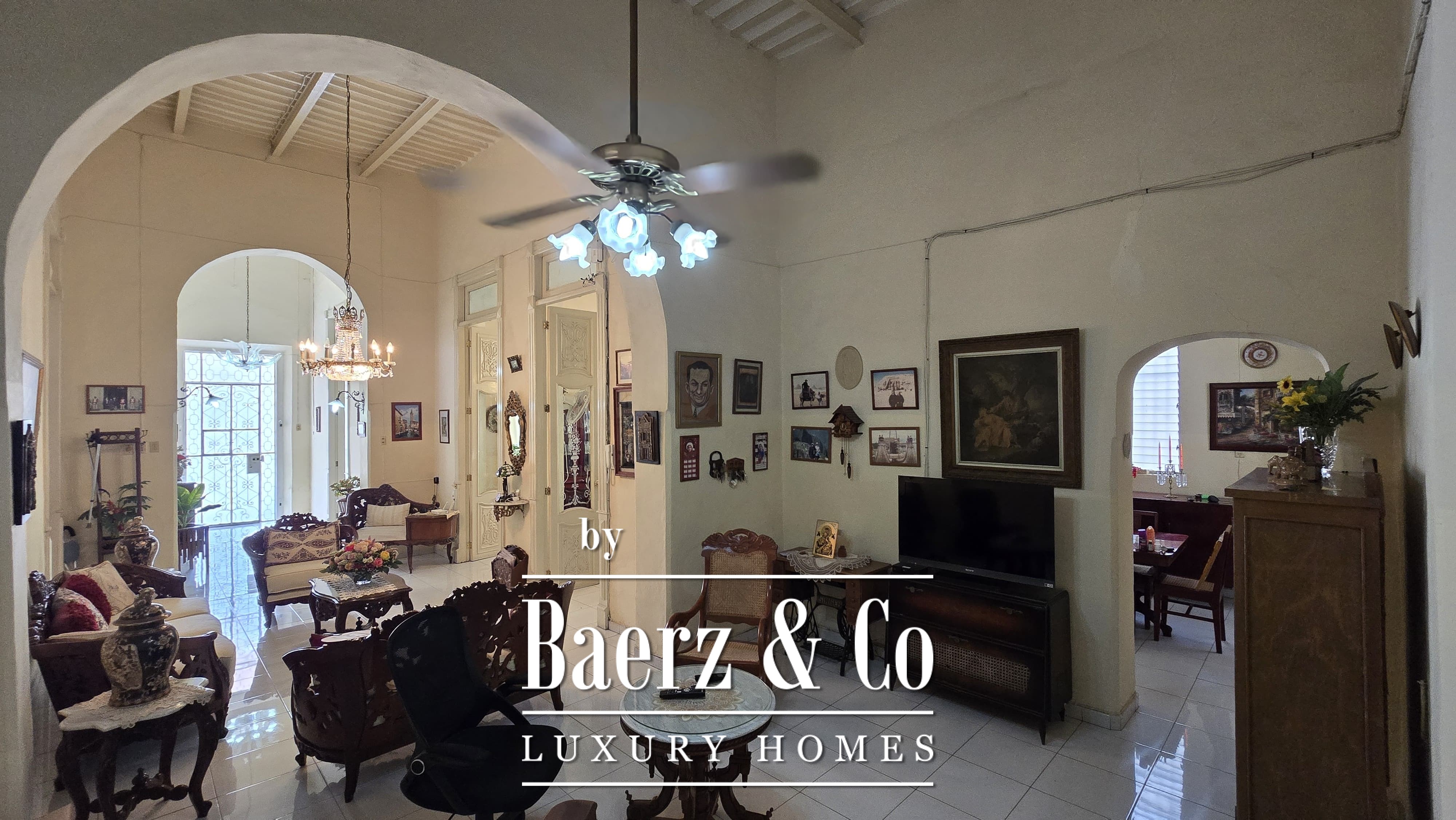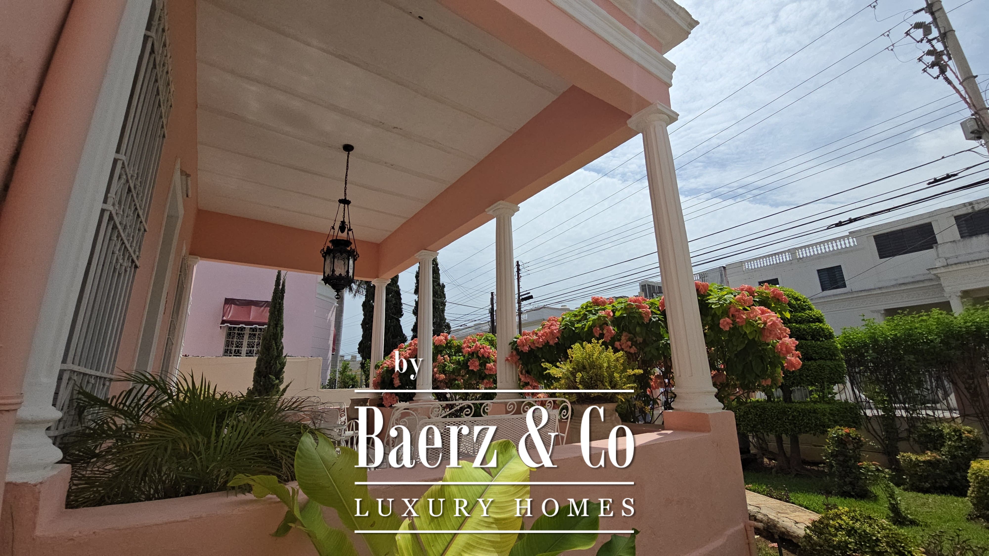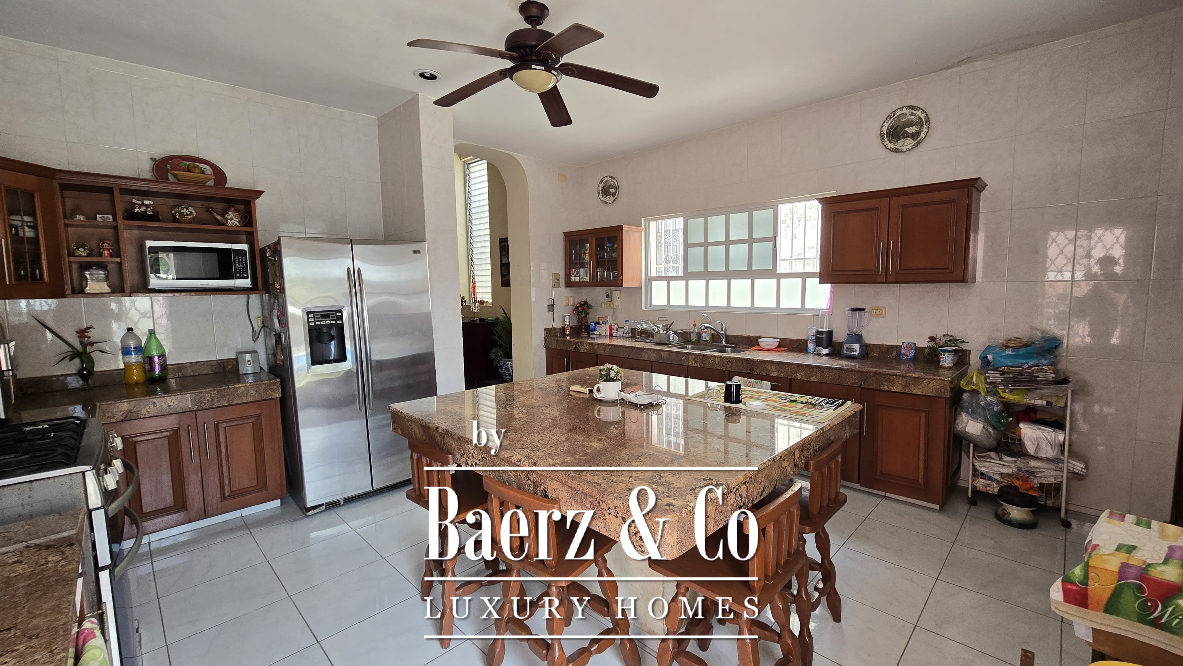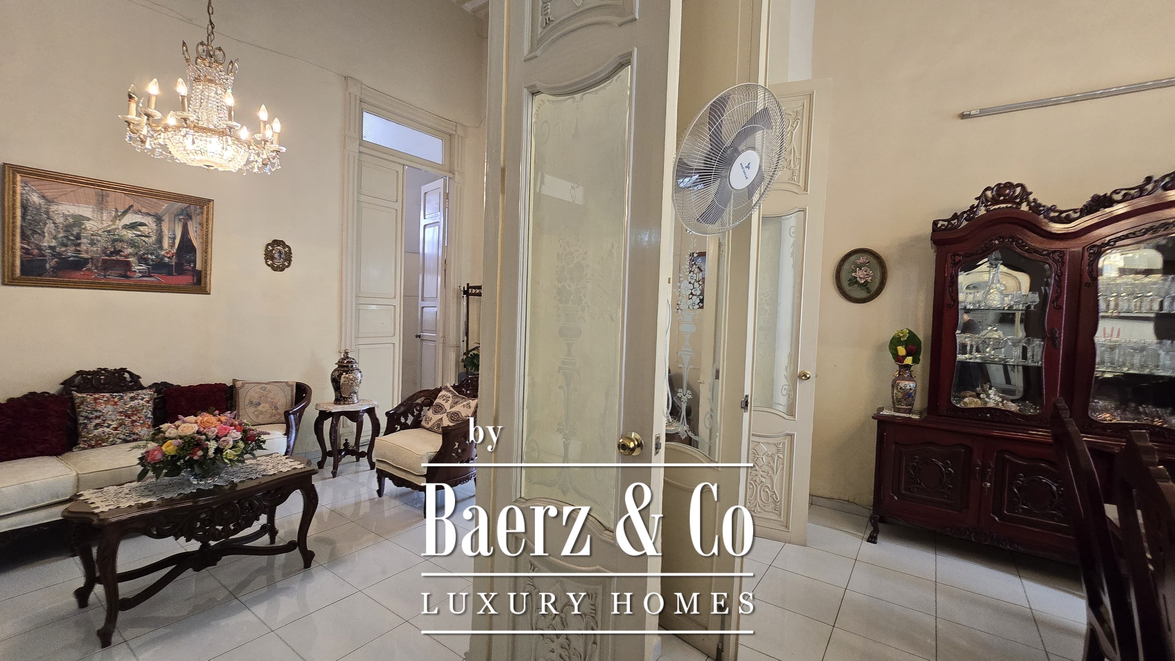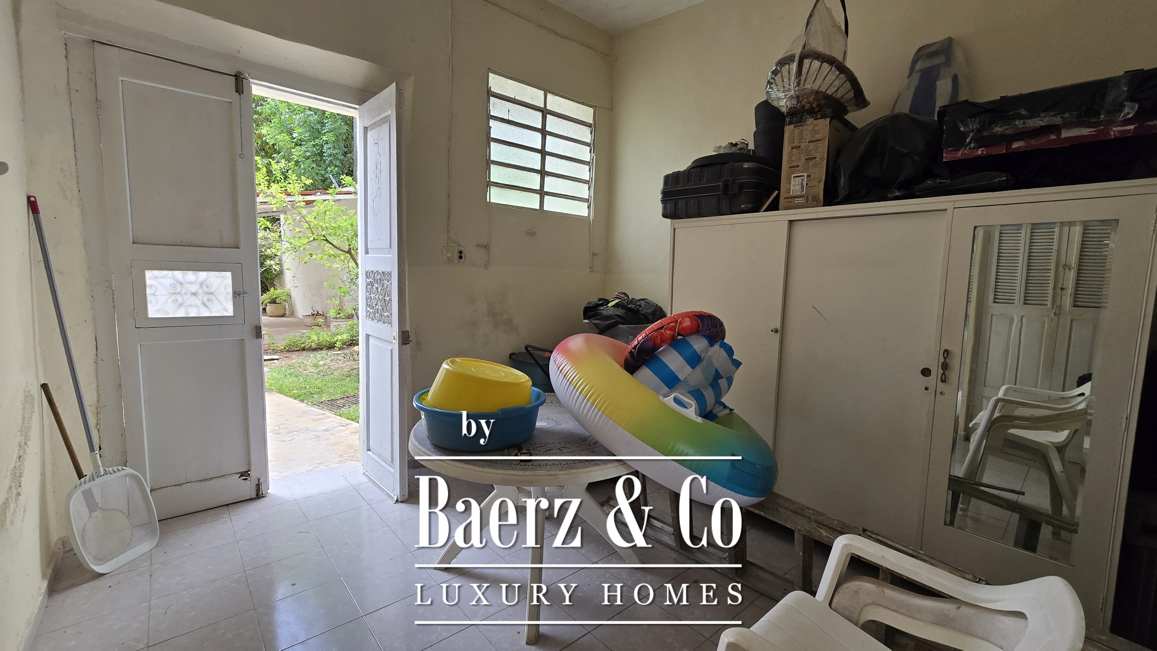 Beyond its grand façade, the residence offers four bedrooms, each with a dedicated bathroom, with the main suite enjoying a walk-in closet. The layout is both classic and accommodating, with a sequence of living and dining rooms, a granite-fitted kitchen, two family rooms, a studio, service quarters with bath, and ample storage and laundry spaces. Wide foyers and a generous porch invite openness, while the private pool and covered garage for four cars enhance everyday luxury. The property integrates contemporary comforts such as hydro system, inverse osmosis, electric gate, and essential connectivity.