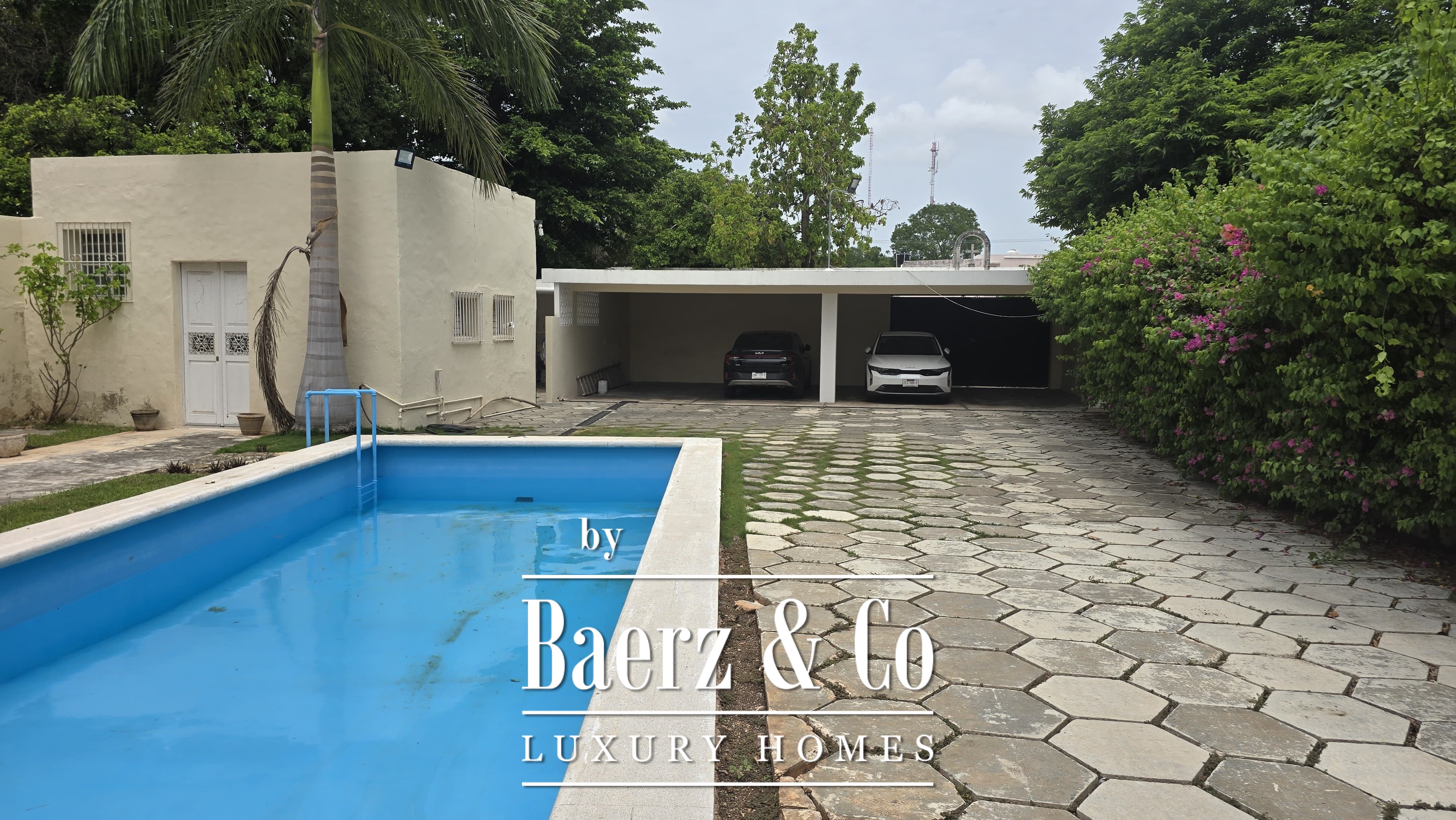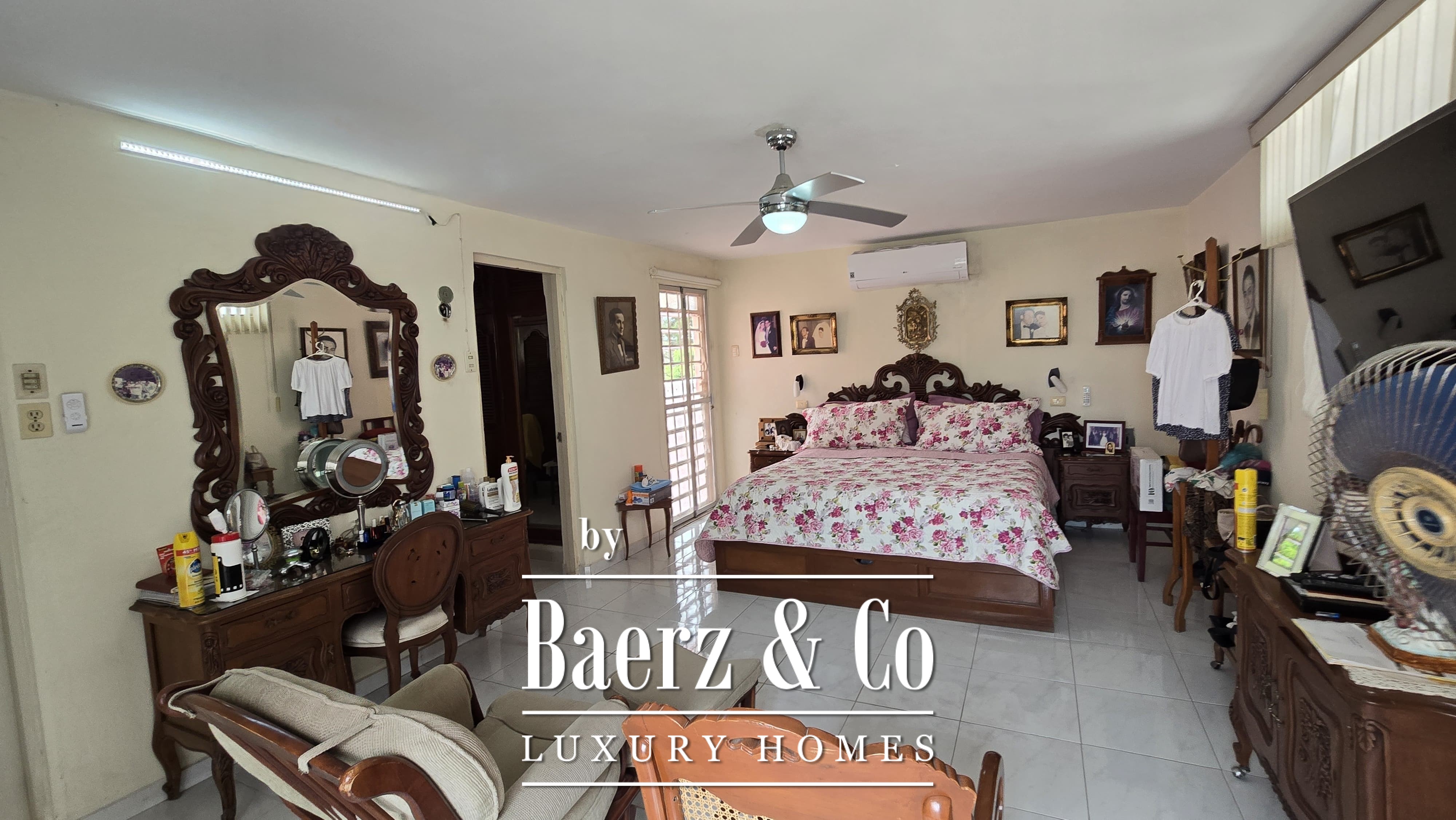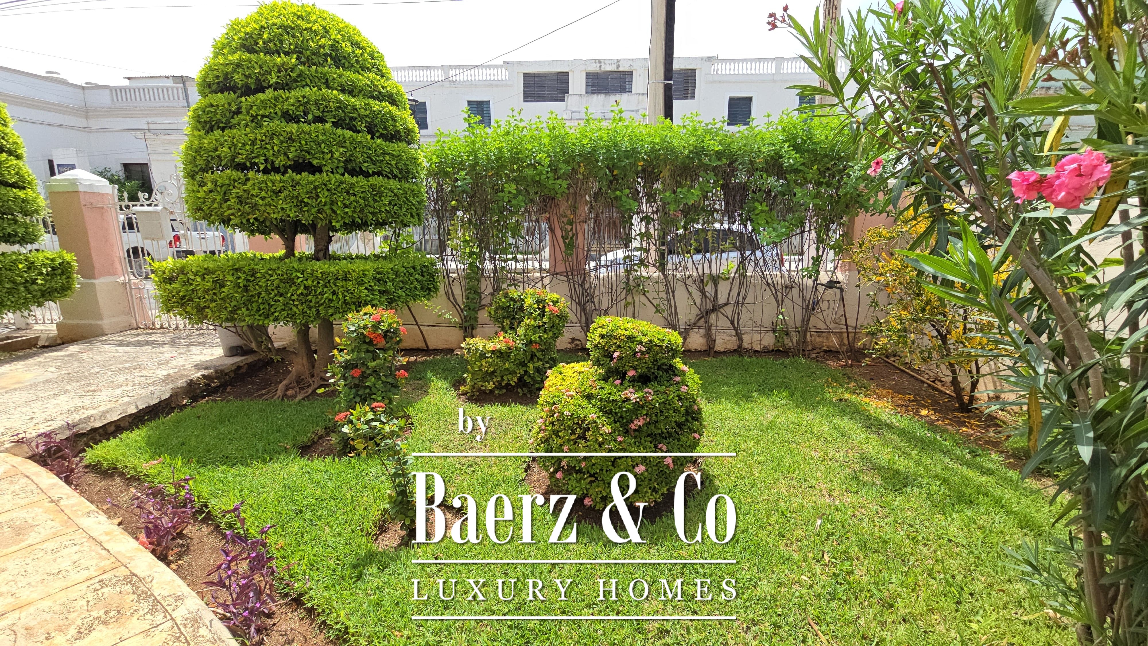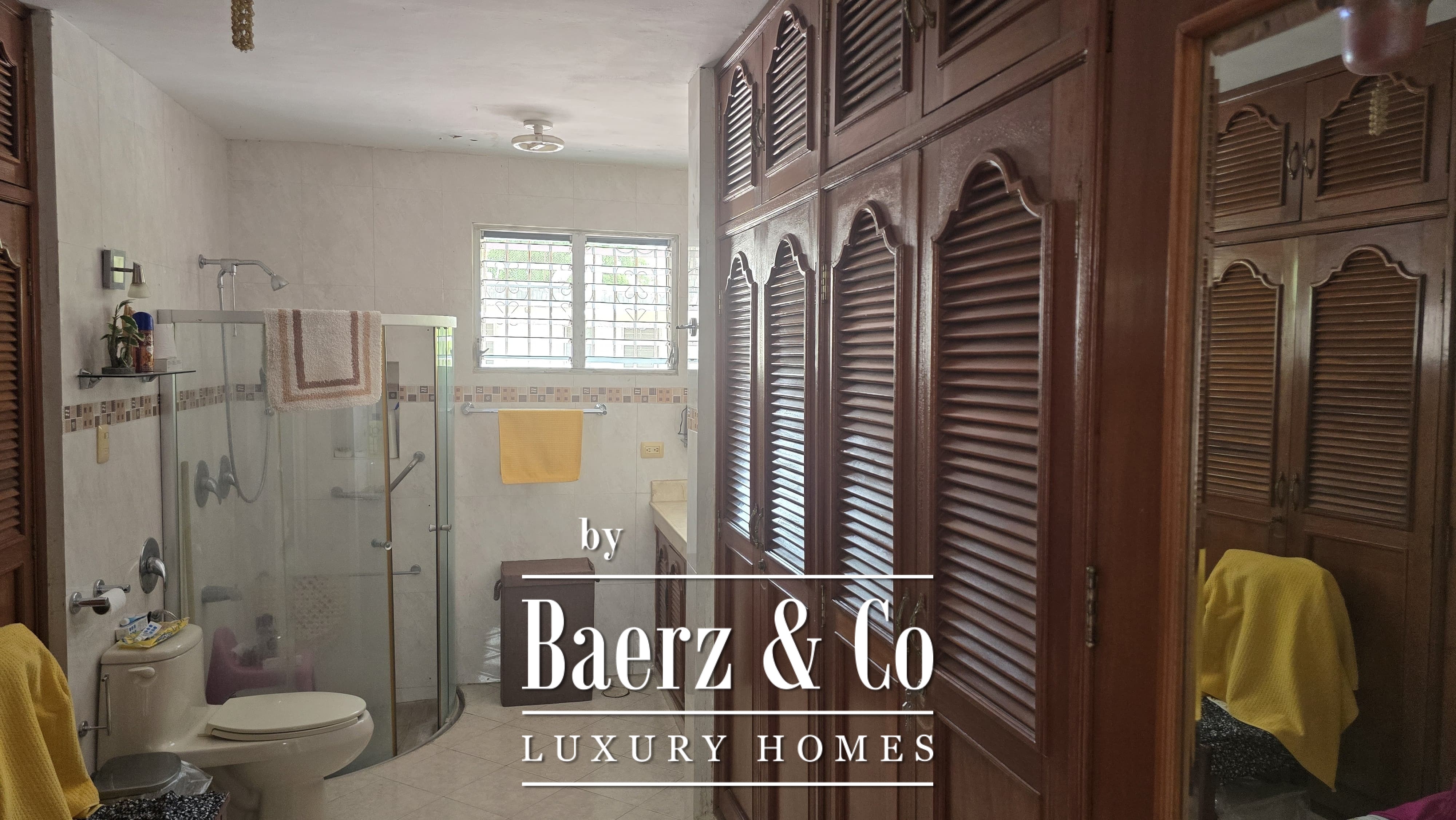 Beyond its grand façade, the residence offers four bedrooms, each with a dedicated bathroom, with the main suite enjoying a walk-in closet. The layout is both classic and accommodating, with a sequence of living and dining rooms, a granite-fitted kitchen, two family rooms, a studio, service quarters with bath, and ample storage and laundry spaces. Wide foyers and a generous porch invite openness, while the private pool and covered garage for four cars enhance everyday luxury. The property integrates contemporary comforts such as hydro system, inverse osmosis, electric gate, and essential connectivity.