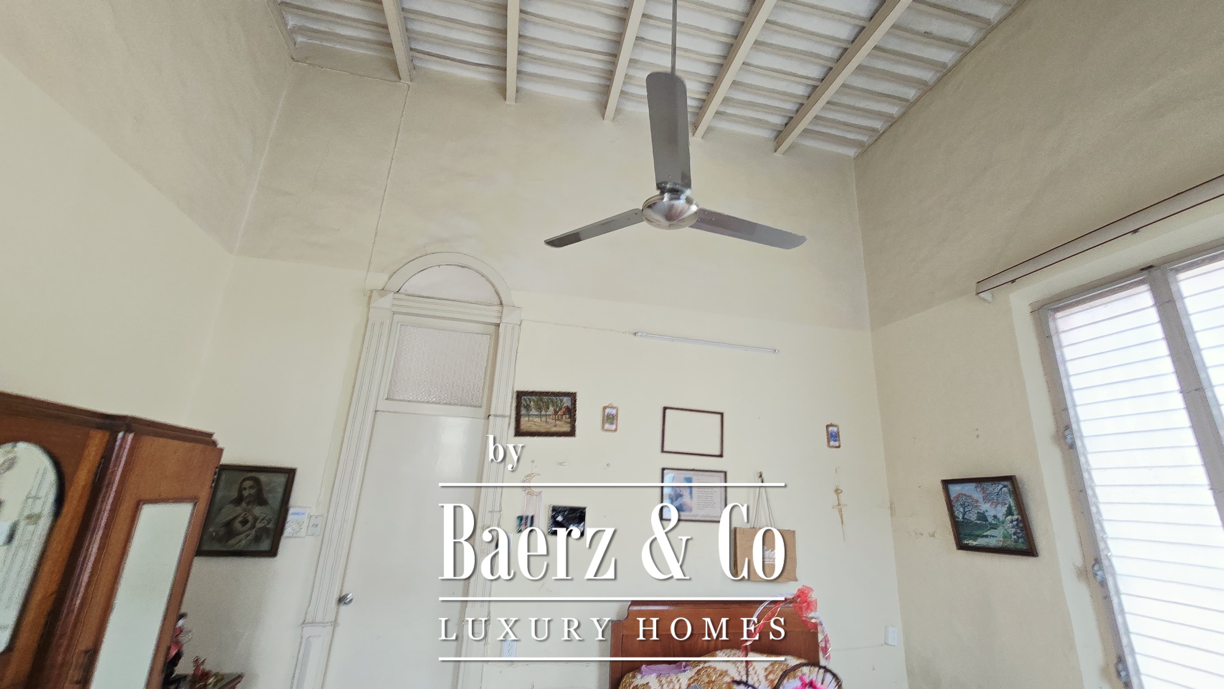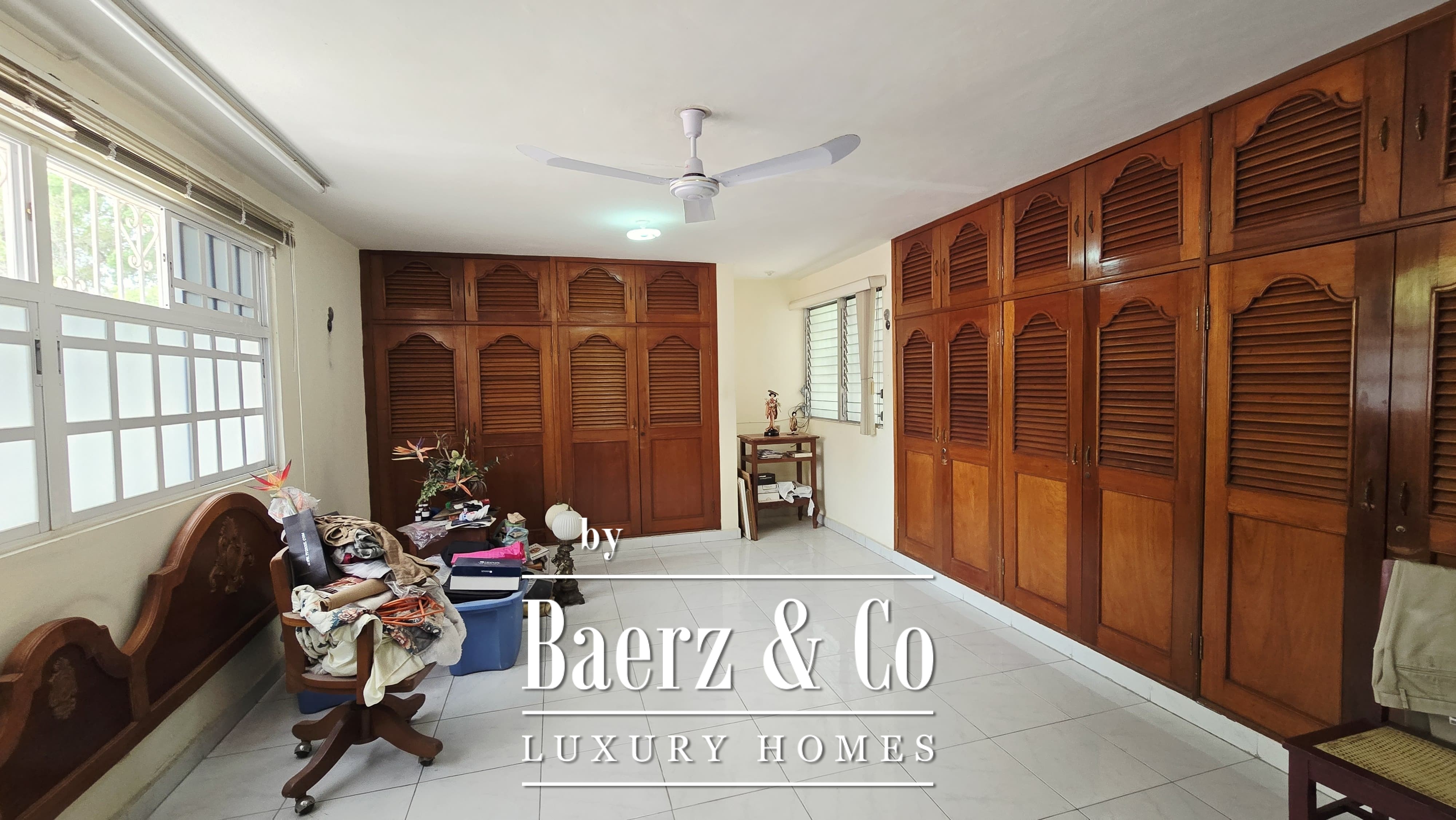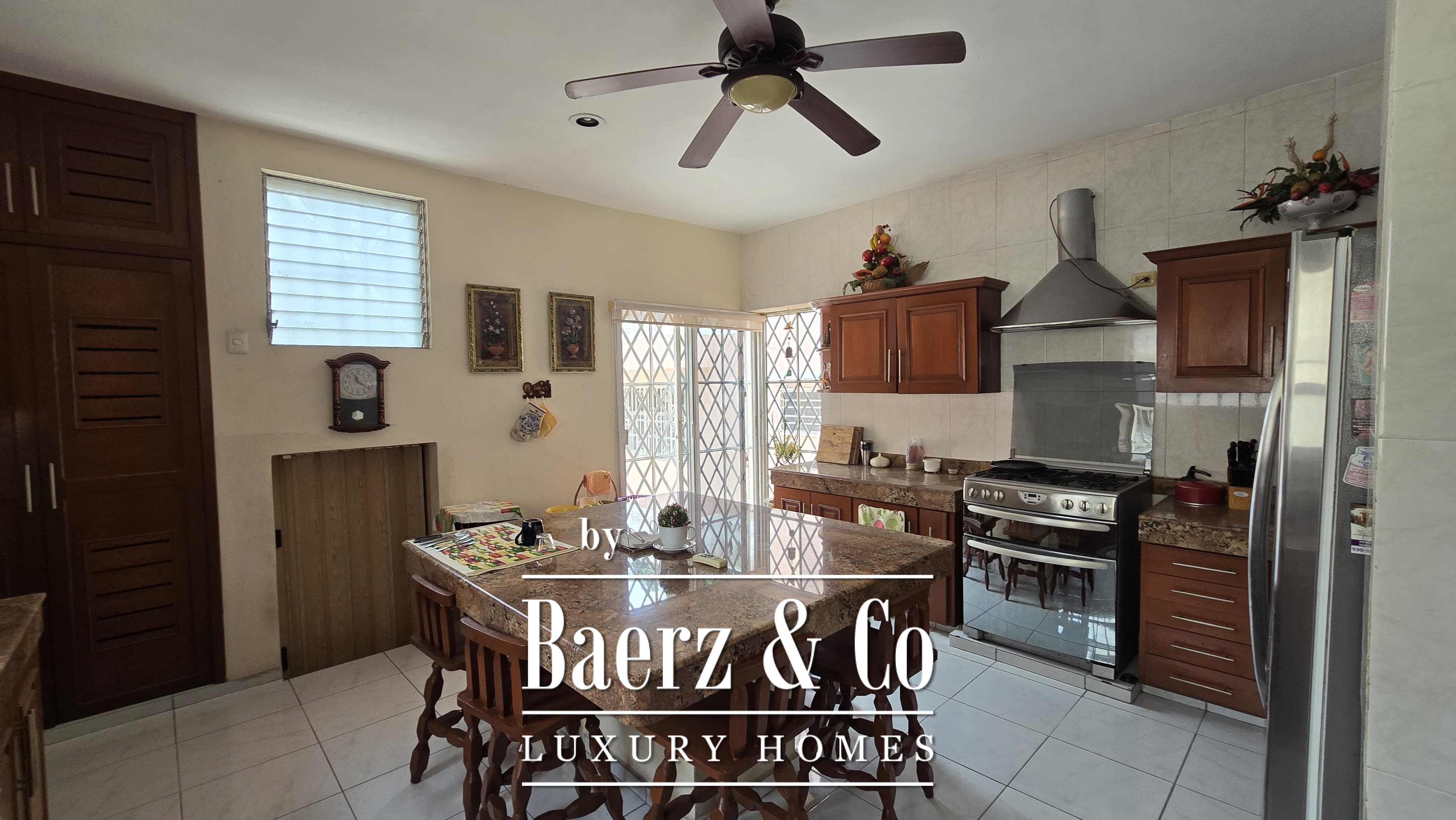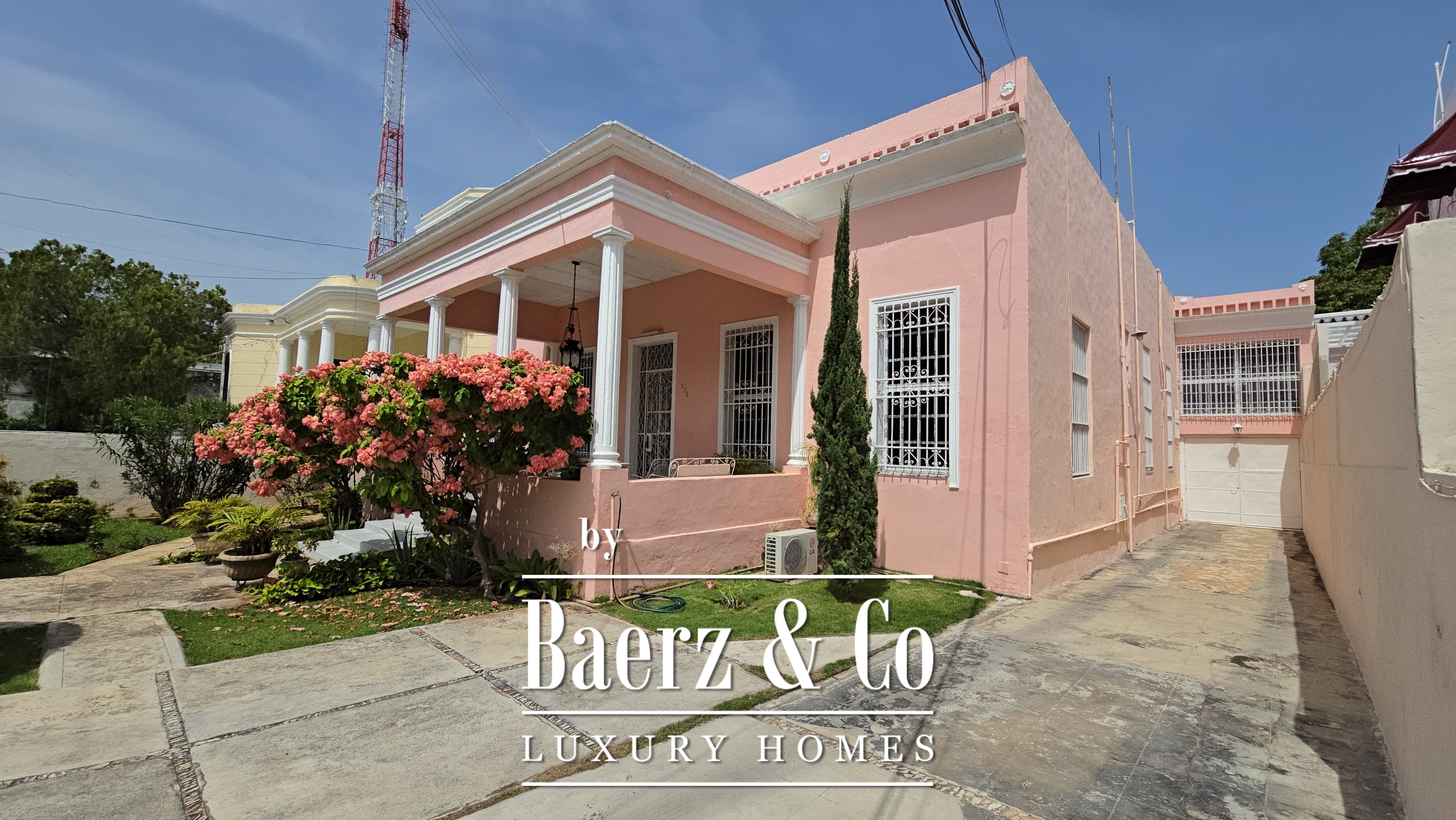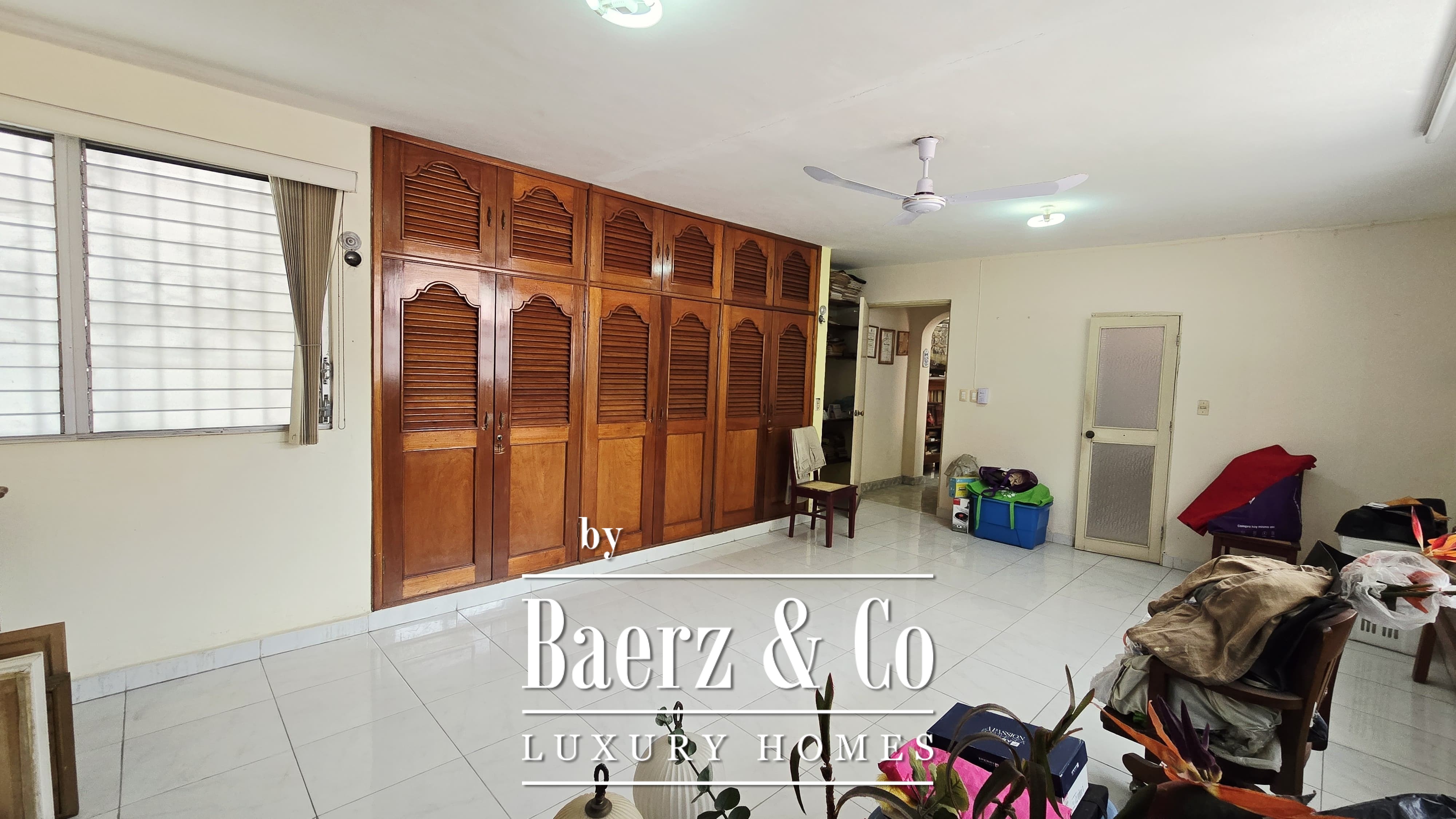 Beyond its grand façade, the residence offers four bedrooms, each with a dedicated bathroom, with the main suite enjoying a walk-in closet. The layout is both classic and accommodating, with a sequence of living and dining rooms, a granite-fitted kitchen, two family rooms, a studio, service quarters with bath, and ample storage and laundry spaces. Wide foyers and a generous porch invite openness, while the private pool and covered garage for four cars enhance everyday luxury. The property integrates contemporary comforts such as hydro system, inverse osmosis, electric gate, and essential connectivity.