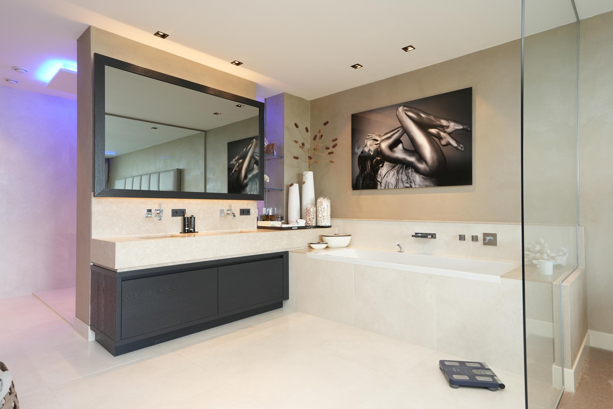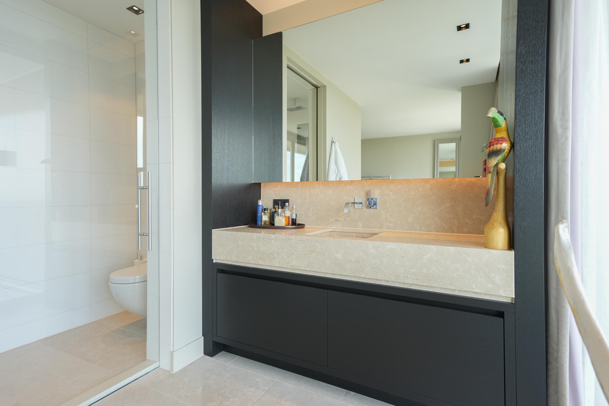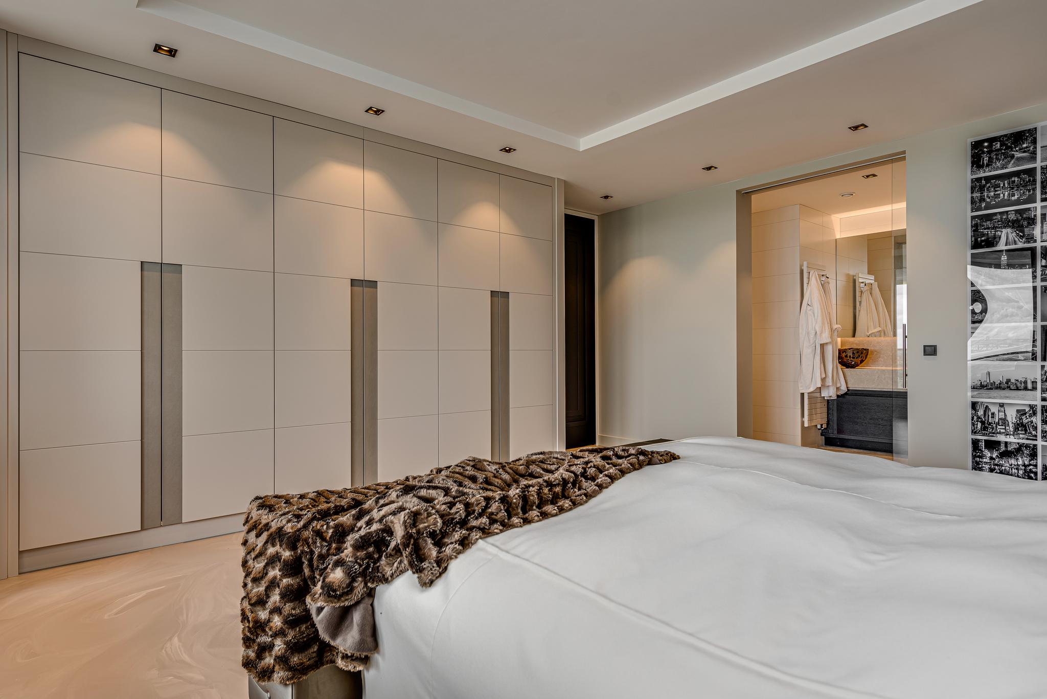 The interior design was done by high-end interior design specialist Pieter Laureys in a global, very luxurious and timeless style. In terms of color and design, every detail is perfectly aligned; this is clearly reflected in the extremely luxurious kitchen/lounge and the seamless wall unit with fitted appliances equipped with home automation technology.