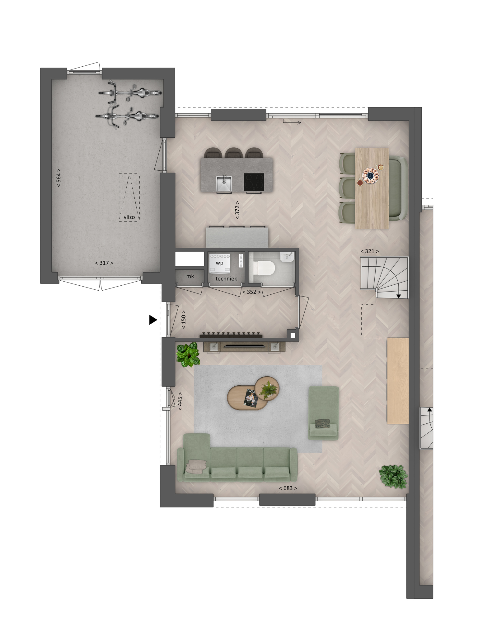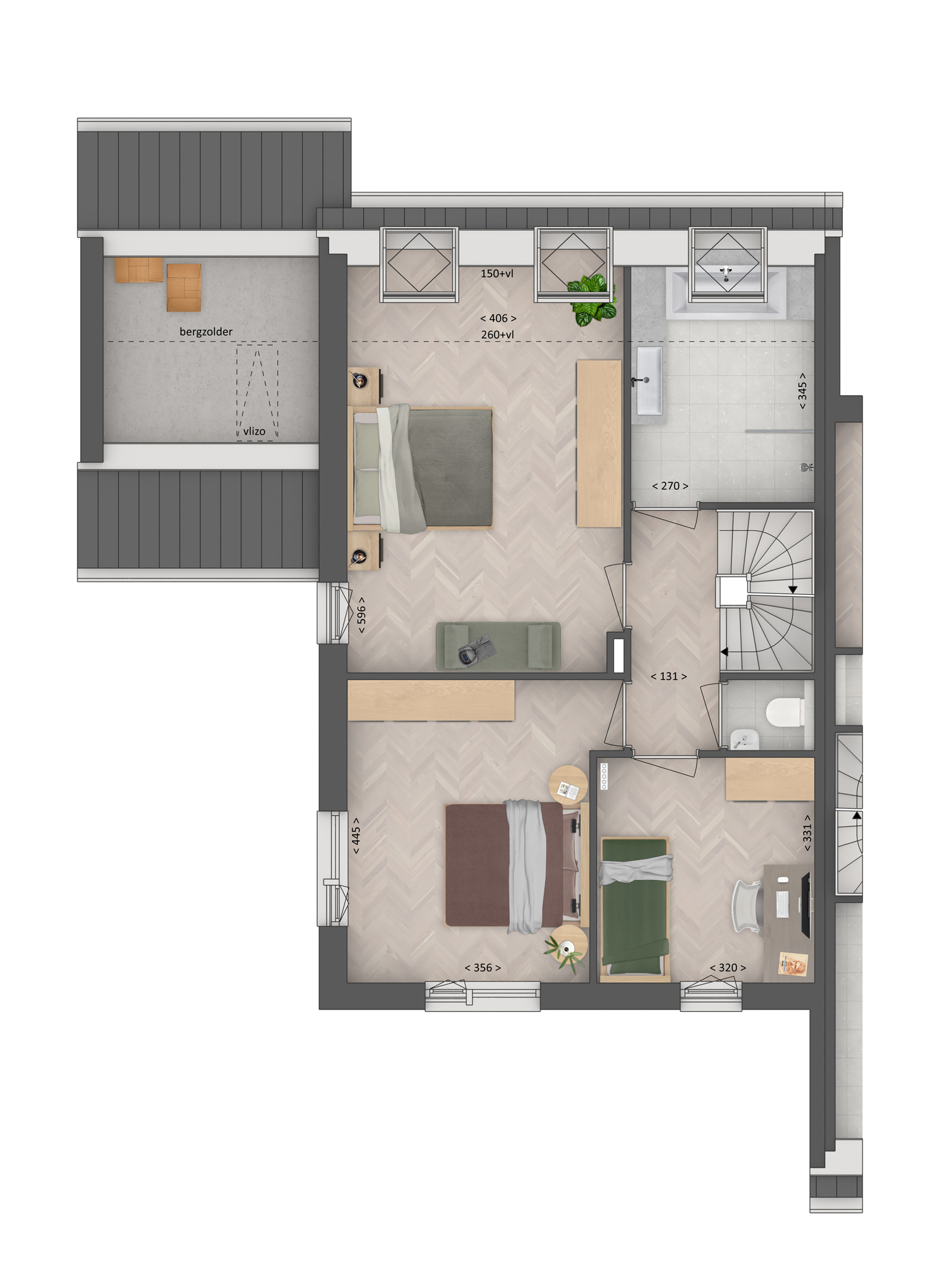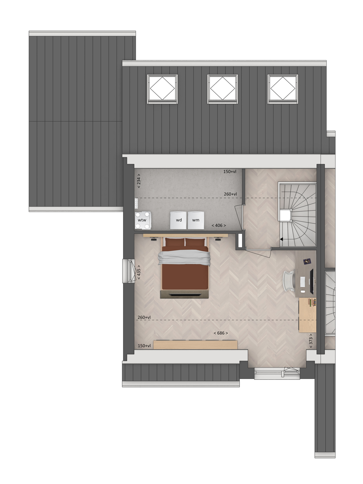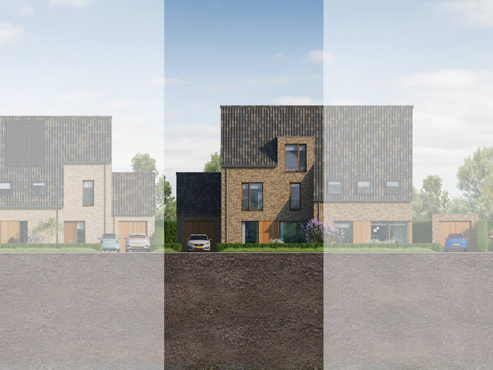 Enter through a side entrance into a well-lit hallway linking to the living room, toilet and utility spaces. The living zone is bathed in natural light, connecting seamlessly with the kitchen at the rear. Large sliding doors invite you to extend daily rituals into the garden, making gatherings both spacious and intimate. The upper floors offer three bedrooms enjoying views of both the front and rear gardens, plus a bathroom with shower, bathtub and washbasin. The top floor reveals an additional bedroom with a generous dormer.