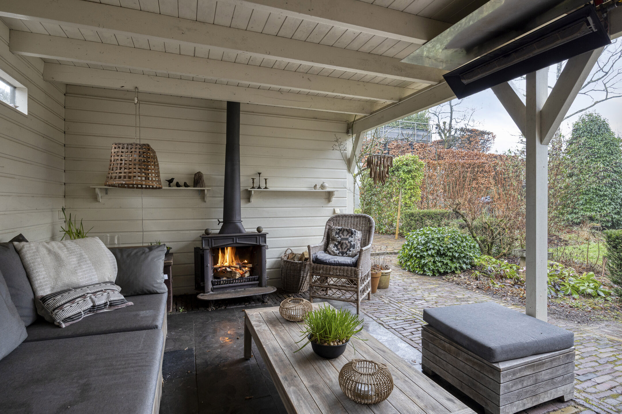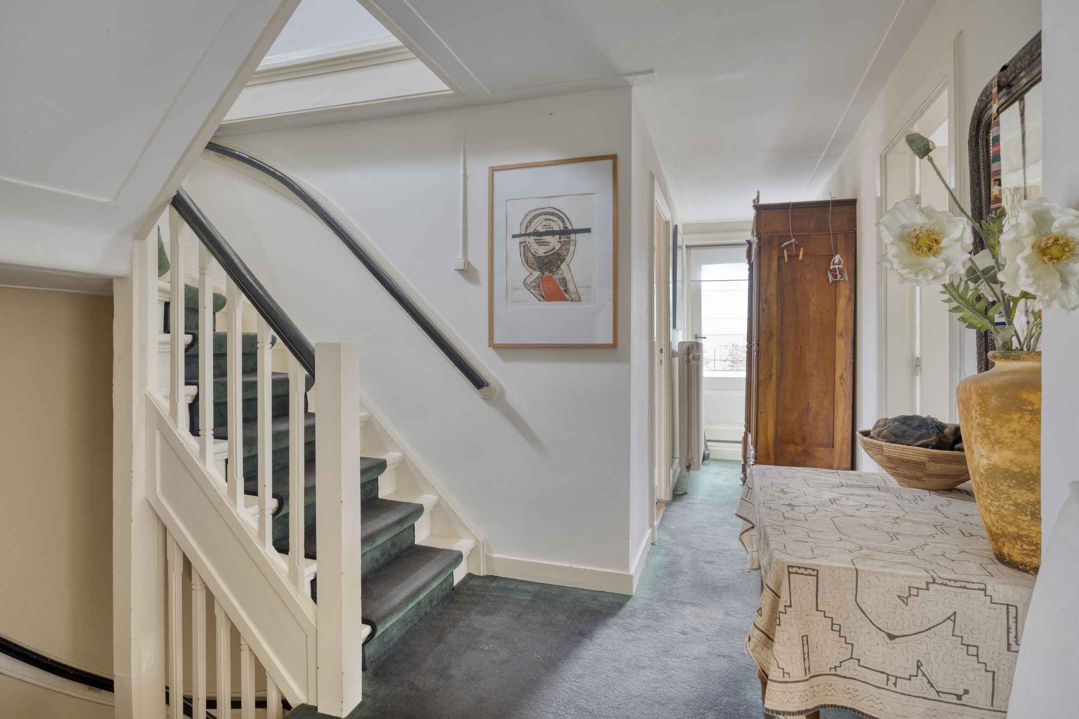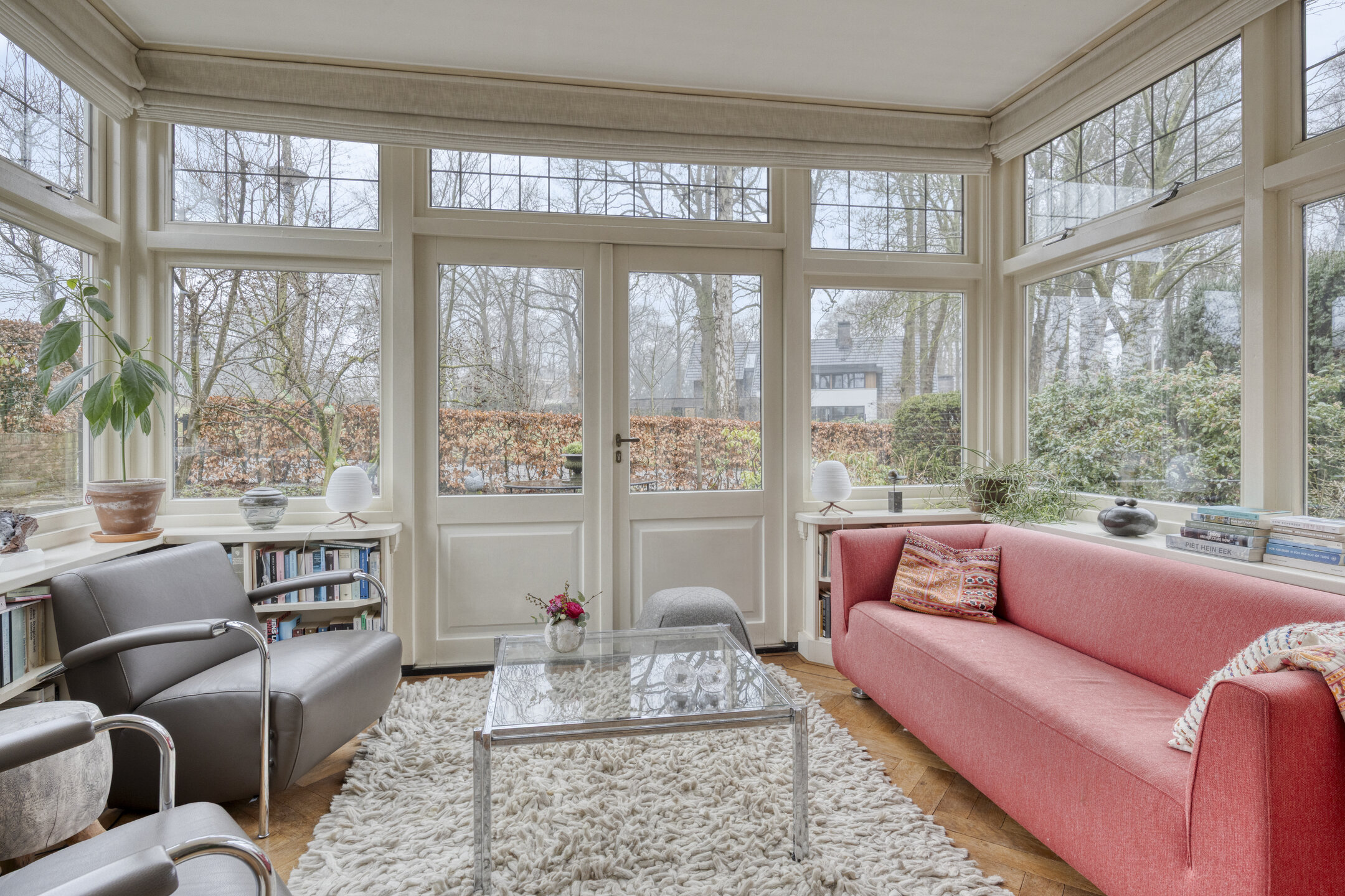 Life along Hoge Haerlaan means enjoying tranquility and space, with daily amenities close by. The ground floor welcomes you via a covered entrance and spacious vestibule, leading to a home office framed by an elegant bay window. The living room’s expansive windows and conservatory invite daylight and open outwards into the serene south east-facing garden, enriched with multiple terraces and layered greenery. A fireplace-warmed kitchen features high-end appliances and opens onto a covered terrace. Practical spaces extend to a larder-height cellar, utility room, and ample garage.