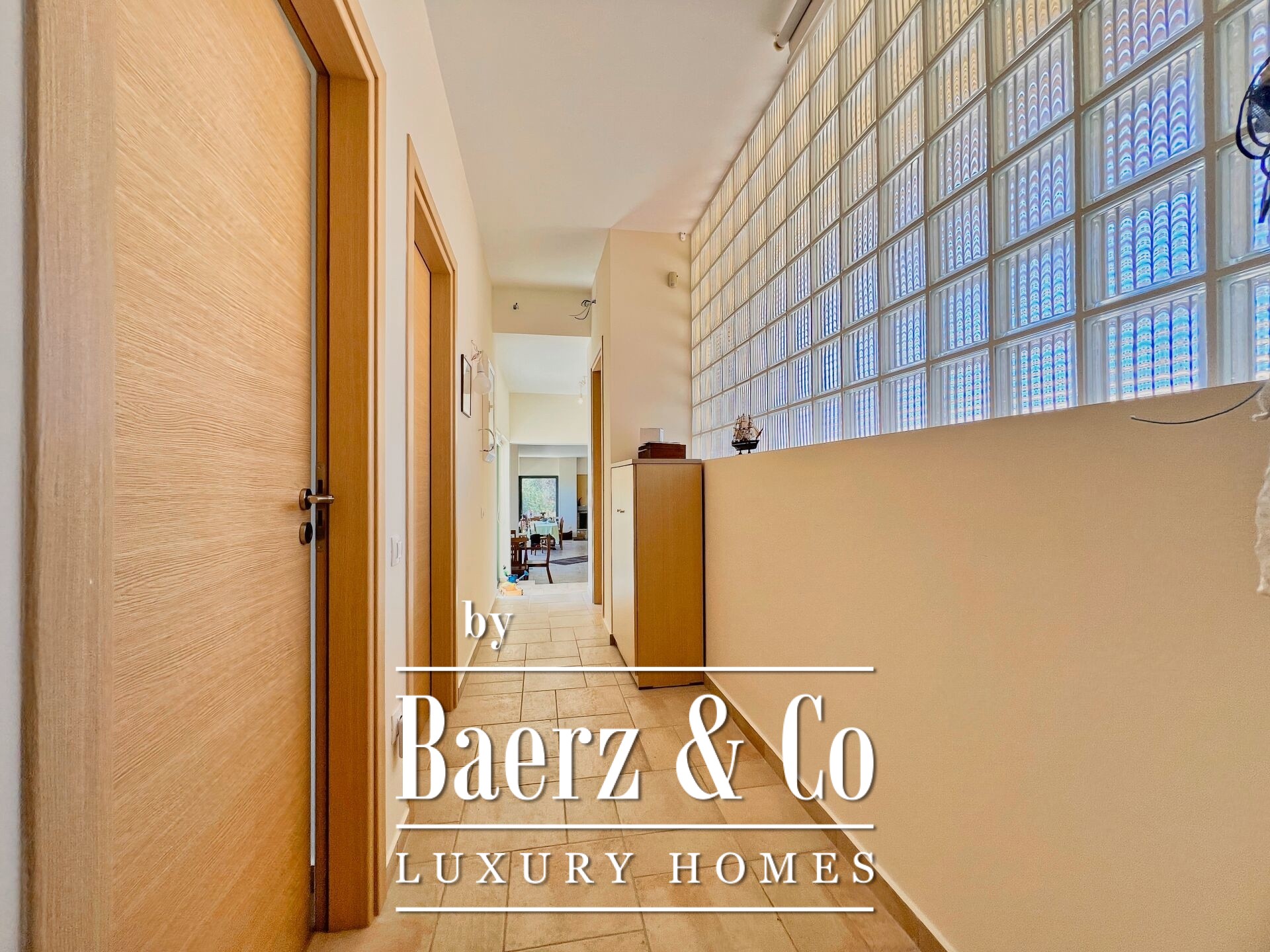 Eastern oriented and filled with natural light, the residence is surrounded by a landscaped garden with automated irrigation, mature trees, and a covered BBQ area. Two open parking spaces and a dedicated storage room support ease of use, whether for holidays or an enduring residence. Security and comfort are prioritized through a security door, alarm system, aluminum double-glazed thermal frames, electric shutters, and advanced heating and cooling systems including fan coil units and a solar water heater. Practicality is further ensured by tiled flooring, a 45-cubic-meter water tank, and three-phase power.