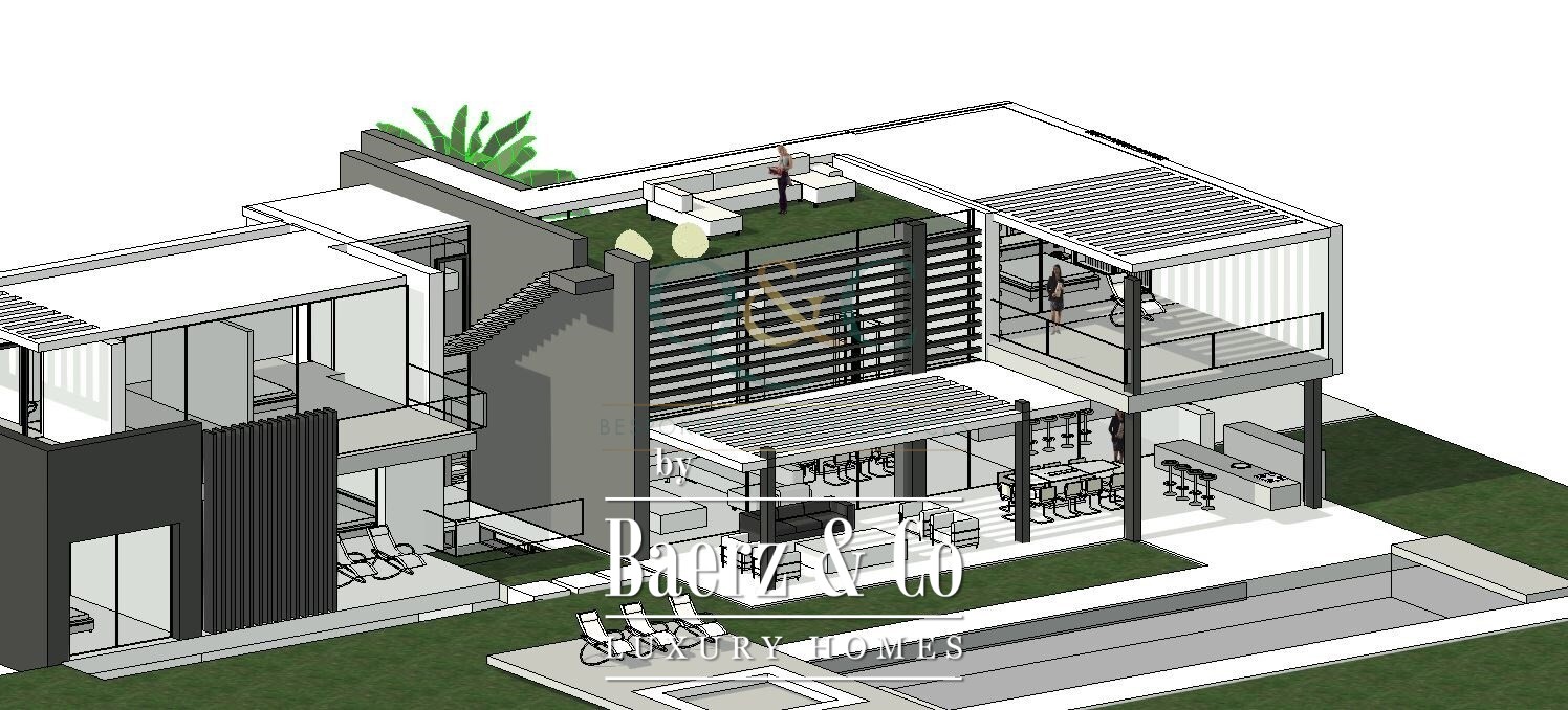 Living here extends outdoors with an infinity pool, a sunken lounge and firepit, and a rooftop terrace with hot tub, bar, and panoramic Algarve vistas. Double garage, EV-ready security gates, advanced VMC ventilation, and main drainage complete this carefully considered home. The setting offers unrivaled access to golf, local dining, beaches, and shops, making this luxury villa for sale in Quarteira a rare intersection of style, function, and setting.