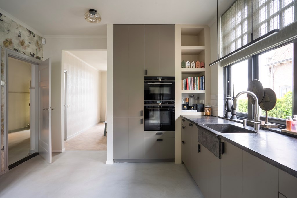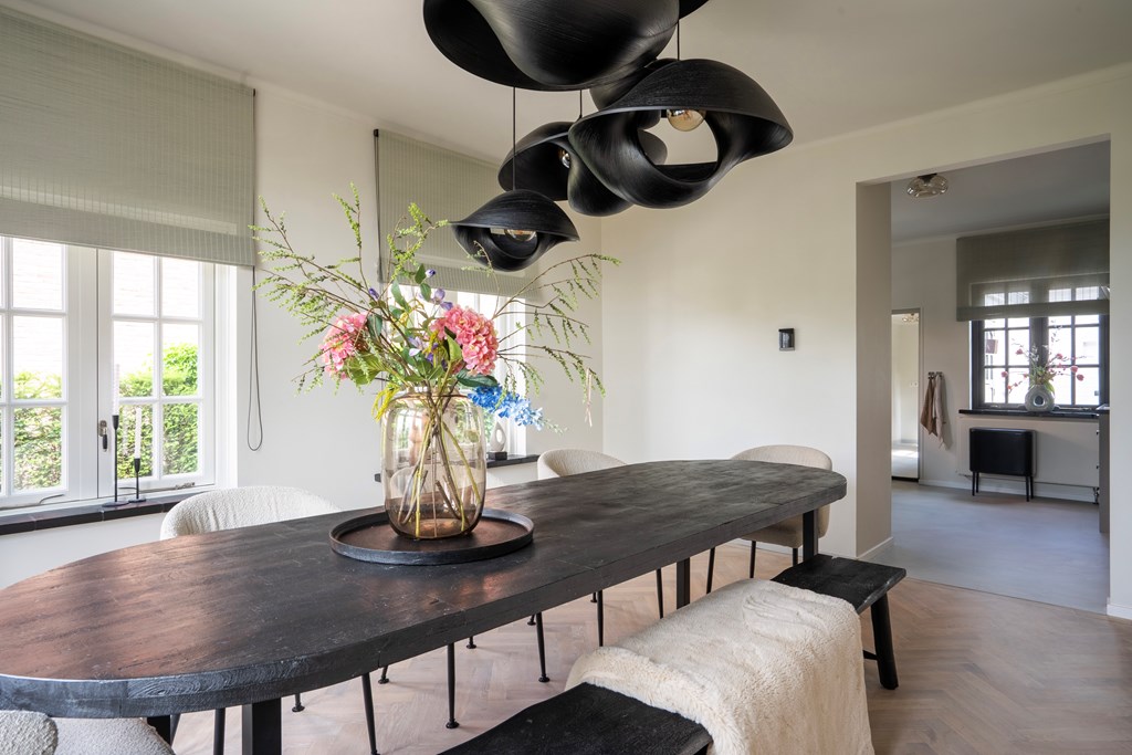 On the other side of the hall is the luxurious kitchen. Spacious and modern, it is fitted with high-quality built-in appliances and offers extensive work and storage space—a dream for any cooking enthusiast, with plenty of room for serious cooking and baking. The kitchen flows seamlessly into the dining room, an inviting space that comfortably accommodates larger gatherings—ideal for relaxed family dinners or more formal occasions with friends. From the kitchen you also have access to the practical utility room, perfect for extra storage and as a laundry area.
