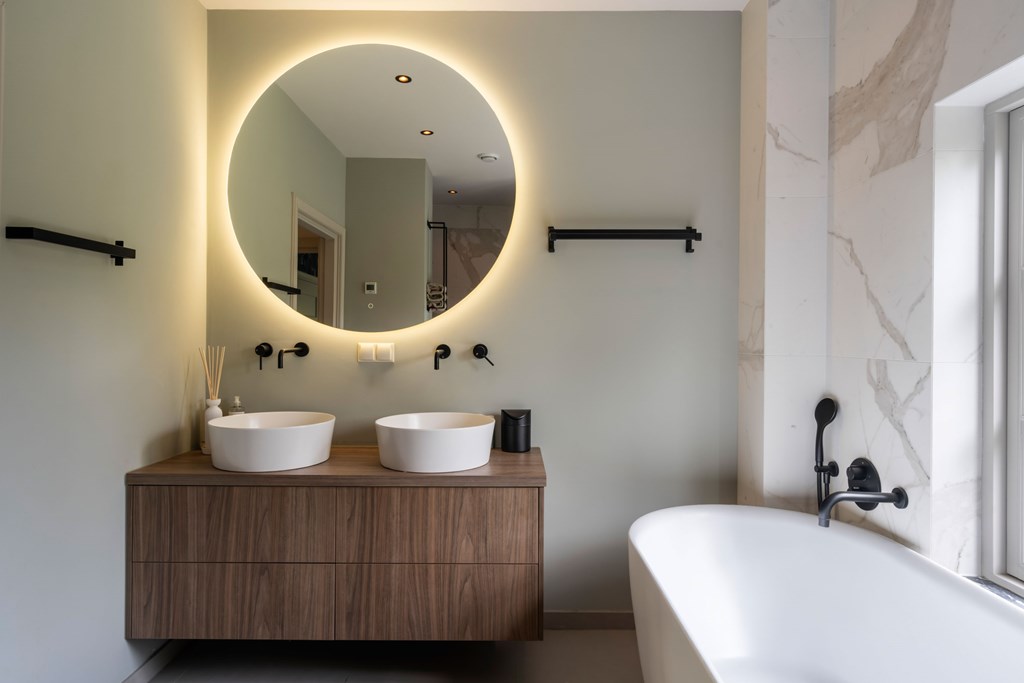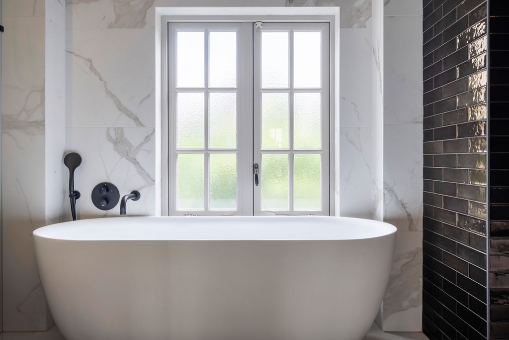 On the first floor there are four generous bedrooms. Each room is beautifully finished and highly versatile: whether you need extra bedrooms, a home office, hobby room, or fitness space, these rooms can be arranged to suit. The finely finished bathroom on this floor features a luxurious freestanding tub, a serene spot to unwind and enjoy a moment to yourself.