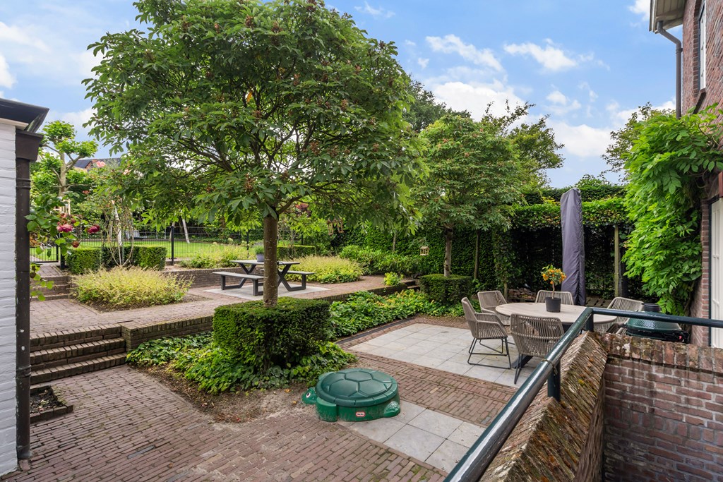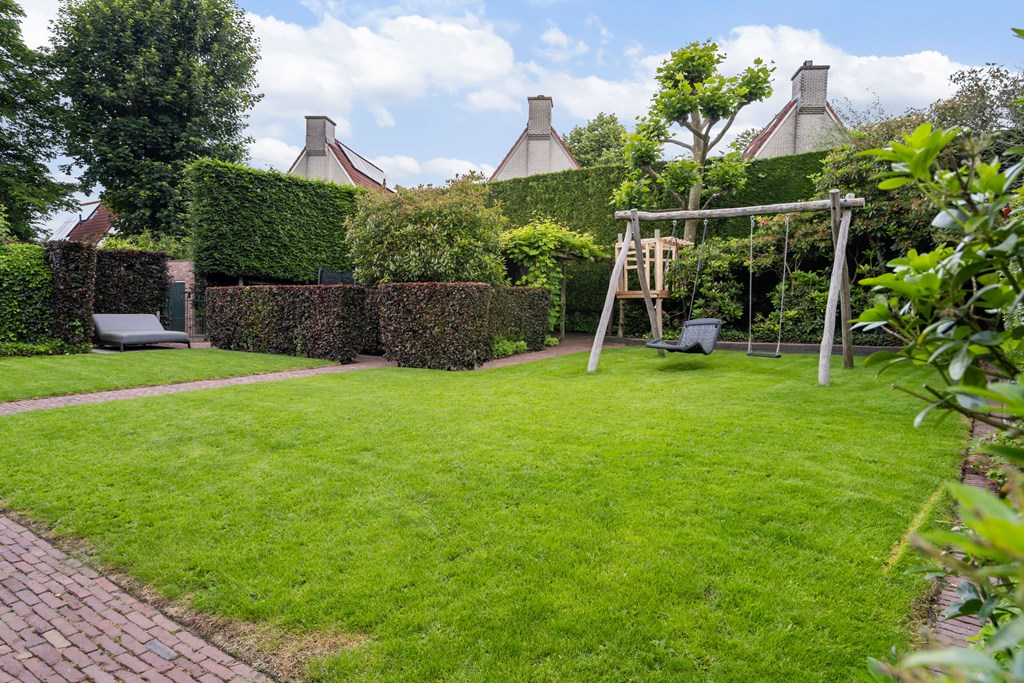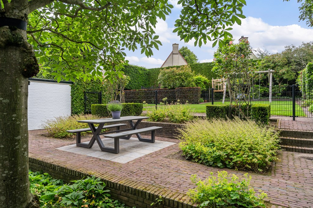 Outside, a large garden awaits with countless possibilities for recreation and relaxation. There is ample space for children to play, to create a vegetable garden, or to design multiple seating areas for unwinding. Whether you’re hosting a summer BBQ, gardening, or simply relaxing in peace, this garden has it all—a perfect extension of the indoor living space and a true invitation to outdoor living. The planting is wonderfully traditional with rose bushes and richly planted borders.