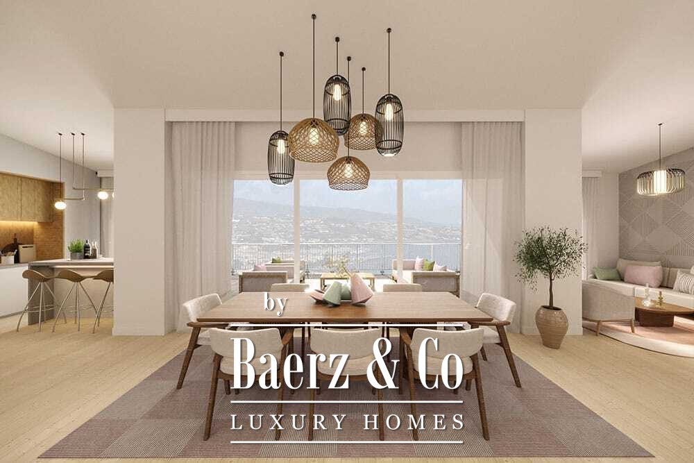 This building stands across four terraces and comprises just seven luxury apartments, including layouts of two bedrooms and two bathrooms within a living area of 123 m². The open living spaces are accentuated by balconies and a private garden, allowing natural light and sea air to shape the daily rhythm. Communal amenities feature manicured gardens and an elegant swimming pool set for relaxation or sociable gatherings, while elevator access and optional covered parking add discretion and ease.