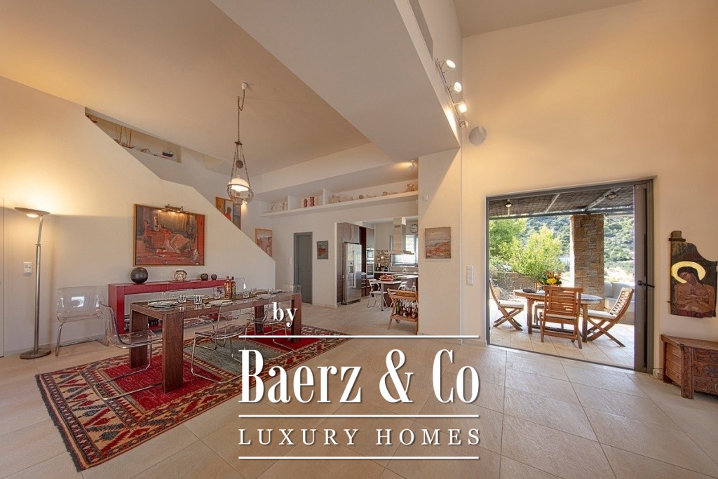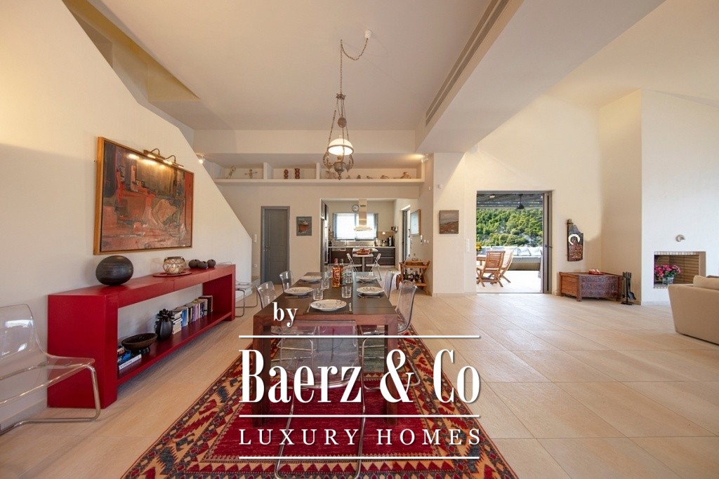 Villa Soligeia with sea views is positioned just 50 meters from the gentle coastline, offering a rare sense of privacy within the gulf of Amoni. Completed in 2006, this four-level villa rests on a 1,059 m² plot, its architecture thoughtfully adapted to the natural slope. Each of the 300 m² is dedicated to clarity of space and quiet certainty of design.