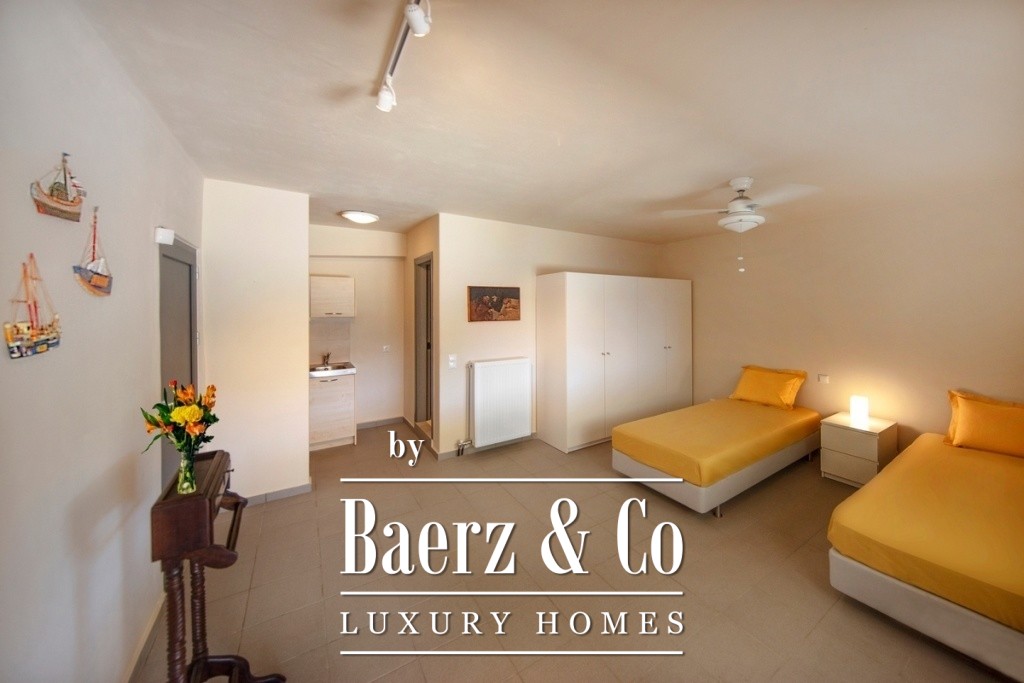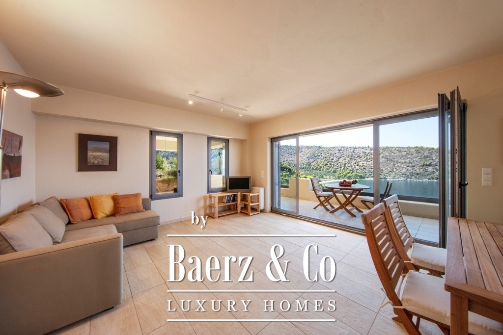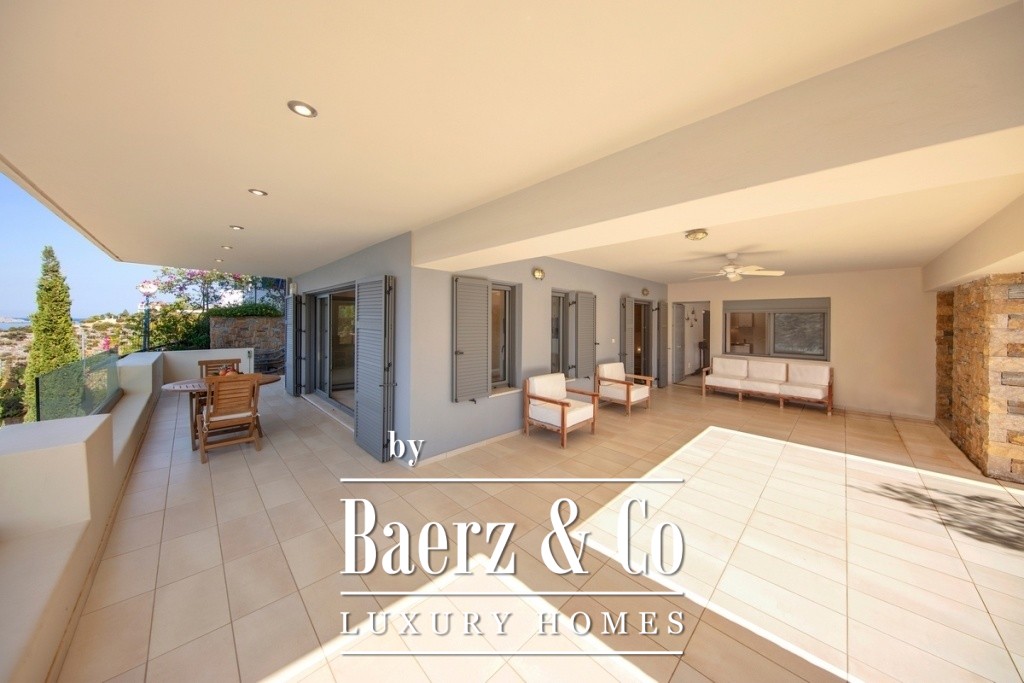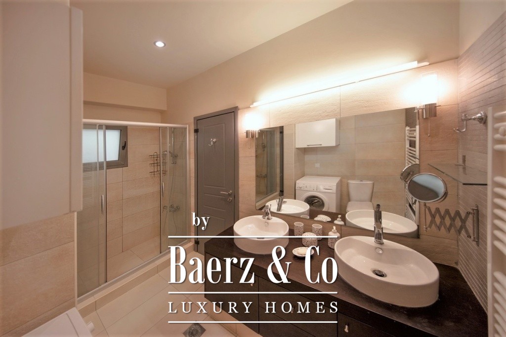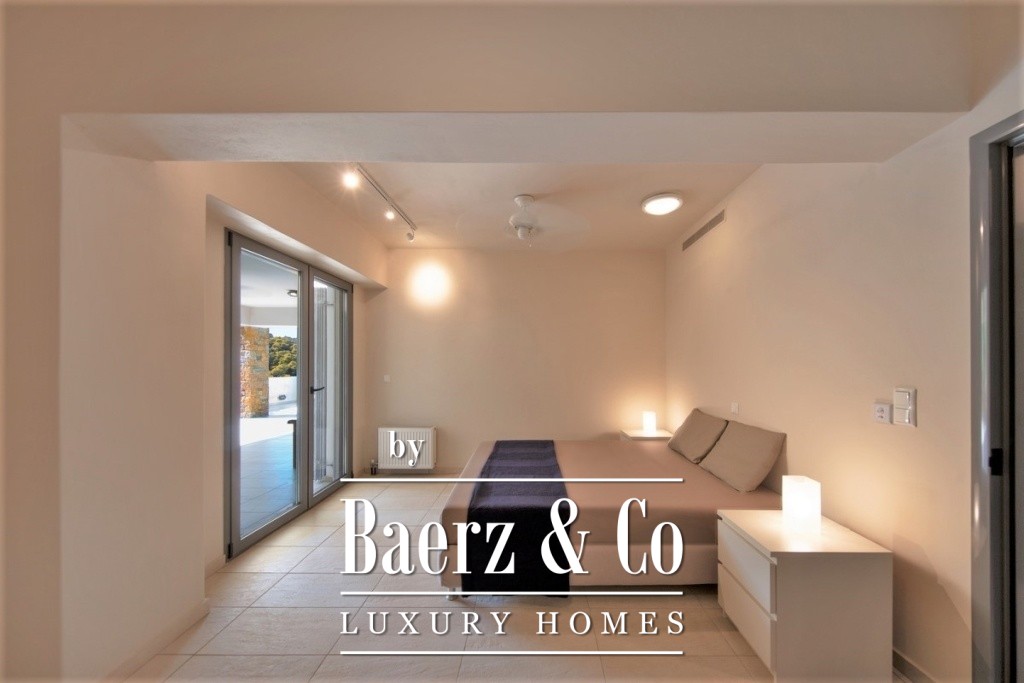 Two bedrooms on the uppermost level include a master suite with a dressing room, generous wardrobes, and private bathrooms. All are designed to maximize natural light and marine breezes. The villa is secured by an alarm system with dual connectivity, and each level is serviced by both external stairs and a private lift. This beachside villa for sale in Soligeia is just one hour and thirty minutes from Athens and offers the studied pace of Mediterranean life, moments from a tranquil beach seldom disturbed by crowds.