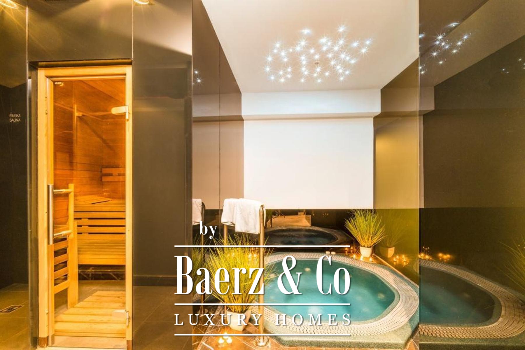 Amenities include a reception, a dedicated restaurant and kitchen, Finnish sauna, jacuzzi, gym, and thoughtful storage and laundry facilities. There are 3 guest and staff toilets, 6 outdoor parking spaces, and 4 garage spaces. The outdoor pool and landscaped garden cover a combined 494 m², creating a tranquil haven for relaxation.