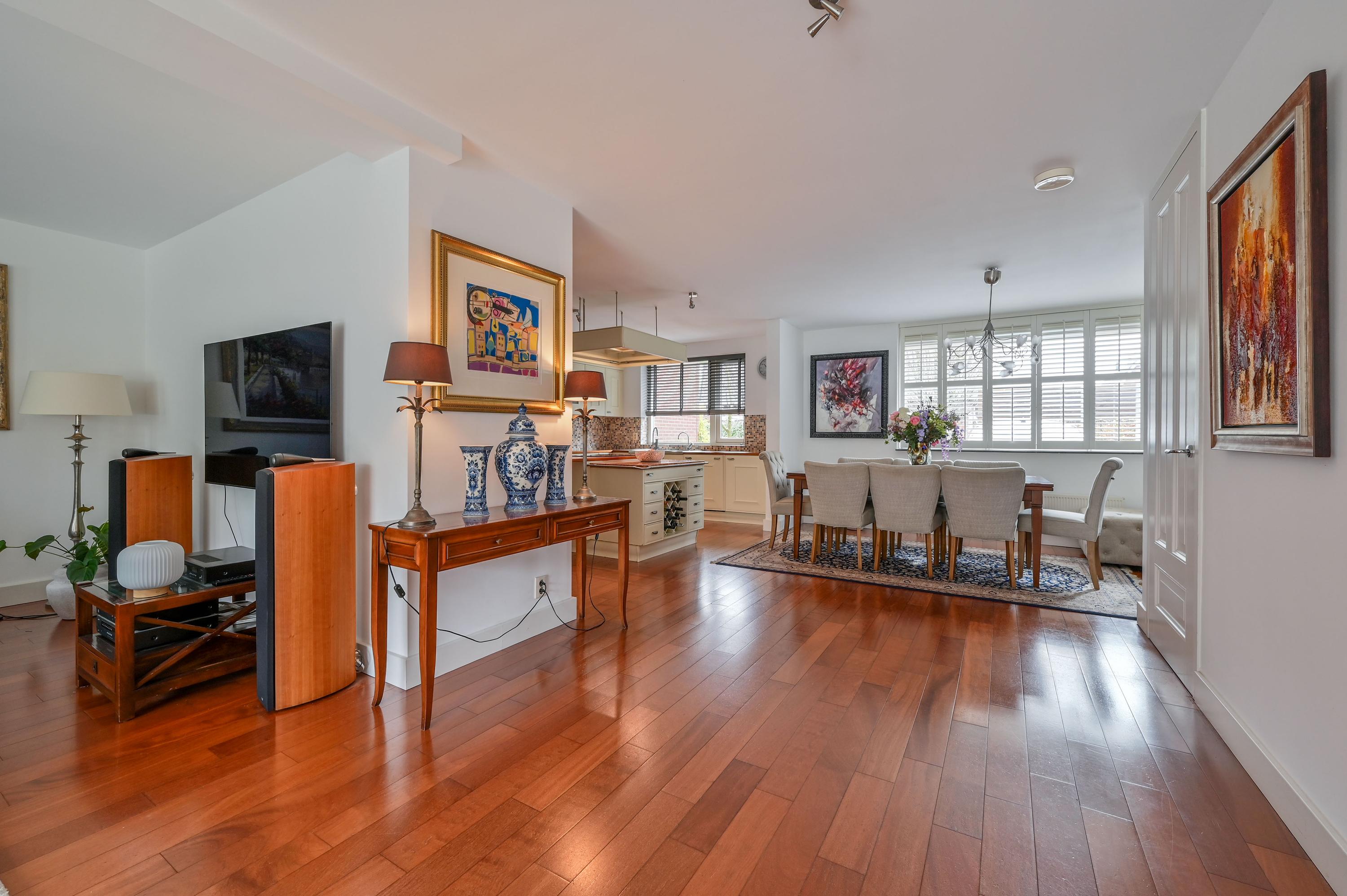 Via the beautifully paved front garden, with a path leading to the side of the house flanked by stately plane trees, you reach the front door. The representative, spacious hall immediately conveys a well-finished impression and provides access to the modern toilet with a sink, the meter cupboard, and the fixed staircase to the first floor. A stylish closed door leads to the impressive living space, where the living room and open-plan kitchen flow seamlessly into each other.
