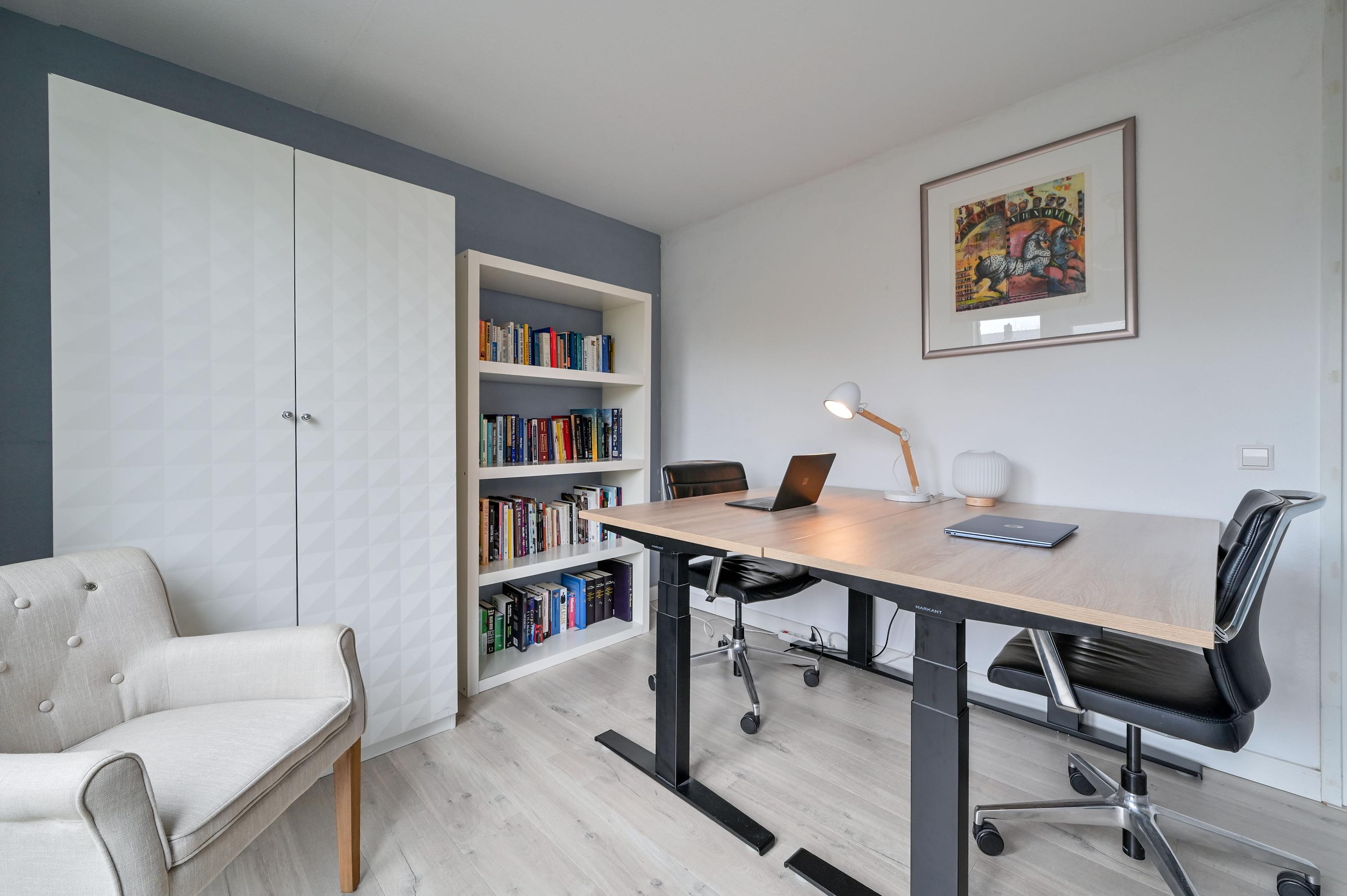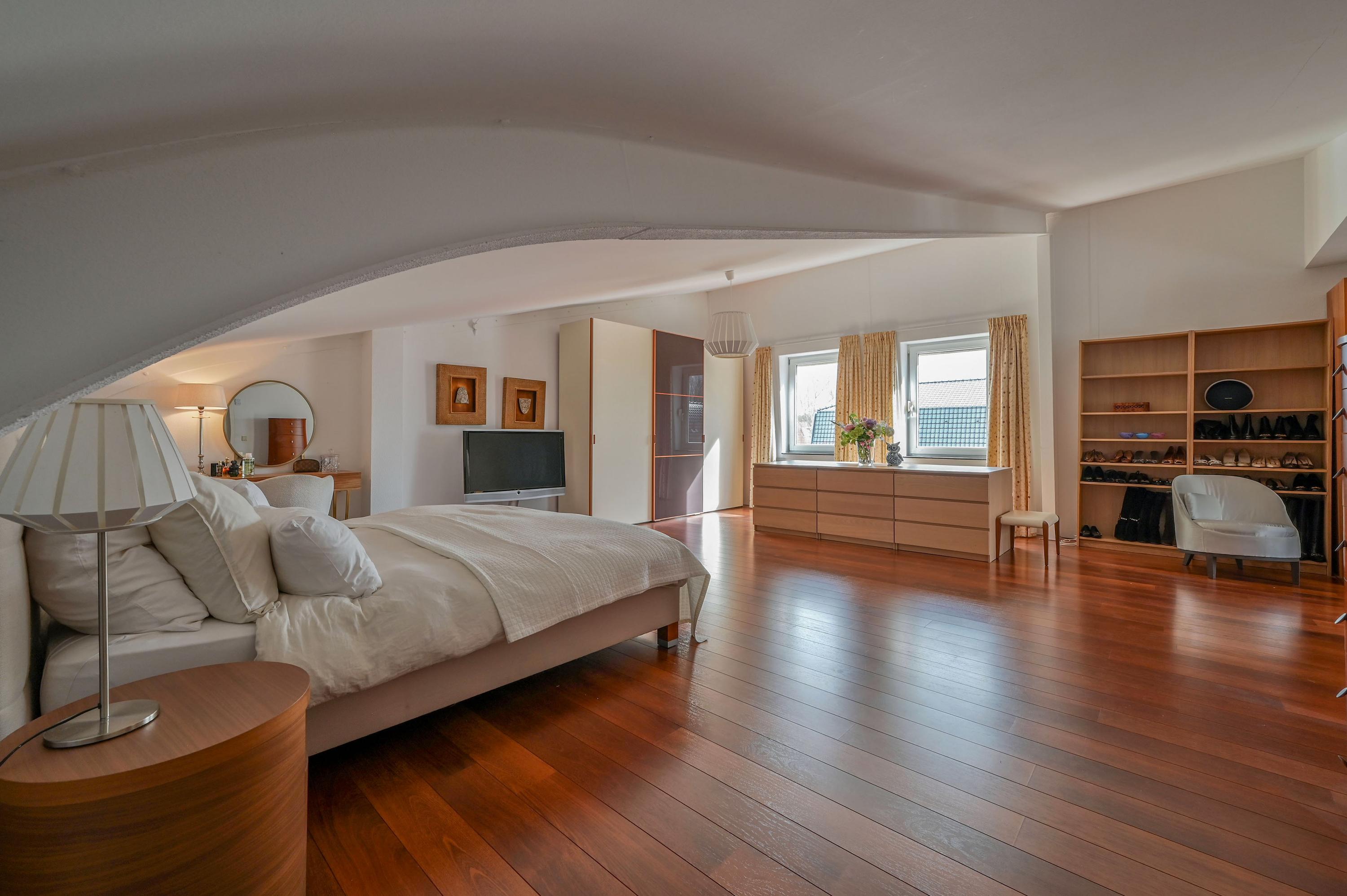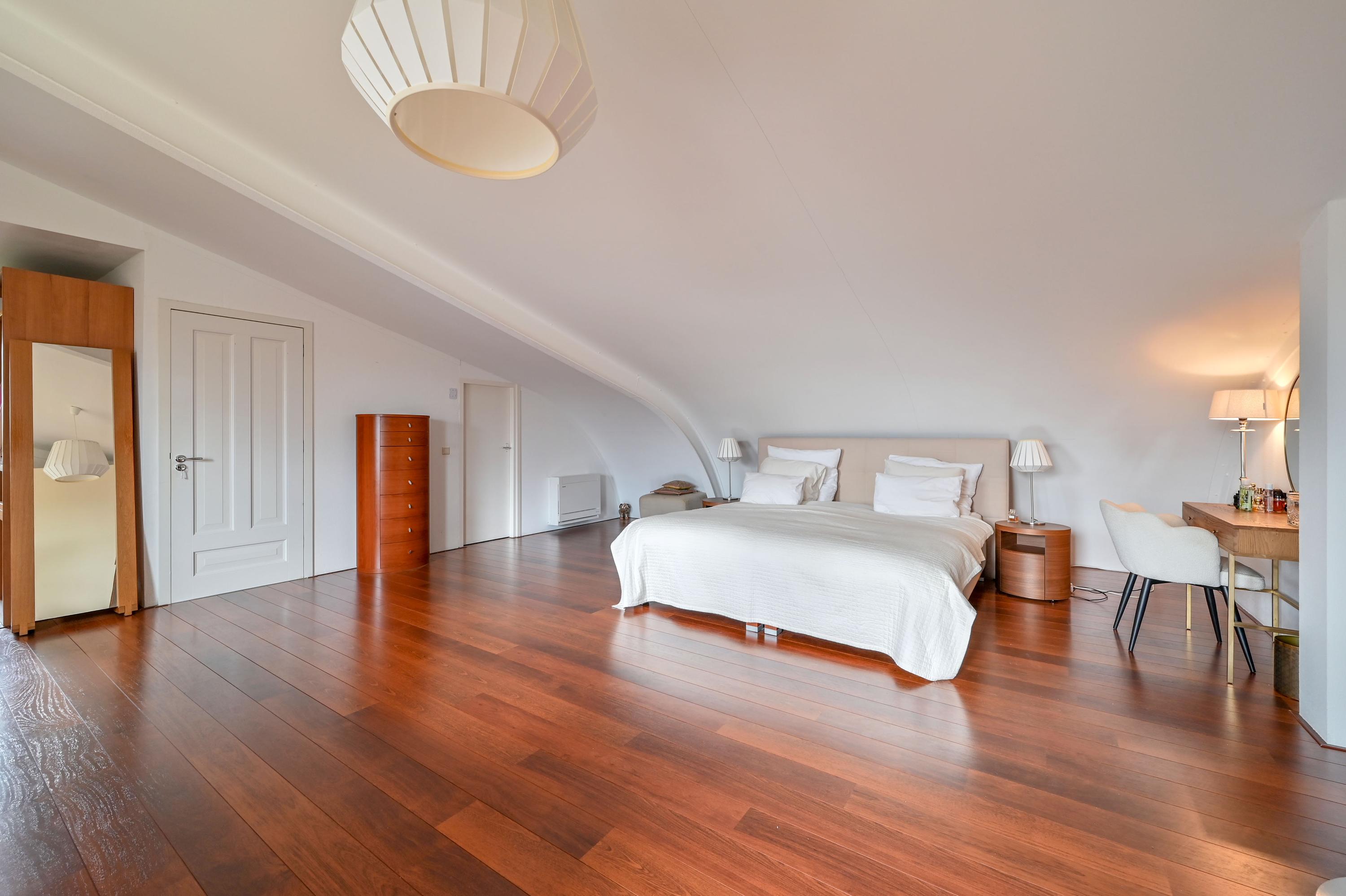 Via an open staircase, you reach the second floor, where the master suite is a true showstopper. This spacious room offers plenty of options for a luxurious and practical layout. The room features an open walk-in closet with a window overlooking the side garden, and a built-in wardrobe – both from the Italian brand Poliform – ensuring stylish and efficient storage. Two front windows and the side window provide ample natural light and are fitted with sunscreens. Laminate flooring and air conditioning complete the space. Due to its generous size, this floor also offers potential to add two attic rooms. Additionally, there is a spacious storage room with central heating and mechanical ventilation unit, ideal for extra storage and practical facilities.