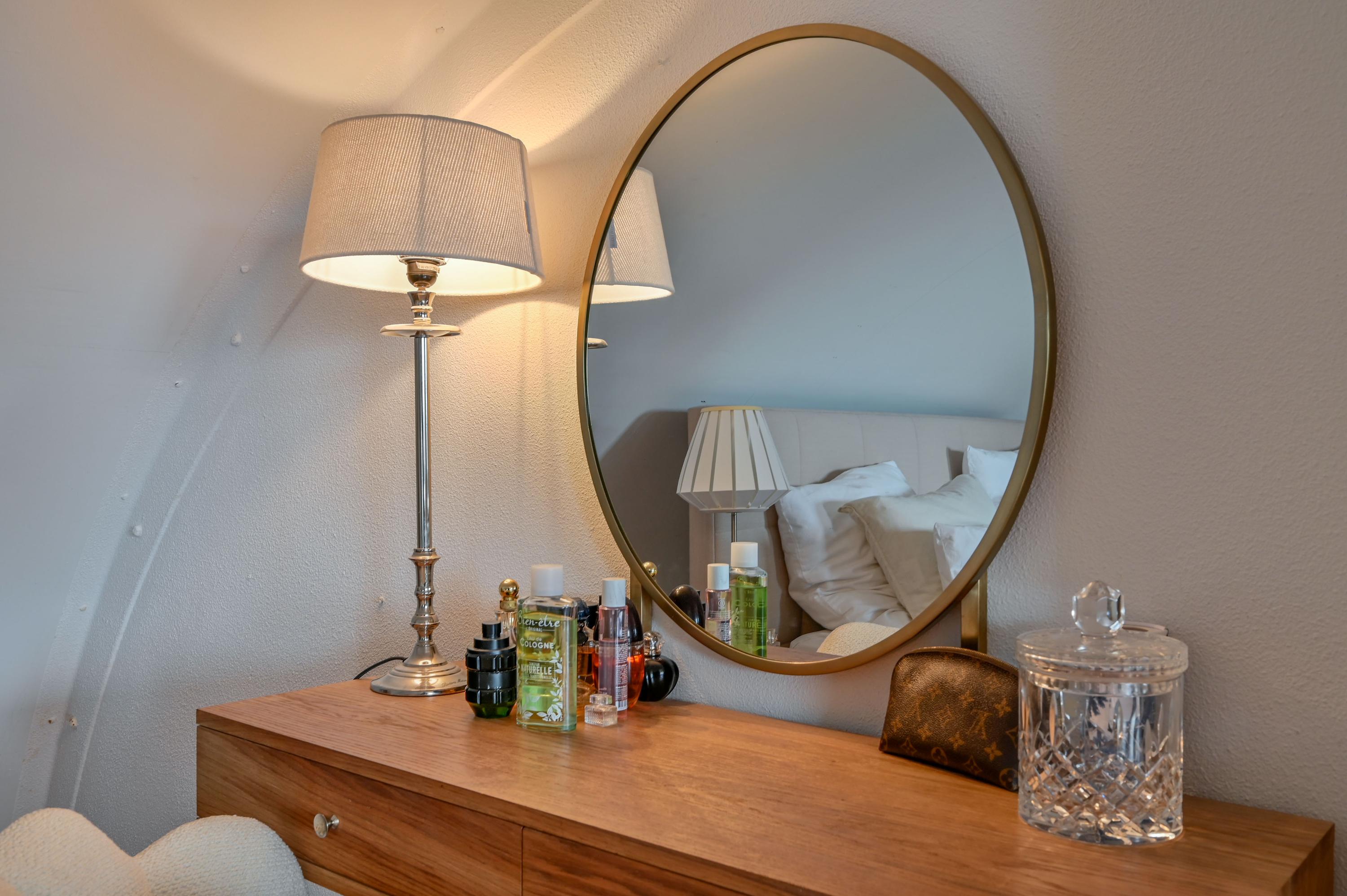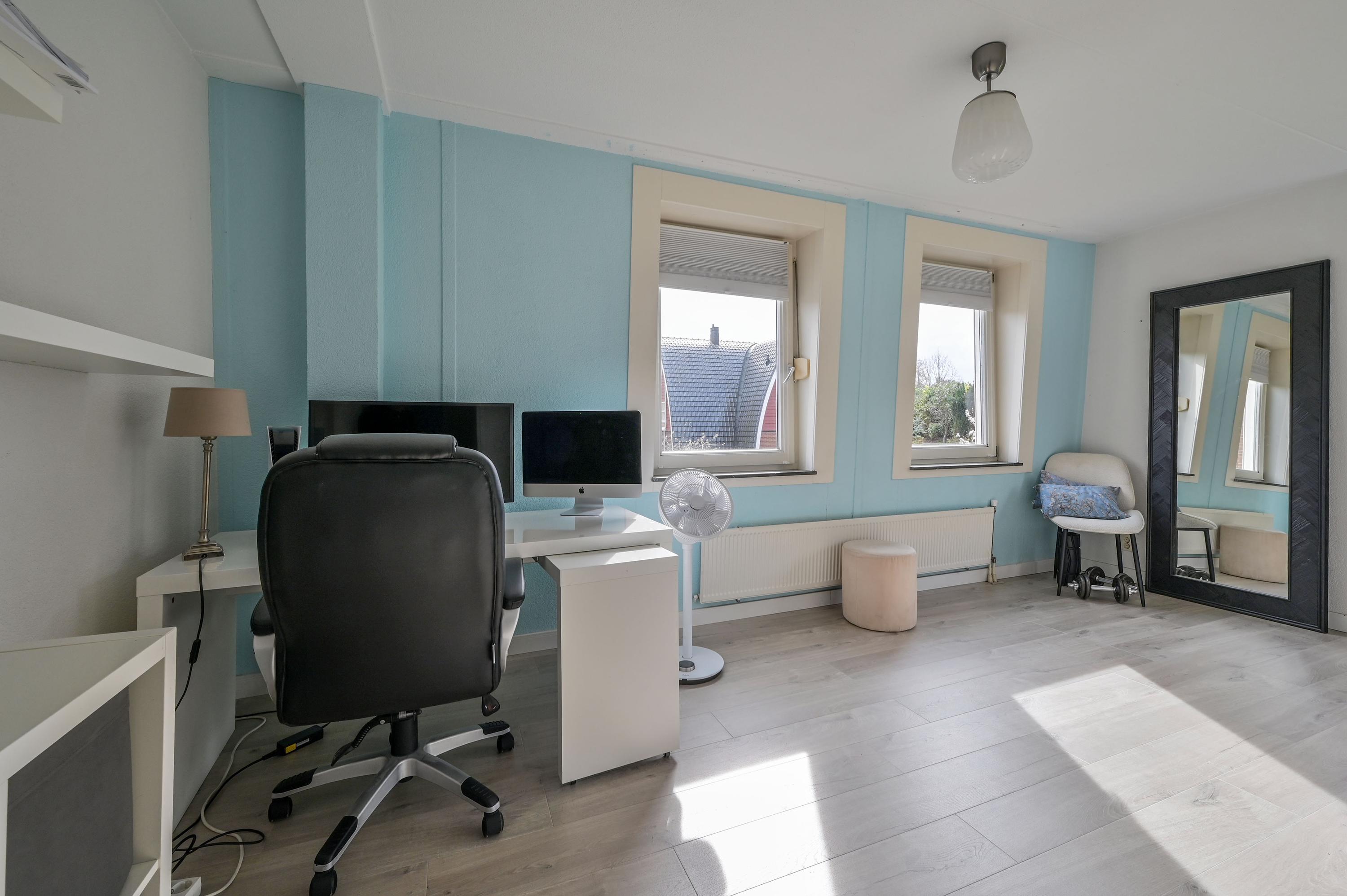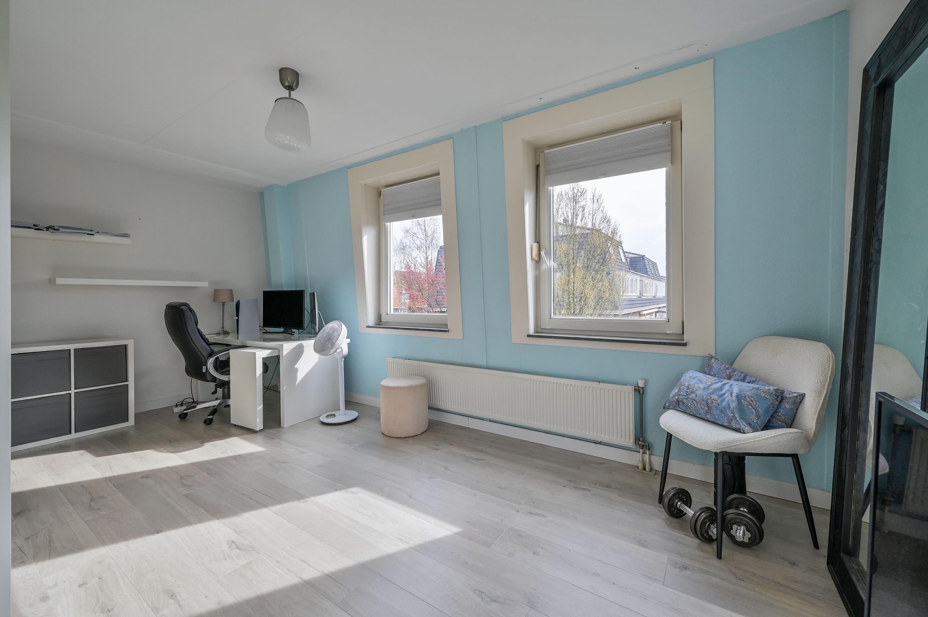 Via an open staircase, you reach the second floor, where the master suite is a true showstopper. This spacious room offers plenty of options for a luxurious and practical layout. The room features an open walk-in closet with a window overlooking the side garden, and a built-in wardrobe – both from the Italian brand Poliform – ensuring stylish and efficient storage. Two front windows and the side window provide ample natural light and are fitted with sunscreens. Laminate flooring and air conditioning complete the space. Due to its generous size, this floor also offers potential to add two attic rooms. Additionally, there is a spacious storage room with central heating and mechanical ventilation unit, ideal for extra storage and practical facilities.
