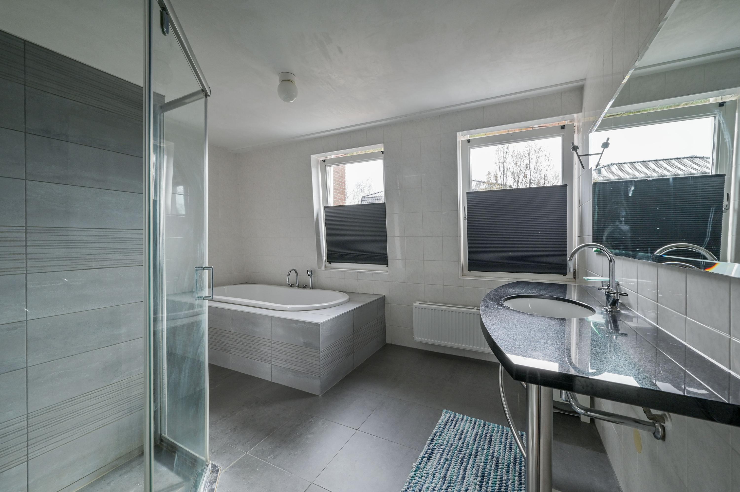 The spacious first-floor hall provides access to three large bedrooms, the stylish bathroom, and the practical laundry room. The spacious L-shaped master bedroom at the front features two large windows and a side window with garden views. The adjacent bathroom is equipped with a generous bathtub, modern shower, illuminated sink, toilet, and bidet – a space that perfectly combines luxury and functionality.
