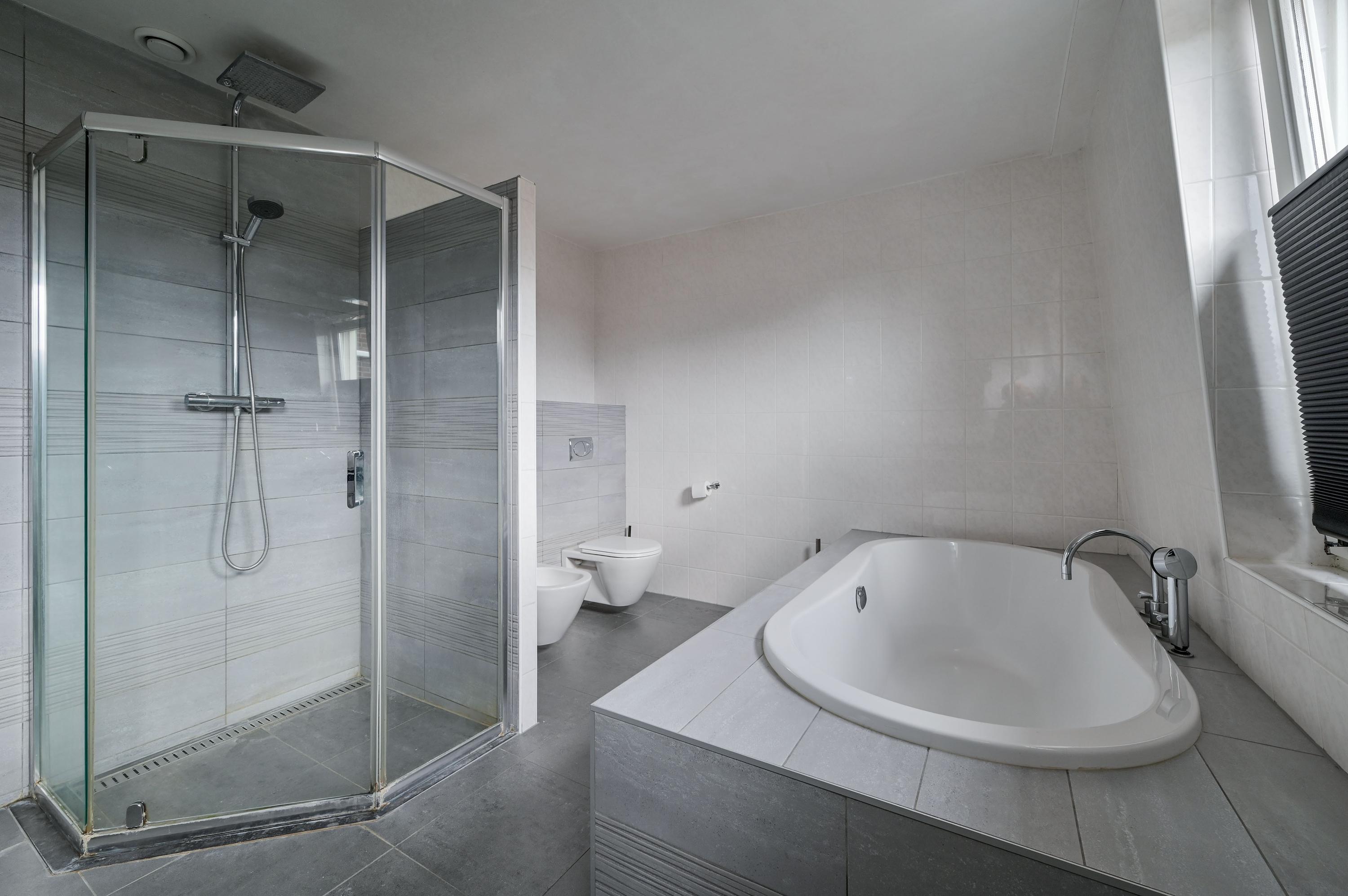 The kitchen at the front is bright and spacious, with large windows and a corner window at the dining area fitted with charming shutters – an ideal spot for cozy meals. The country-style kitchen features a central island with an induction hob and practical drawers on both sides, complemented by an elegant wine rack. The L-shaped countertop provides ample space and is equipped with luxury built-in appliances, including a grill plate, fryer with extractor hood, and built-in food processor. At the window side, there is the sink area with a double sink, Quooker, and dishwasher. A large cabinet wall with a combination microwave, additional oven on the other side of the kitchen, and space for a large double fridge/freezer with ice machine (available for takeover) completes the setup. Under the stairs, there is also a convenient cupboard for coats and extra storage.