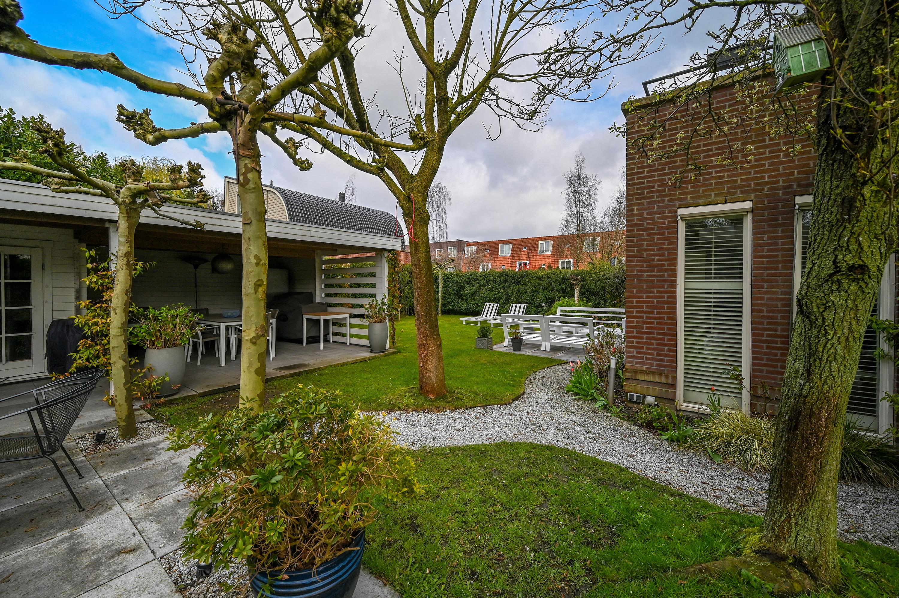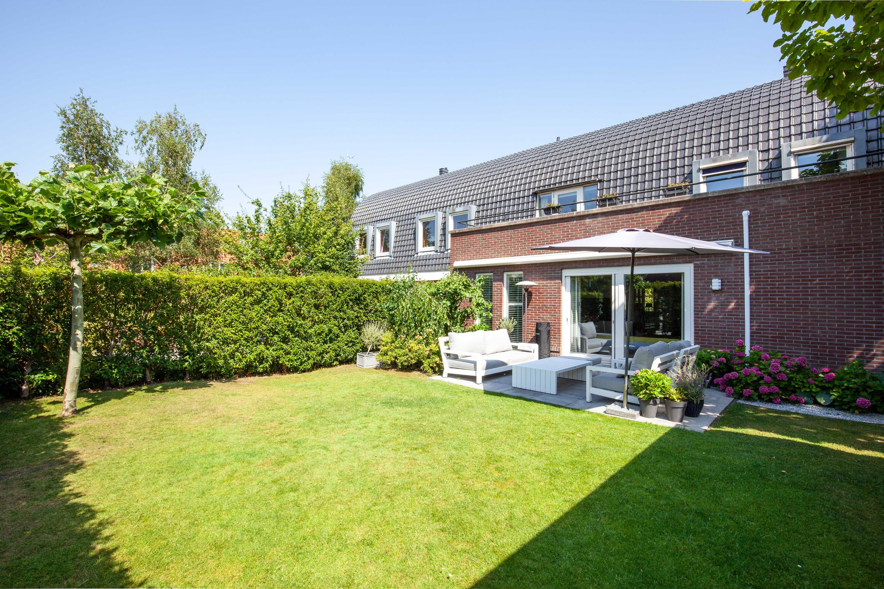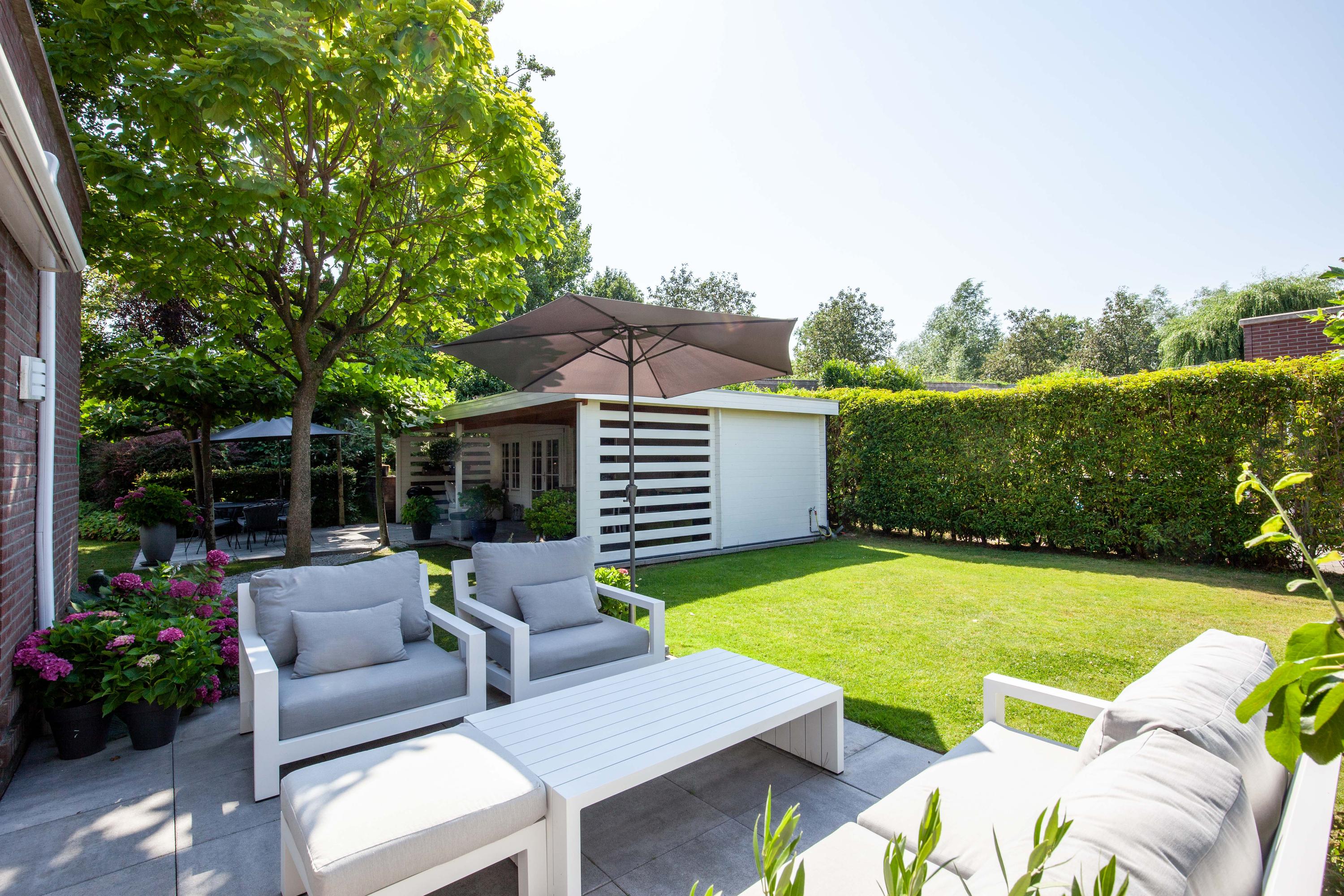 The beautiful garden is a true outdoor paradise, directly accessible via the sliding doors in the living room and via the side of the house through a charming open gate. The garden offers plenty of privacy and enjoys sunlight throughout the day, perfect for enjoying the outdoors. At the rear, there is a spacious terrace with a cozy seating area, complete with an awning spanning the full width of the house, ideal for both sun and shade. At the back of the garden stands a charming garden house with a covered area, perfect for a dining area with barbecue. The garden house features a neat wooden floor, electricity, and water, making it perfect as a workspace, hobby room, or for storage. Adjacent to the covered area is an additional terrace with seating, sheltered by a natural canopy of four beautiful plane trees, creating an idyllic spot to relax or entertain guests.