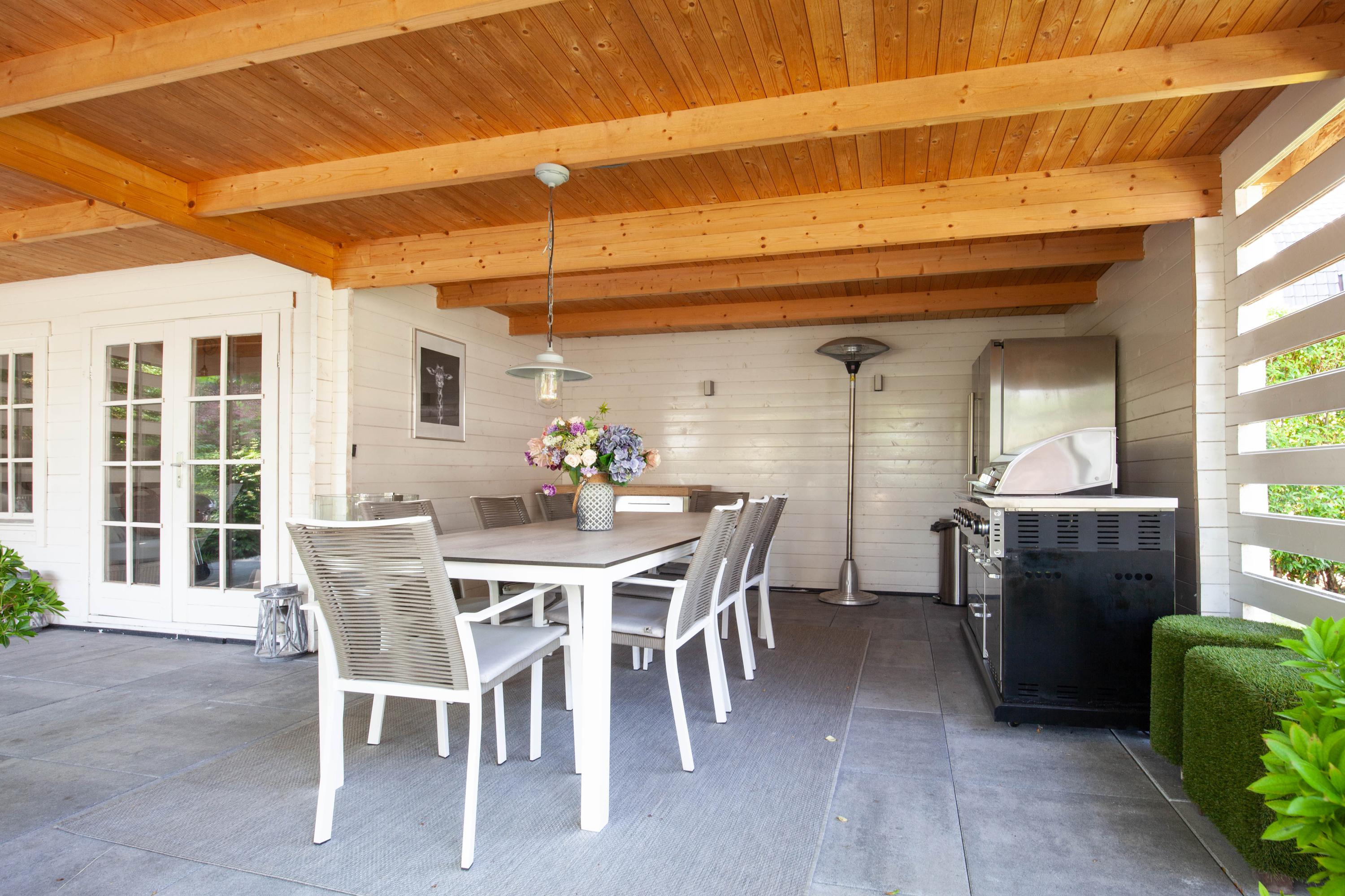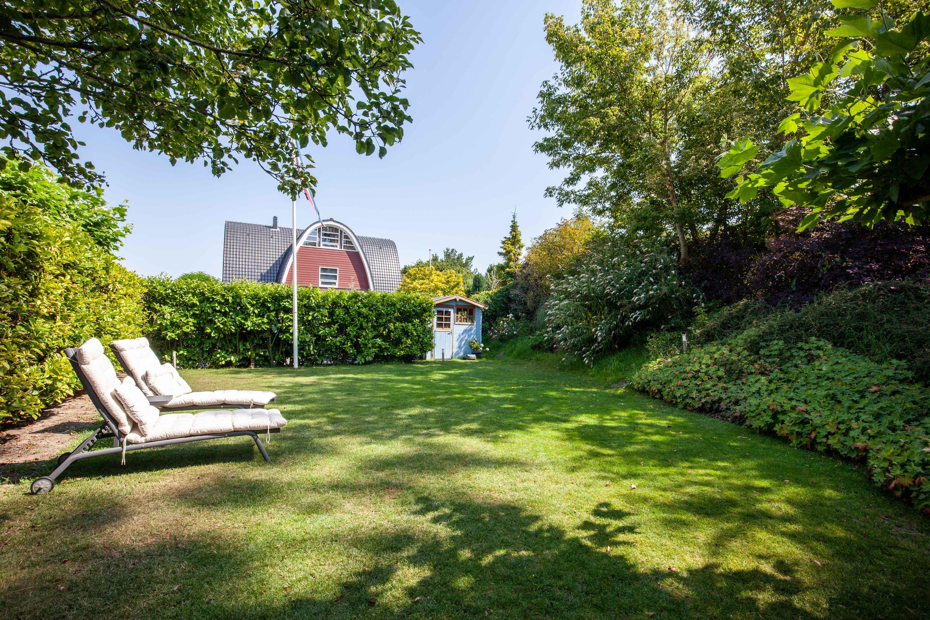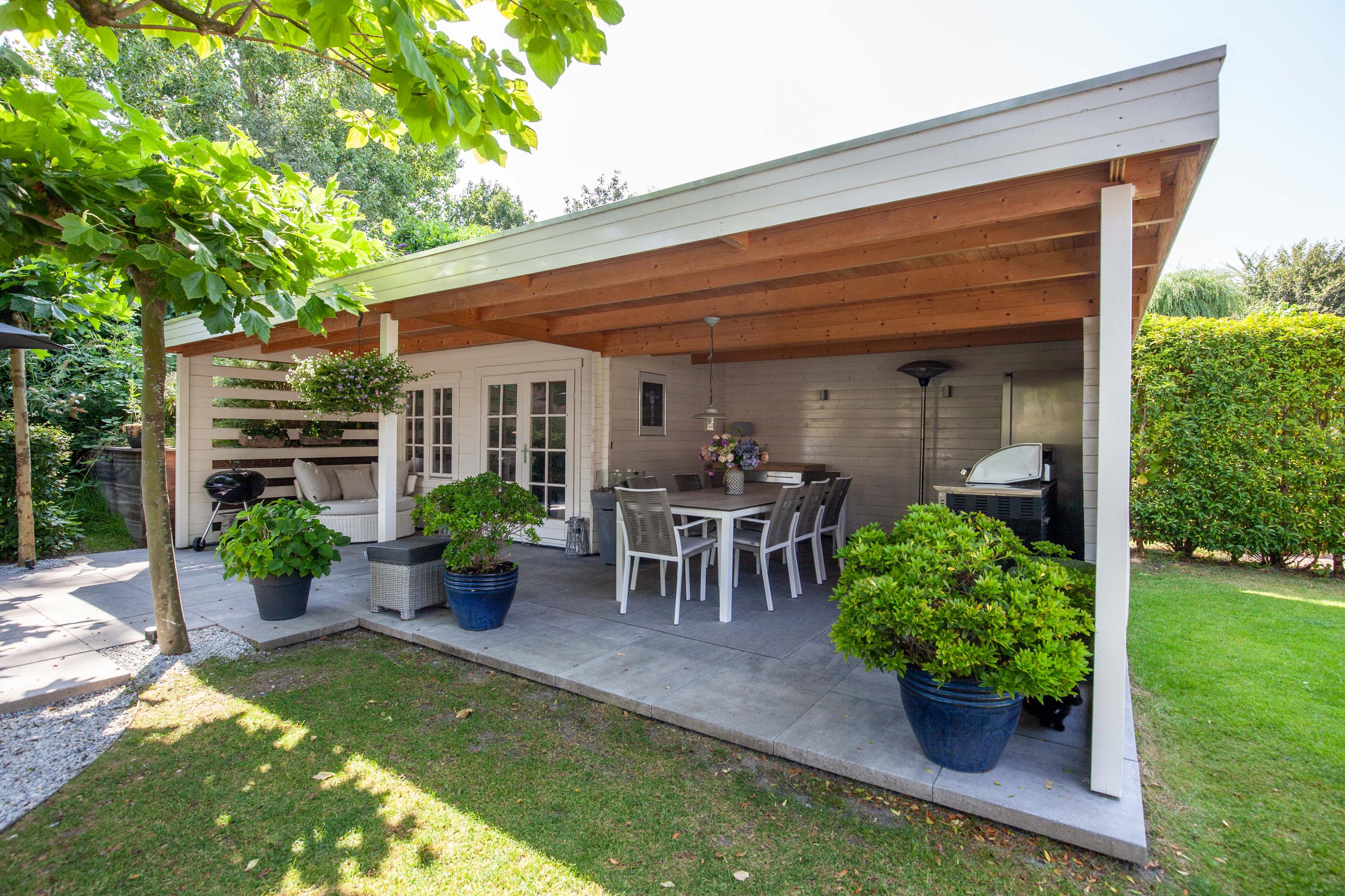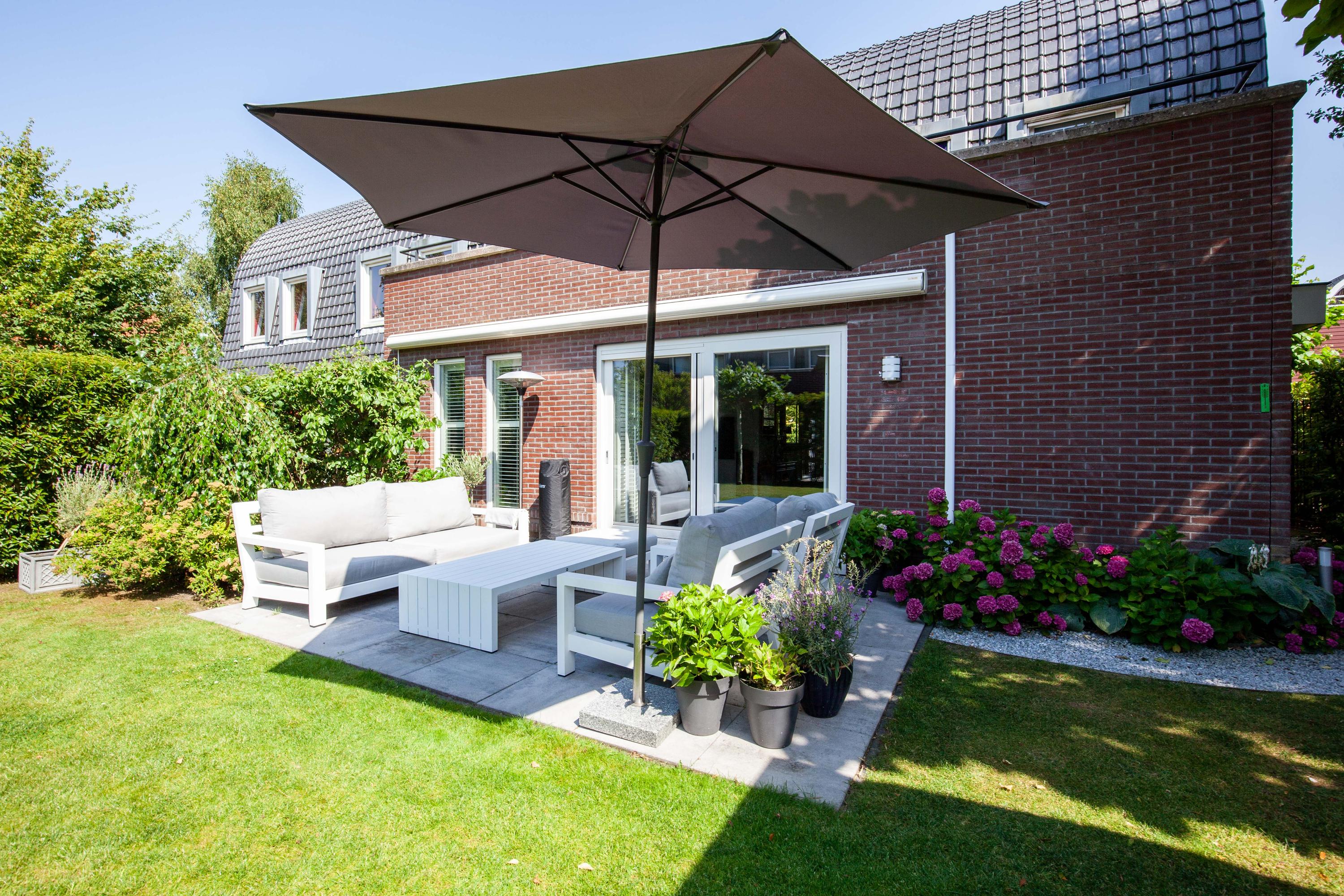 The beautiful garden is a true outdoor paradise, directly accessible via the sliding doors in the living room and via the side of the house through a charming open gate. The garden offers plenty of privacy and enjoys sunlight throughout the day, perfect for enjoying the outdoors. At the rear, there is a spacious terrace with a cozy seating area, complete with an awning spanning the full width of the house, ideal for both sun and shade. At the back of the garden stands a charming garden house with a covered area, perfect for a dining area with barbecue. The garden house features a neat wooden floor, electricity, and water, making it perfect as a workspace, hobby room, or for storage. Adjacent to the covered area is an additional terrace with seating, sheltered by a natural canopy of four beautiful plane trees, creating an idyllic spot to relax or entertain guests.