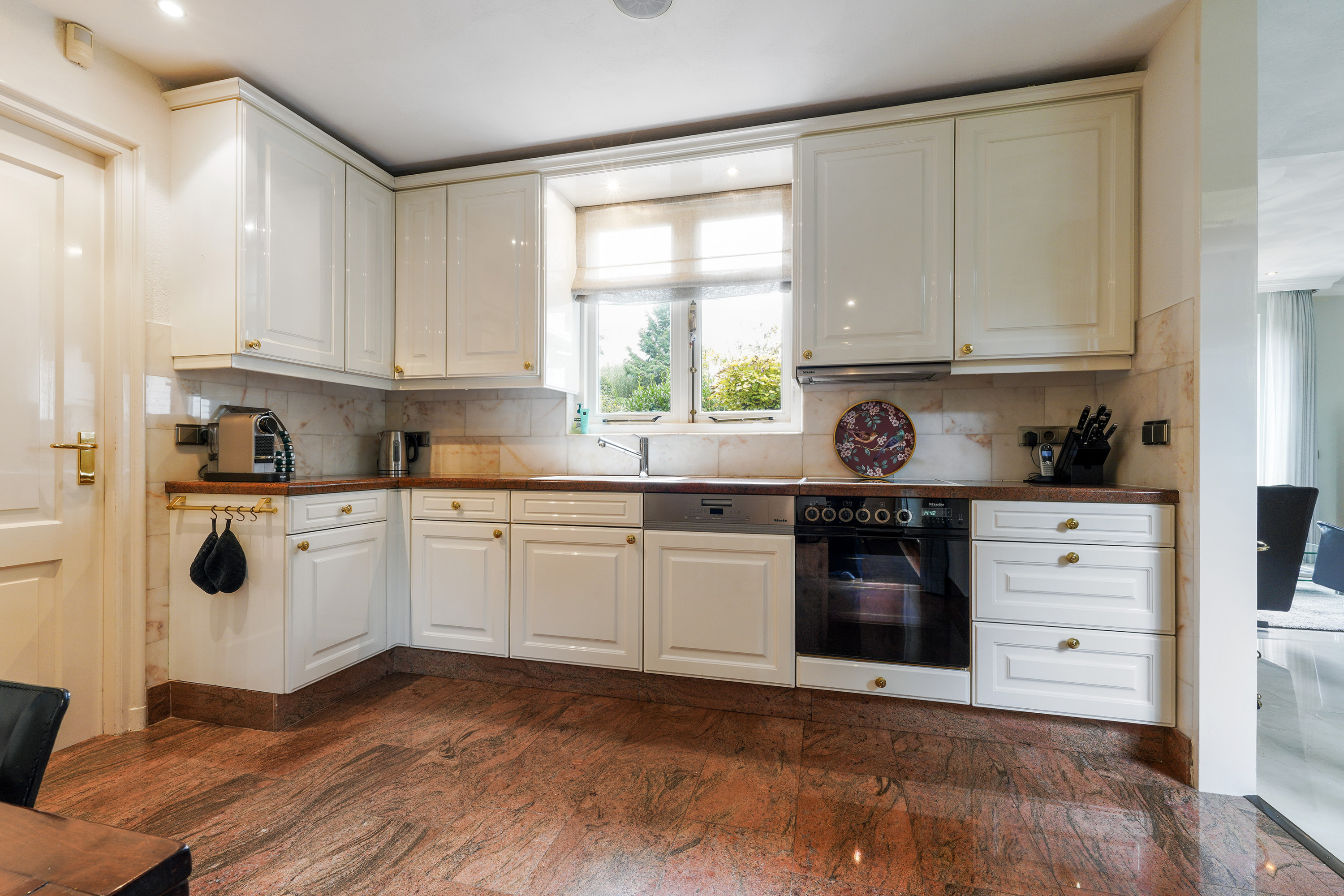 The kitchen is a wonderful place for those who love to cook and gather. The built-in cabinetry with various integrated appliances and the large natural stone worktop provide plenty of workspace and storage. Adjacent is the practical utility room with connections for a washing machine and dryer, and access to a spacious indoor storage area of no less than 17 m², fitted with built-in cupboards and a sink. This space also features a loft, ideal for additional storage. From the hallway on the ground floor, a cellar is accessible — a perfect extra space for provisions or a wine collection.