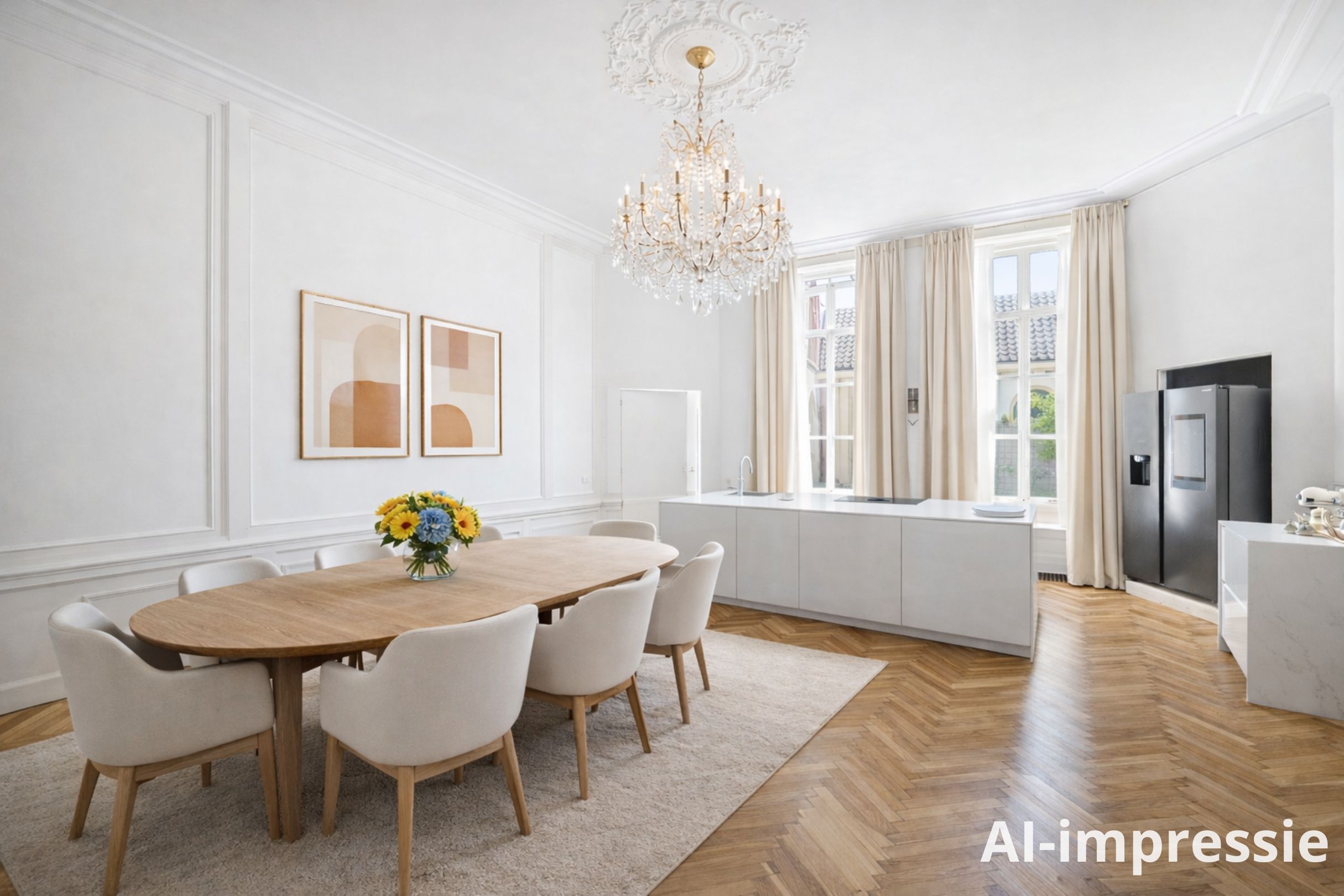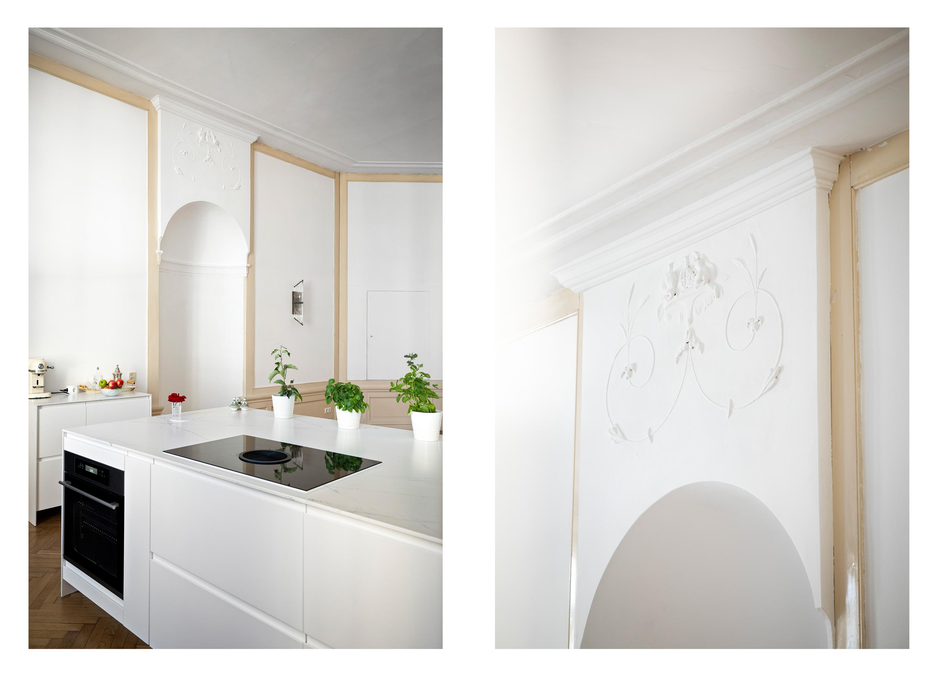 To the right: a living room and kitchen en suite. The flooring is warm oak in a classic herringbone pattern. The walls are freshly plastered in white, and the woodwork is finished in classic Bentheimer yellow. These rooms are surprisingly versatile — they can accommodate anything from sleek minimalist design to vibrant, art-filled spaces, even children’s bikes and dollhouses — everything finds its place here.