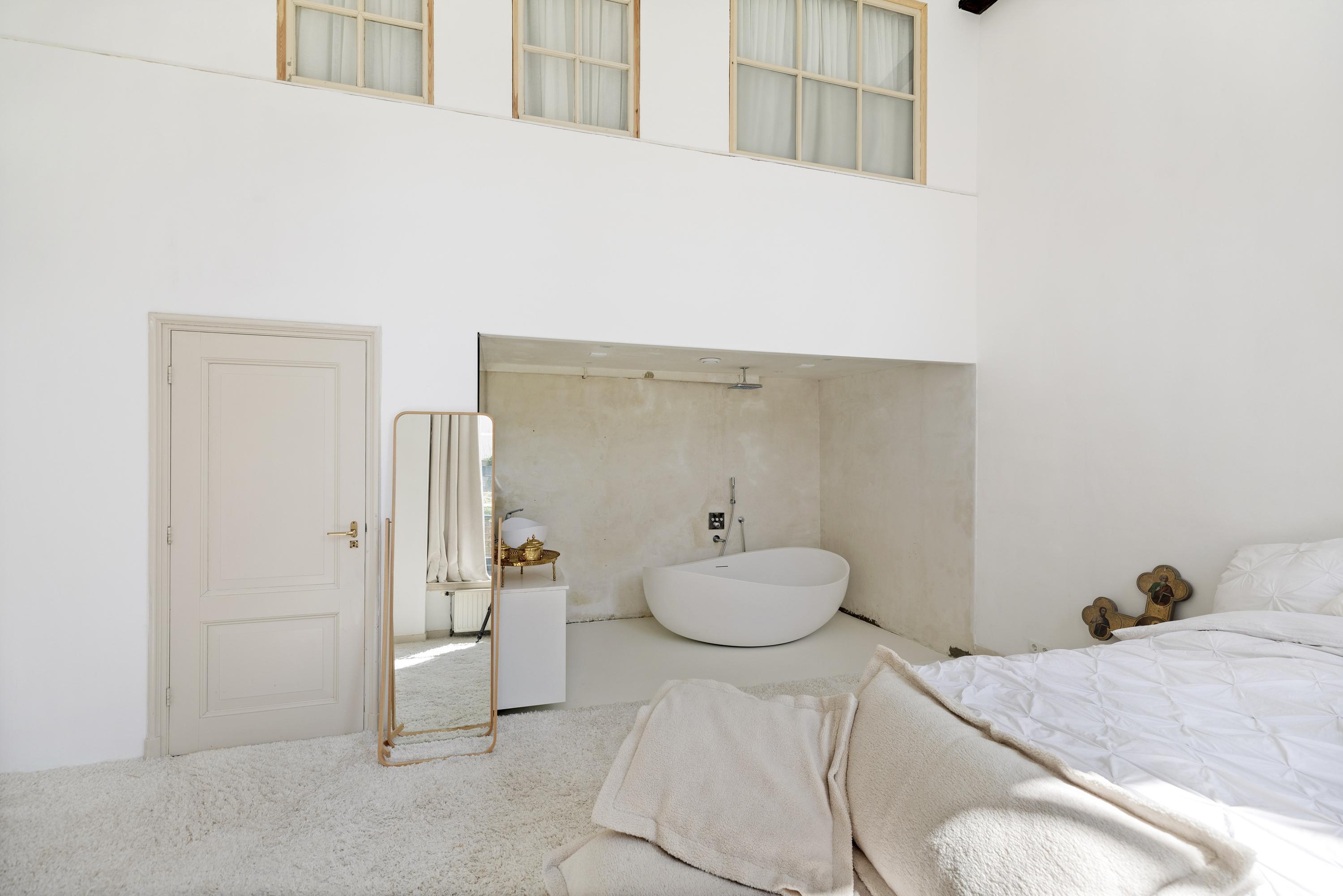 The third bedroom is a luxurious, photogenic master suite, featuring plush carpeting and an ensuite bathroom with a large freestanding bathtub and double sinks in the niche.