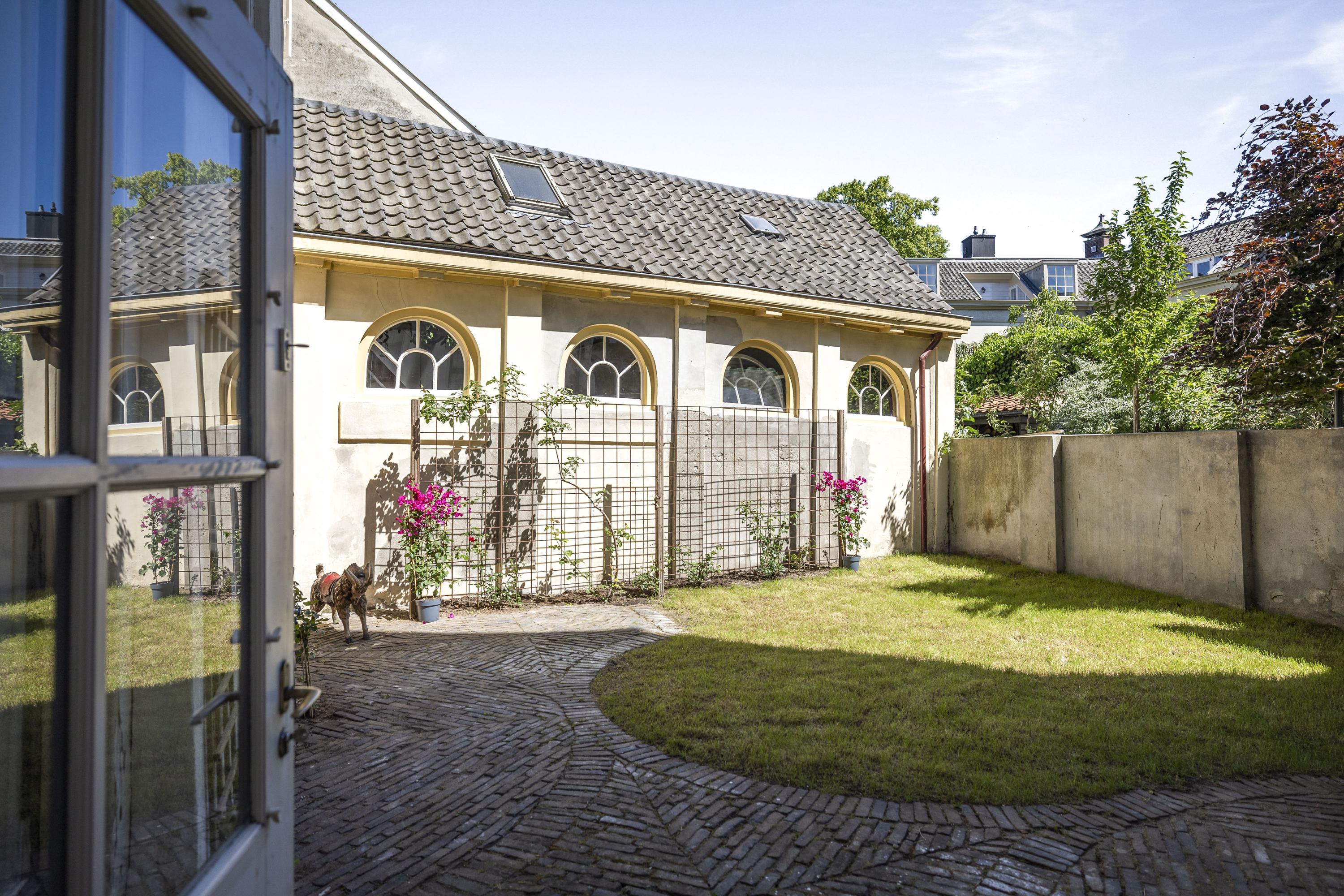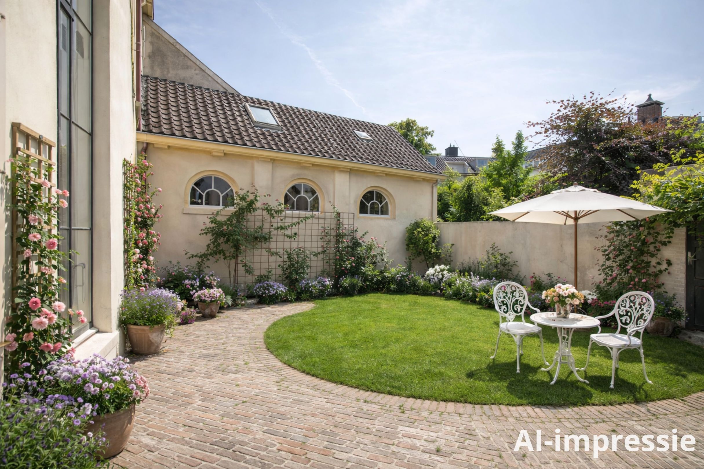 The rear of the house faces east — so plenty of morning sun. The garden includes a decorative paved terrace and a lawn. Climbing roses adorn the garden walls. There is also a small shed for garden tools.