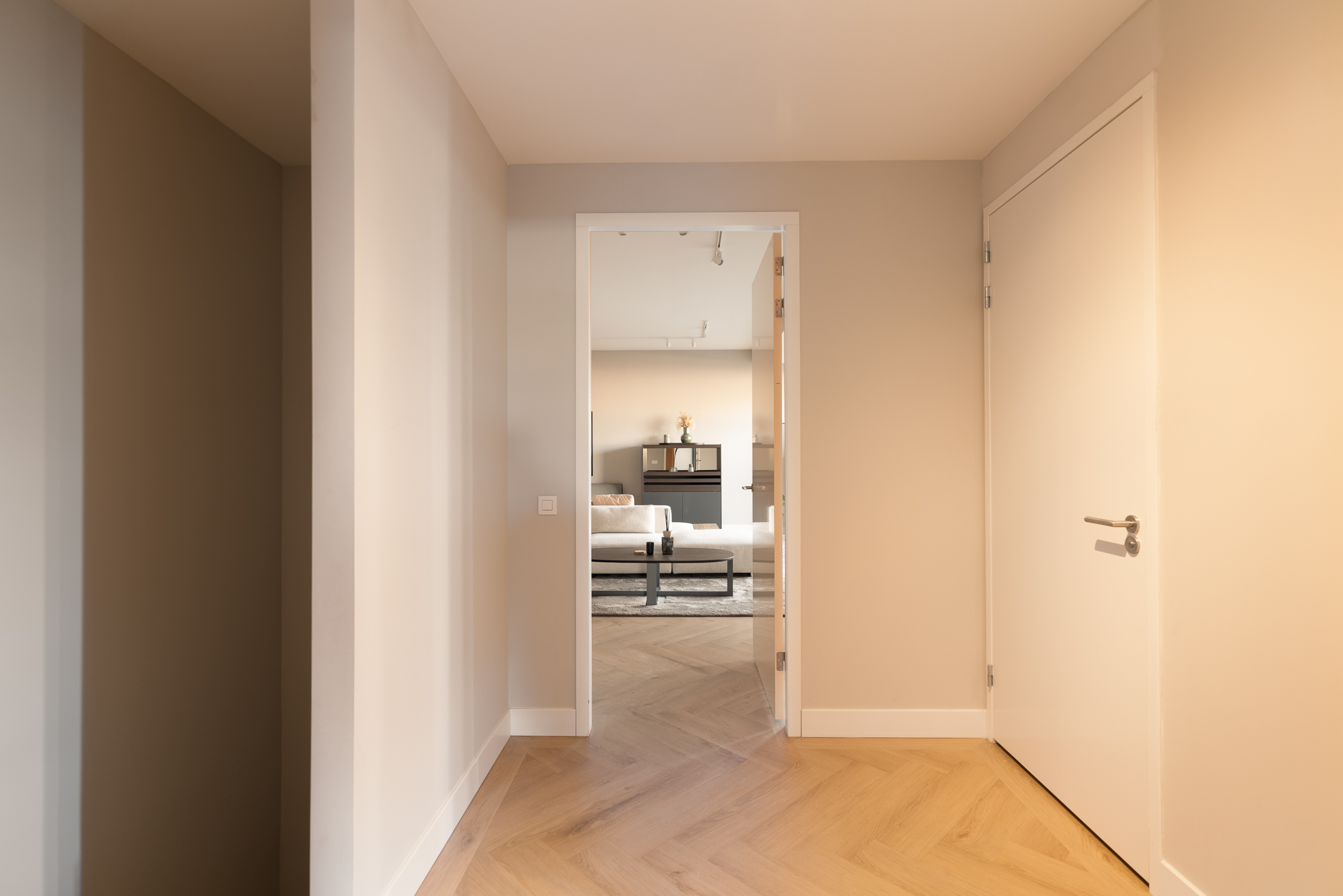 Un vaste séjour d'environ 90 m² réunit un salon sur mesure, un espace repas élégant et une cuisine ouverte contemporaine équipée d'appareils haut de gamme et d’un large îlot. La lumière naturelle traverse les grandes baies vitrées, reliant les espaces de vie à un jardin privé à l’avant et à une vaste terrasse filant sur toute la largeur de l’appartement à l’arrière.