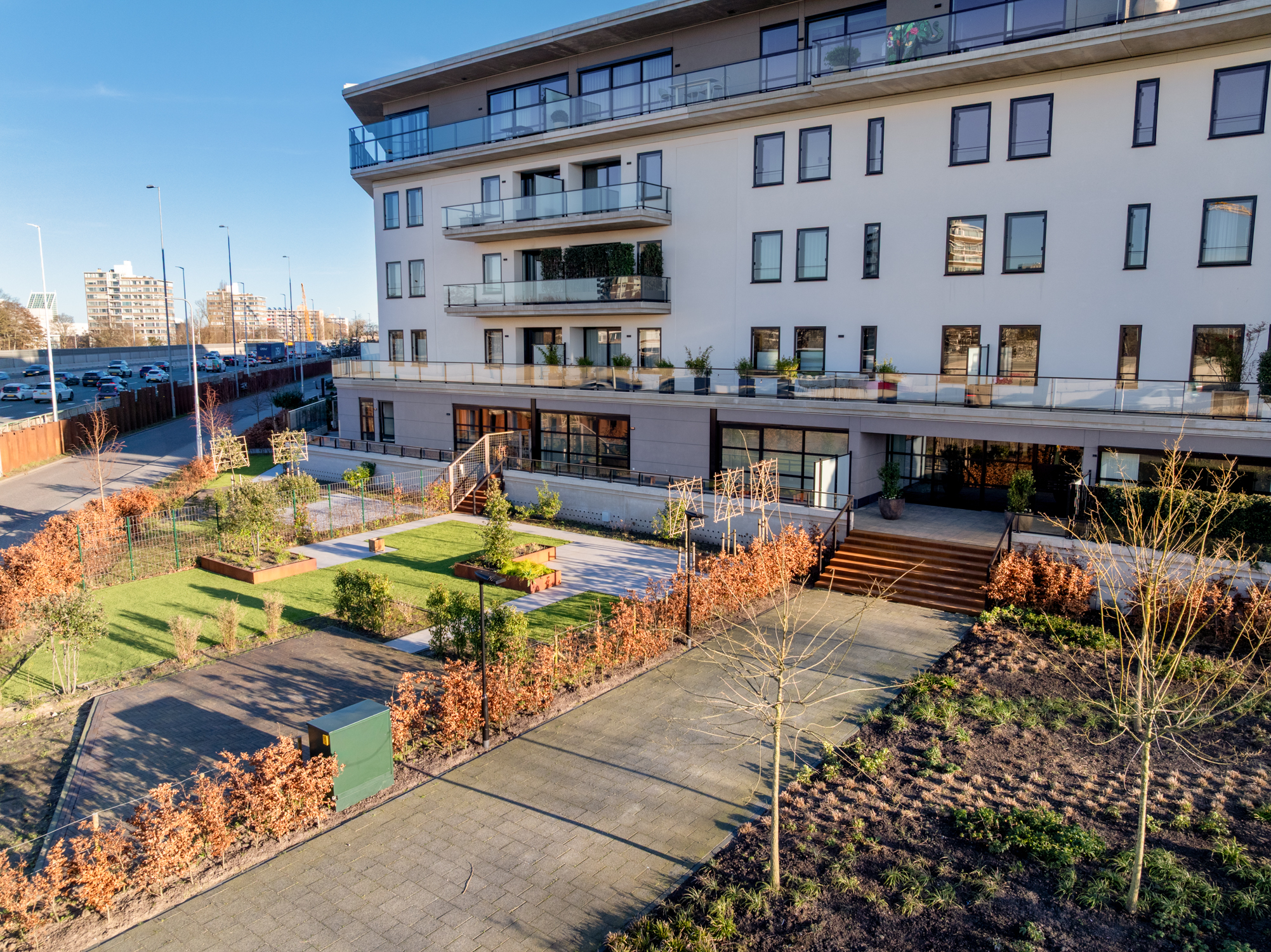 Les prestations incluent un service de conciergerie M-Exclusive, un lounge réservé aux résidents, une salle de sport et un studio Pilates entièrement équipés, ainsi que des systèmes de sécurité de pointe. La renommée du complexe The Mayor pour sa qualité, sa proximité avec le centre d’Amstelveen, ses infrastructures haut de gamme, les transports et les grands axes offrent un équilibre parfait entre confort, intimité et praticité. Le confort thermique est assuré par un chauffage au sol, une pompe à chaleur, un système avancé de récupération de chaleur et une isolation intégrale permettant d’atteindre la classe énergétique A_P.