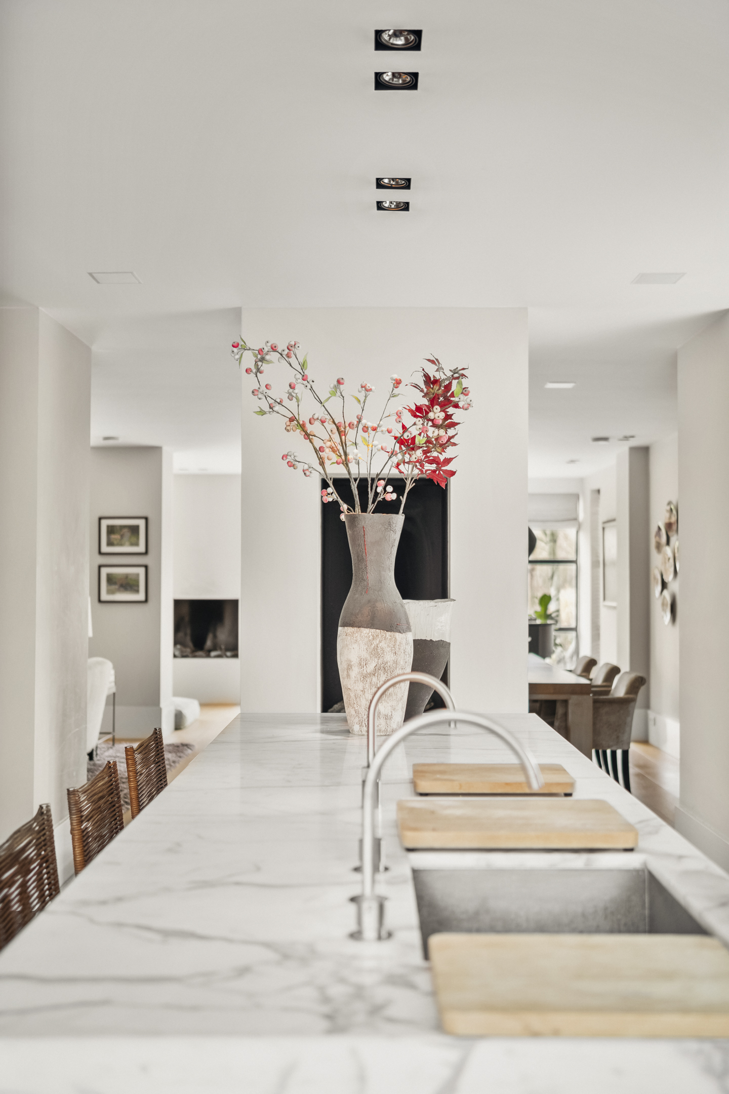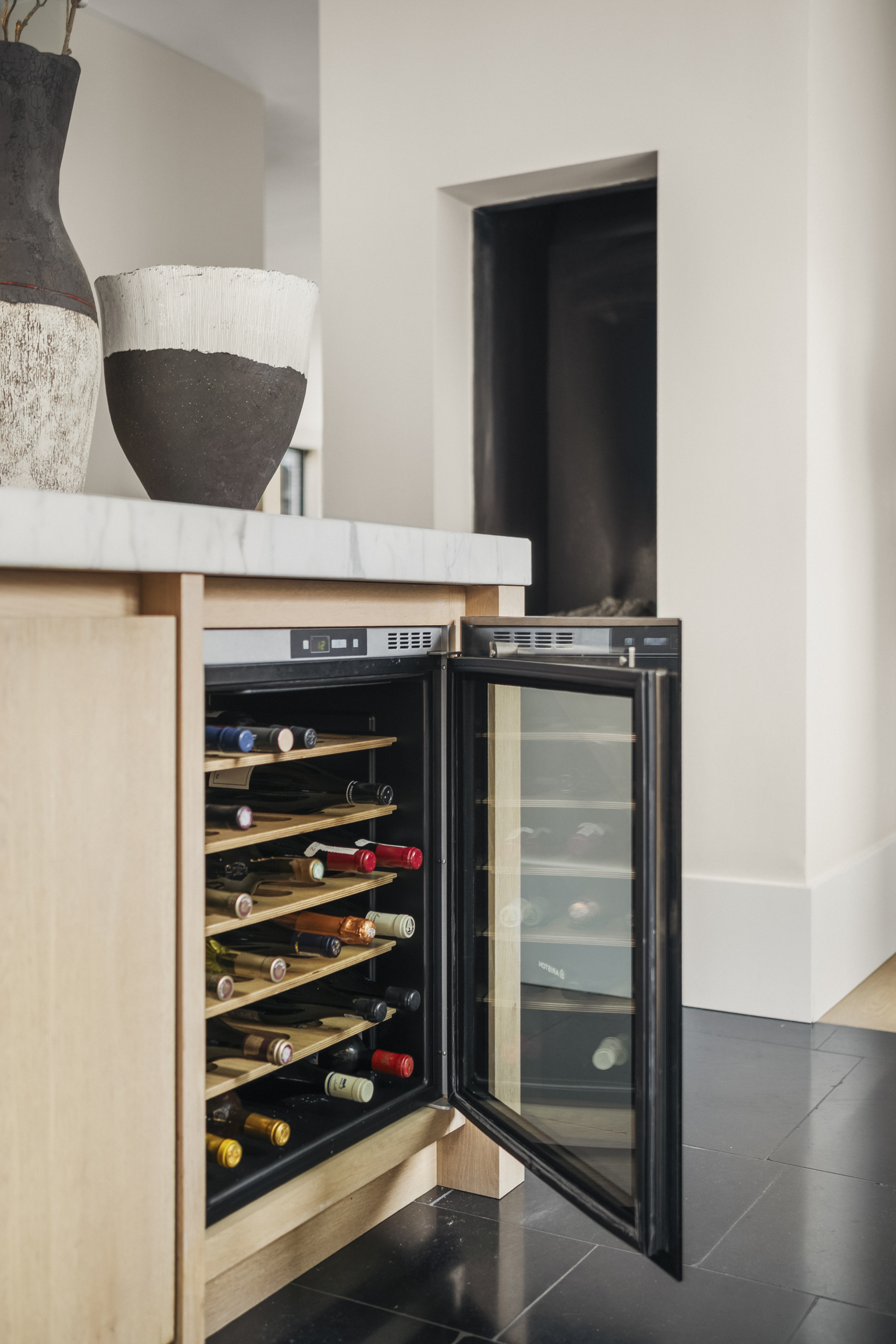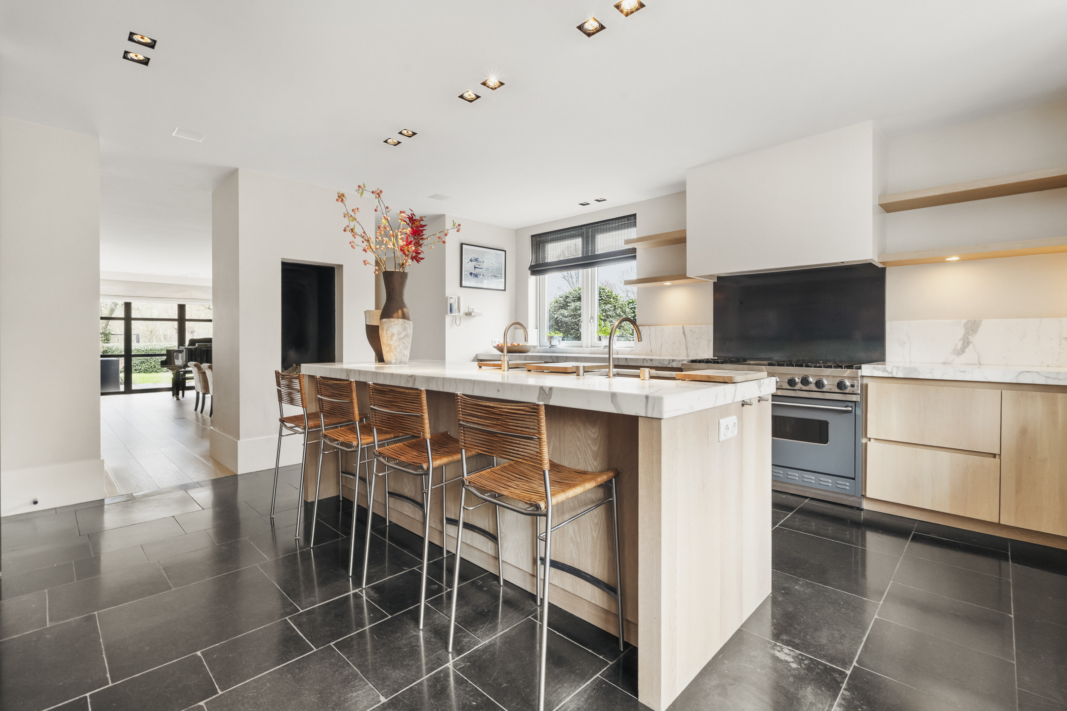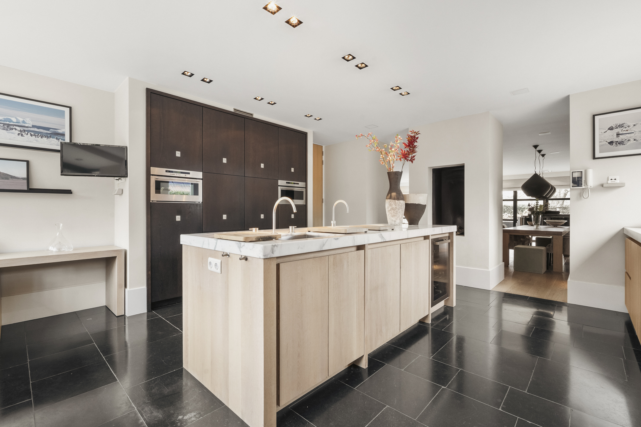 À l’intérieur, l’agencement spacieux sépare élégamment les espaces de vie et de nuit. Le sous-sol sur toute la surface, avec 2,55 mètres de hauteur sous plafond, conjugue fonctionnalité et ambiance, comprenant une cave à vin dédiée, des espaces de rangement et un salon polyvalent. Le rez-de-chaussée s’ouvre par un hall impressionnant sur deux niveaux vers un séjour baigné de lumière, doté de trois cheminées et de portes-fenêtres menant au jardin orienté ouest. La vaste cuisine invite aux repas partagés et aux rituels du quotidien, bénéficiant d’un accès direct au jardin. Un bureau, équipé de mobilier sur mesure, s’ouvre sur la terrasse ensoleillée, offrant un cadre idéal pour travailler ou se détendre face à la verdure.