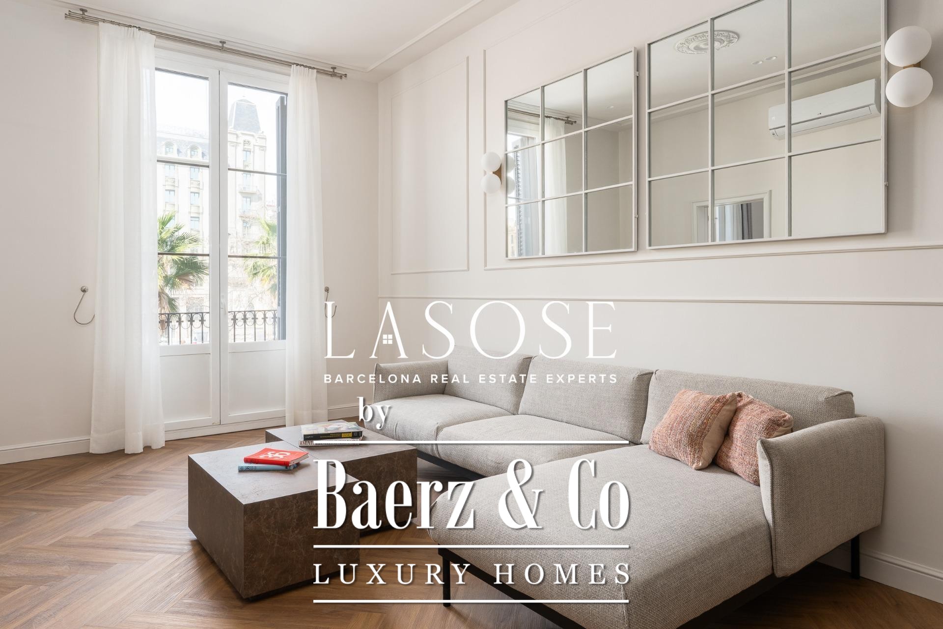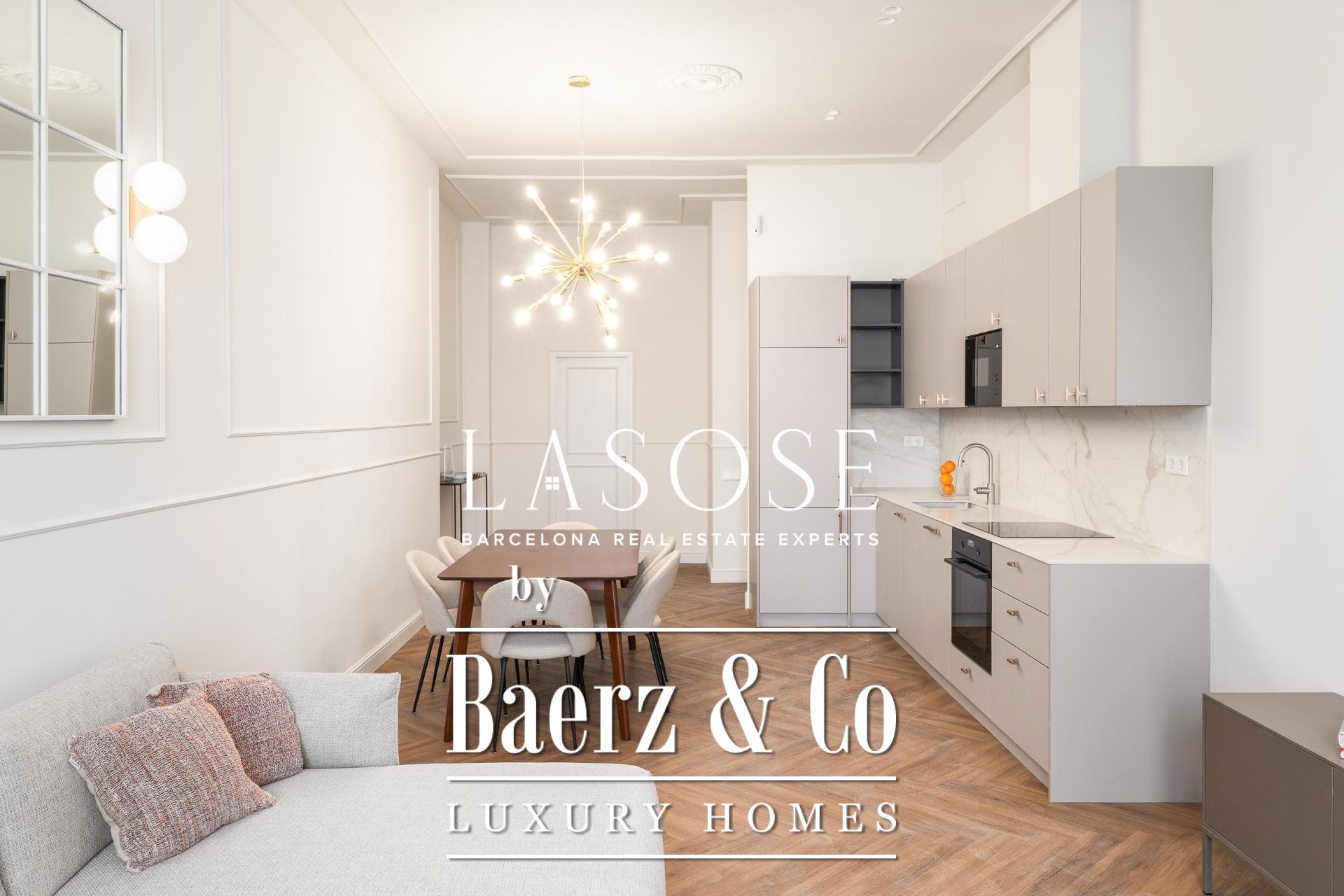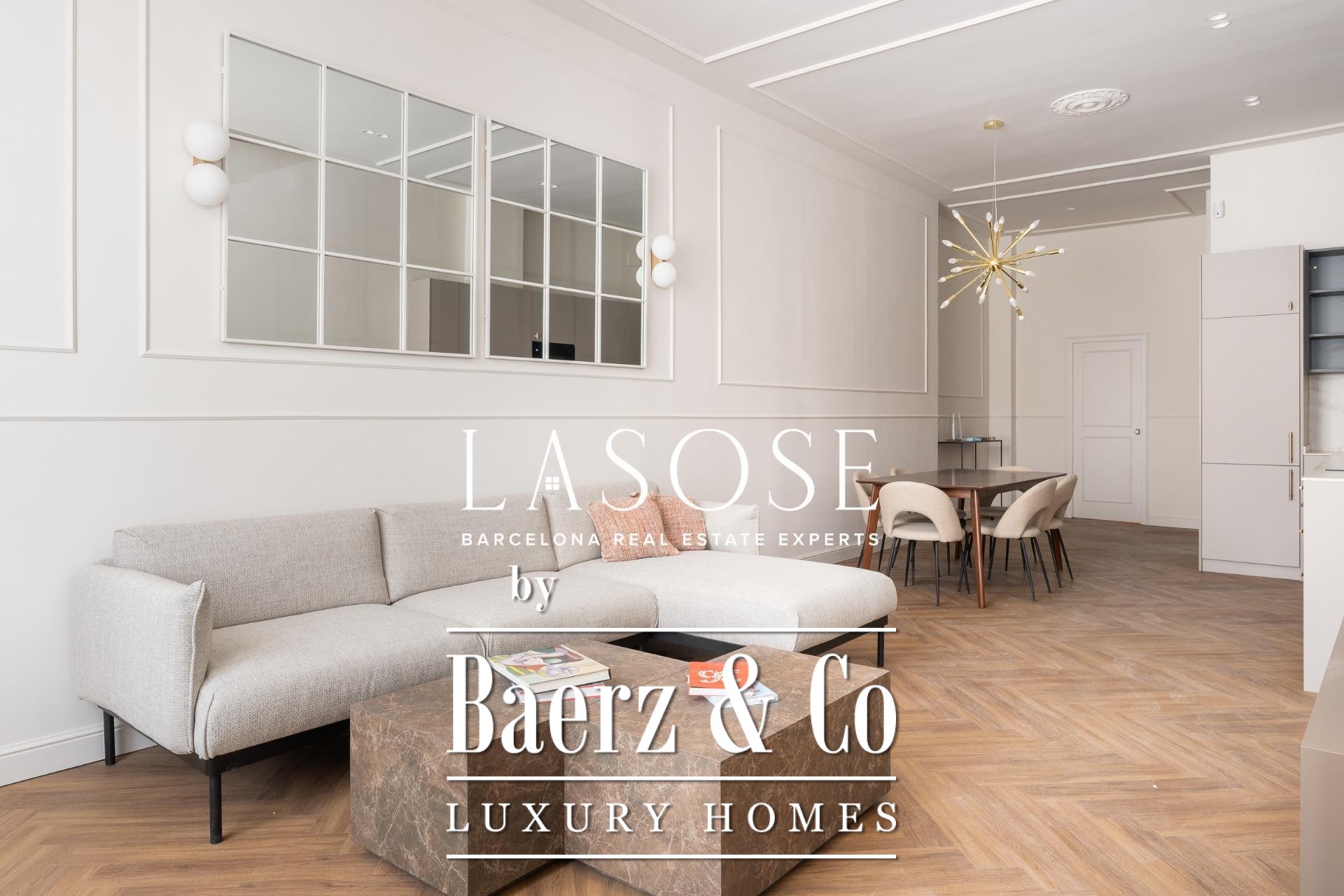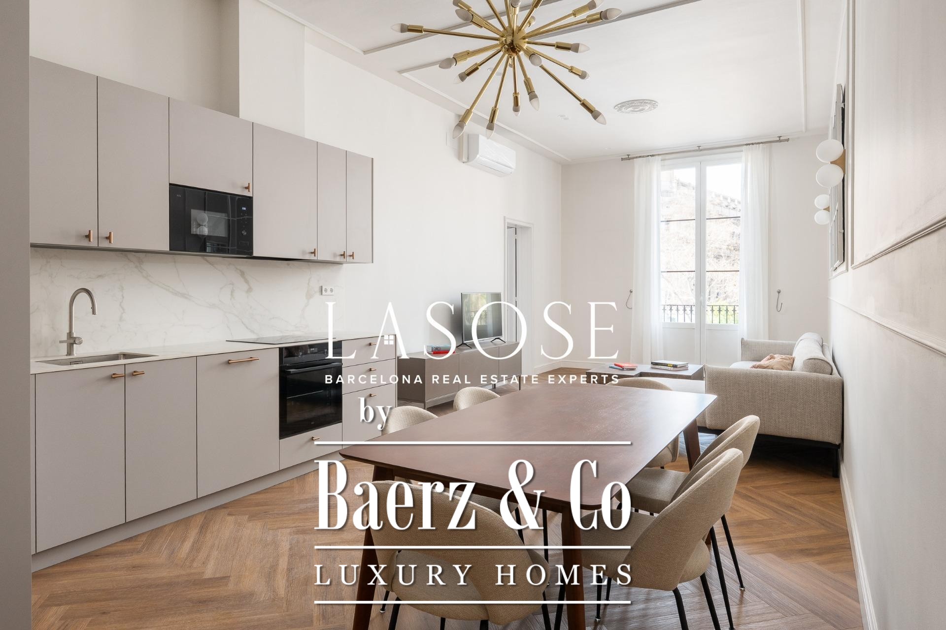 L'appartement à Barcelone se réinvente dans cette résidence exceptionnelle de 118 m², résultat d'une rénovation minutieuse au sein d'un immeuble historique de 1850, aujourd'hui classé au Patrimoine Local. Ce bien réalise une harmonie rare entre le caractère architectural préservé et les standards du luxe contemporain. Dès l'entrée, un sentiment d'espace et de raffinement vous accueille, avec un séjour et une salle à manger ouverts, baignés de lumière naturelle par de généreuses fenêtres donnant sur le Paseo Isabel II. Le mobilier de créateur et les finitions haut de gamme subliment chaque instant passé ici.