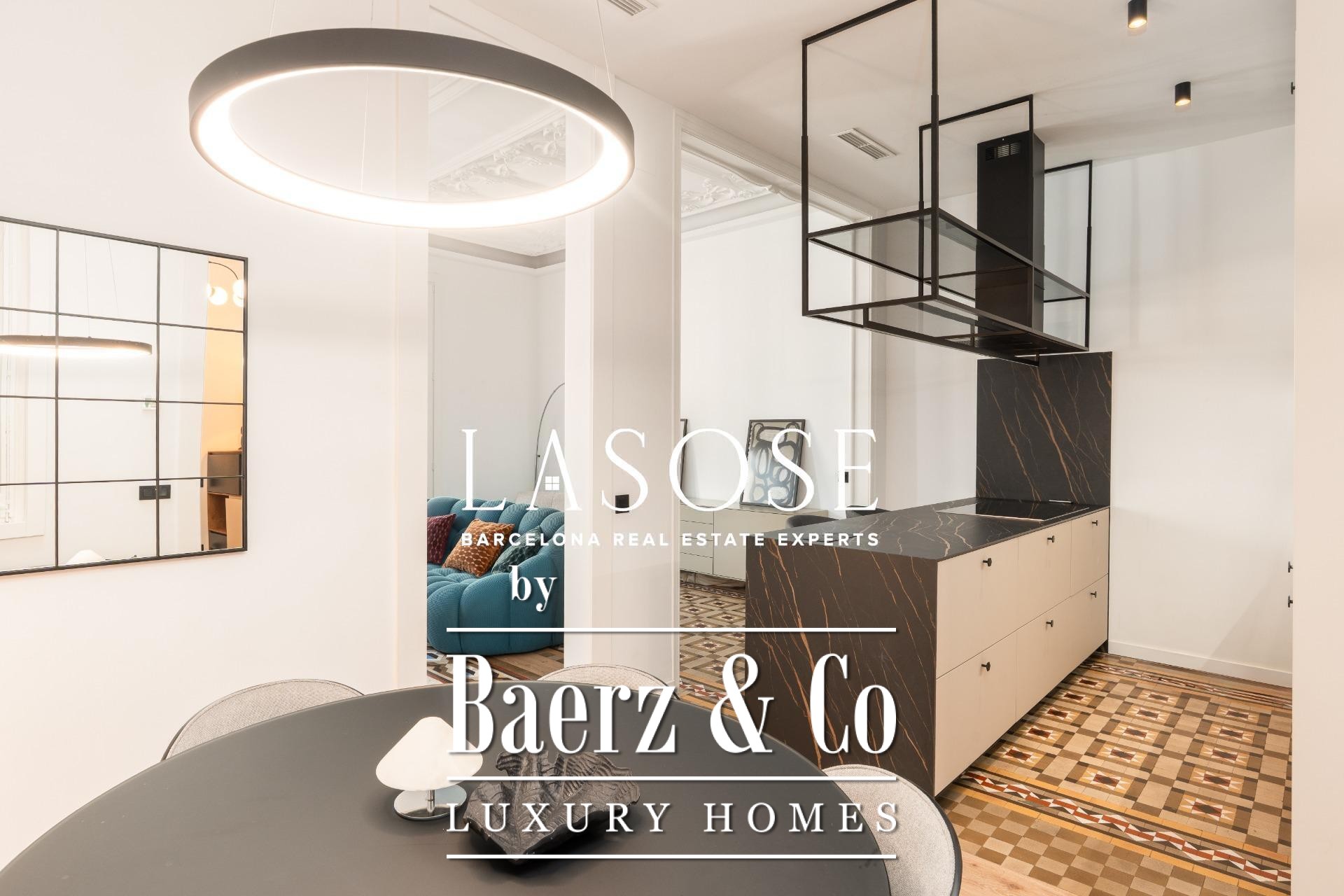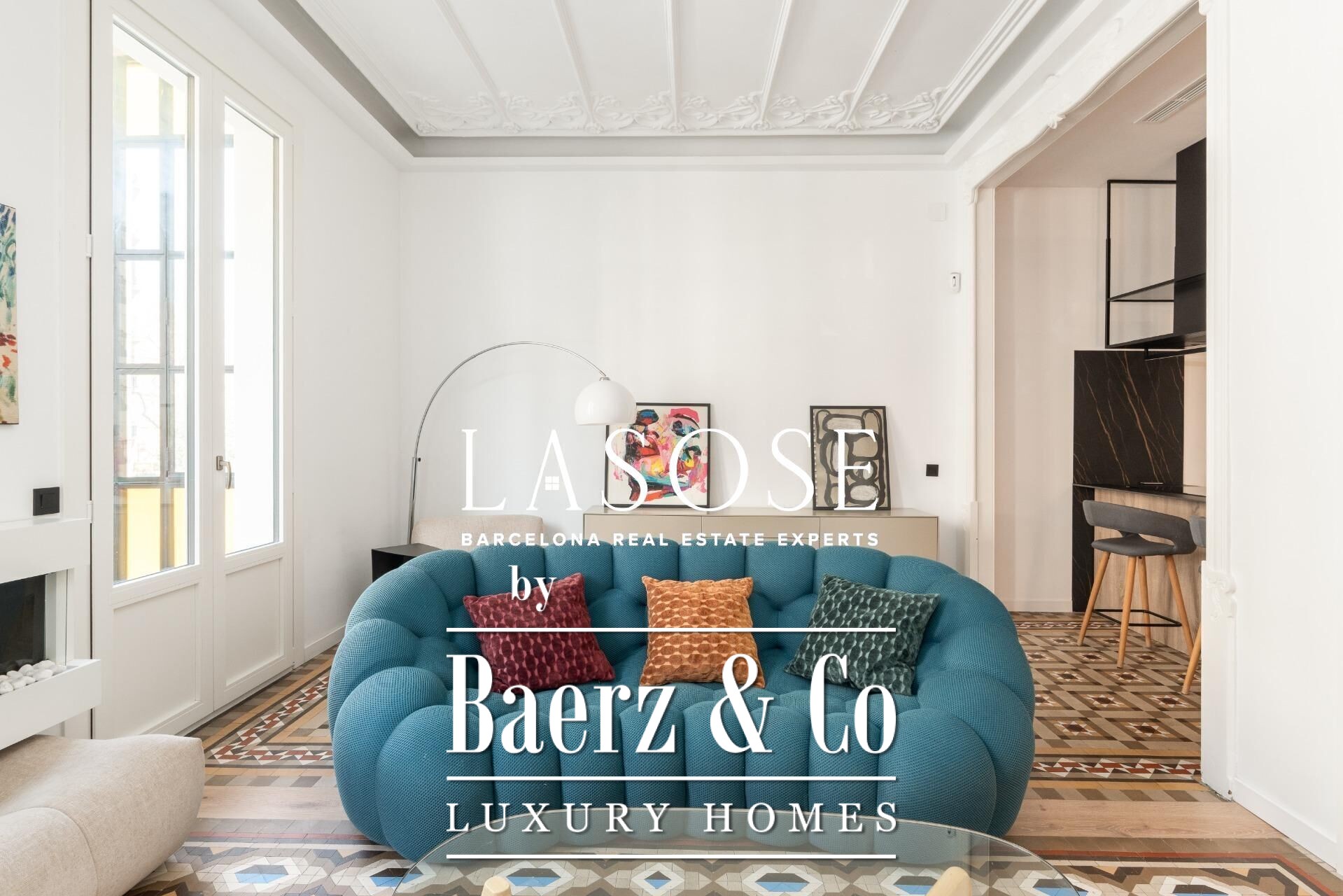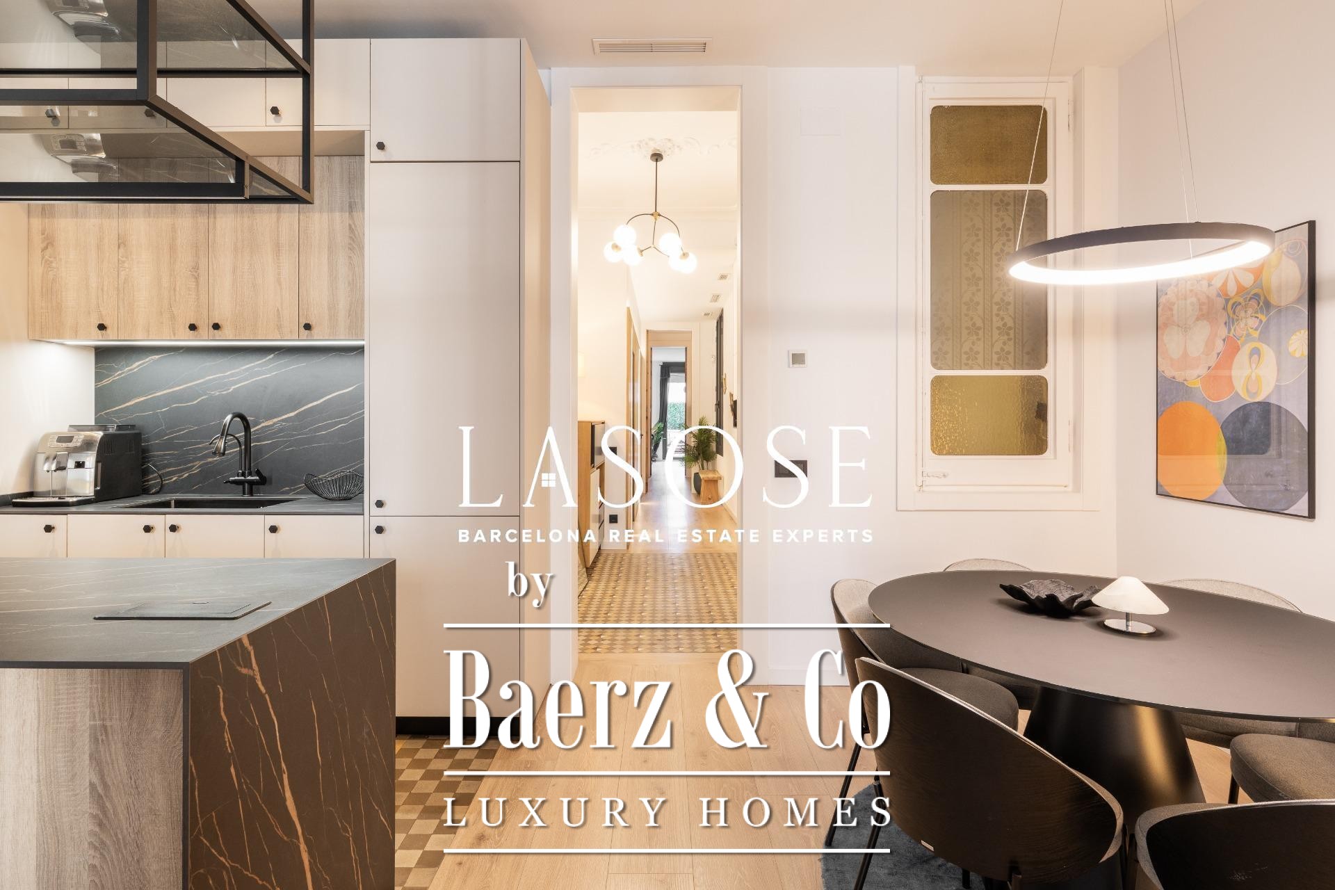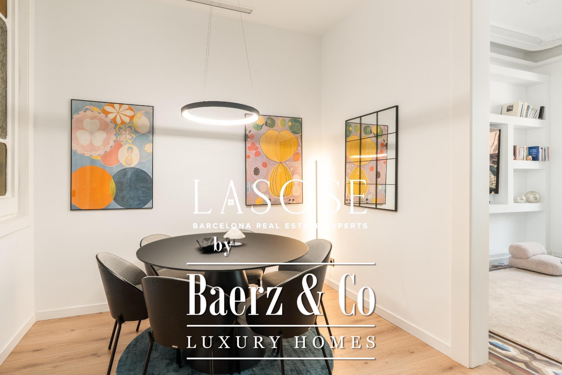 L'appartement Barcelona Eixample bénéficie d'un emplacement paisible au premier étage principal d'un immeuble moderniste protégé, à proximité du Passeig de Sant Joan. Achevée il y a seulement deux ans, la rénovation la plus récente marie subtilement luxe contemporain et charme d'origine, mettant en valeur les sols en mosaïque hydraulique Nolla, les hauts plafonds ornés de moulures décoratives et des détails architecturaux raffinés dans l'ensemble de l'espace.