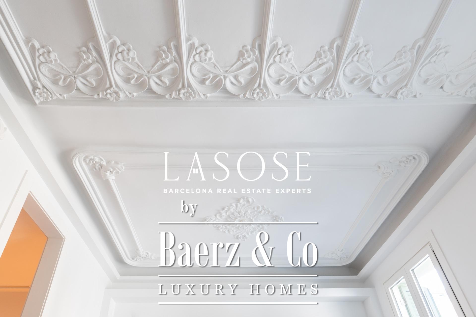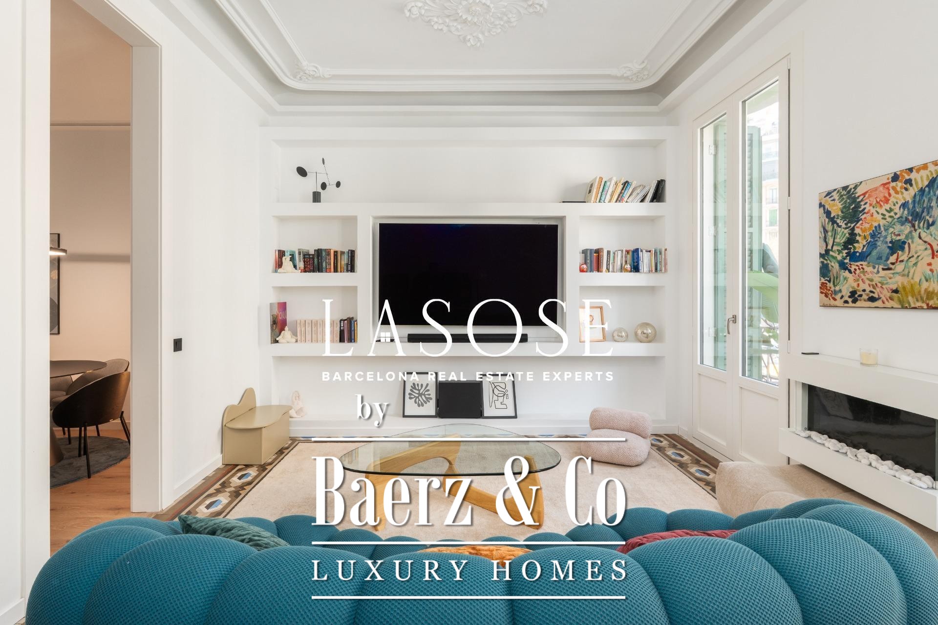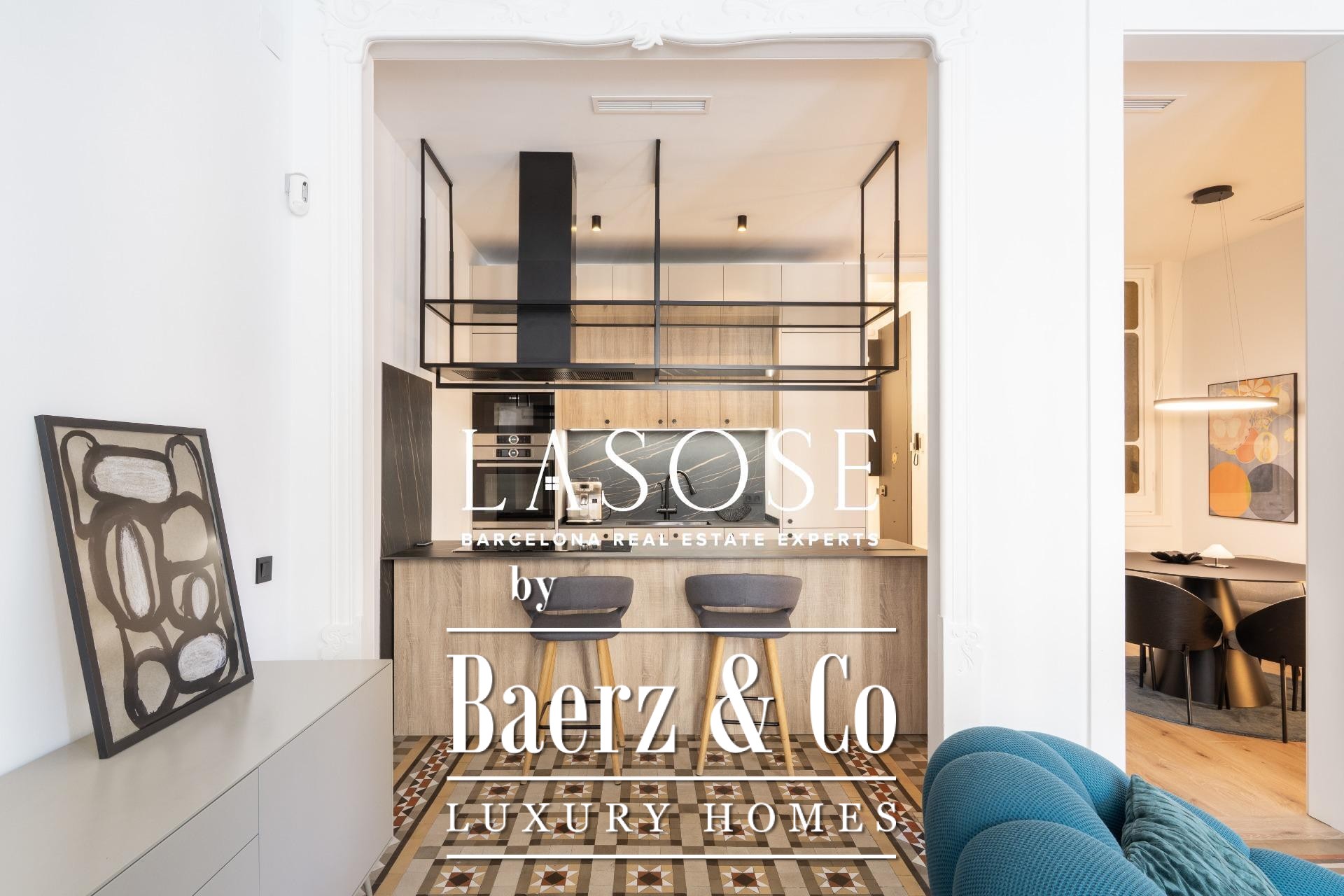 L'appartement Barcelona Eixample bénéficie d'un emplacement paisible au premier étage principal d'un immeuble moderniste protégé, à proximité du Passeig de Sant Joan. Achevée il y a seulement deux ans, la rénovation la plus récente marie subtilement luxe contemporain et charme d'origine, mettant en valeur les sols en mosaïque hydraulique Nolla, les hauts plafonds ornés de moulures décoratives et des détails architecturaux raffinés dans l'ensemble de l'espace.