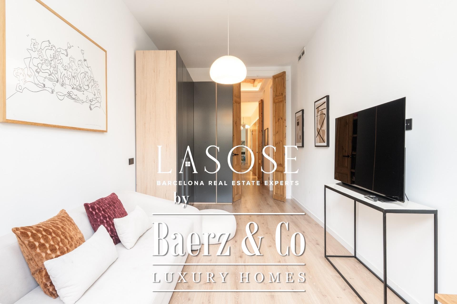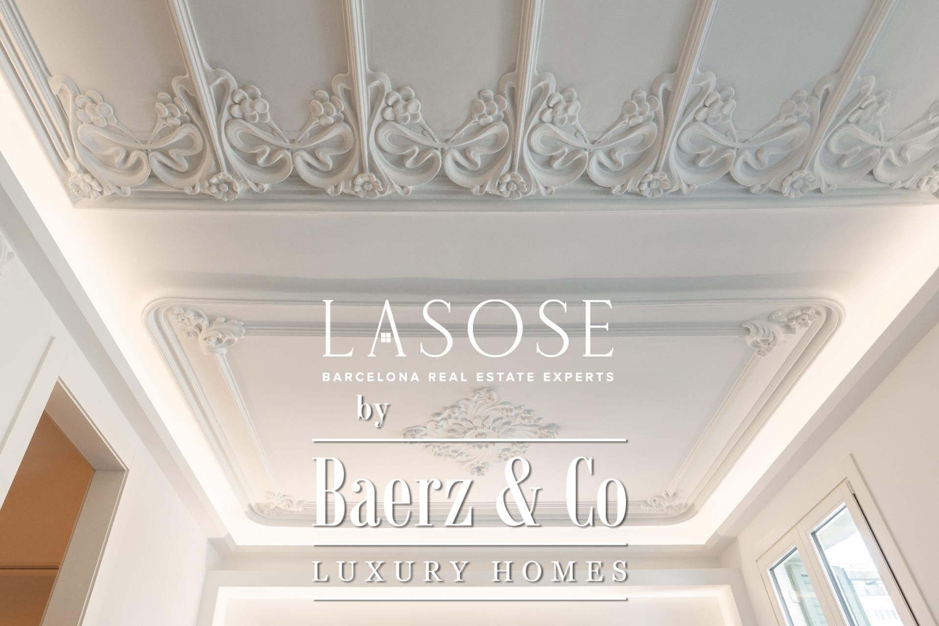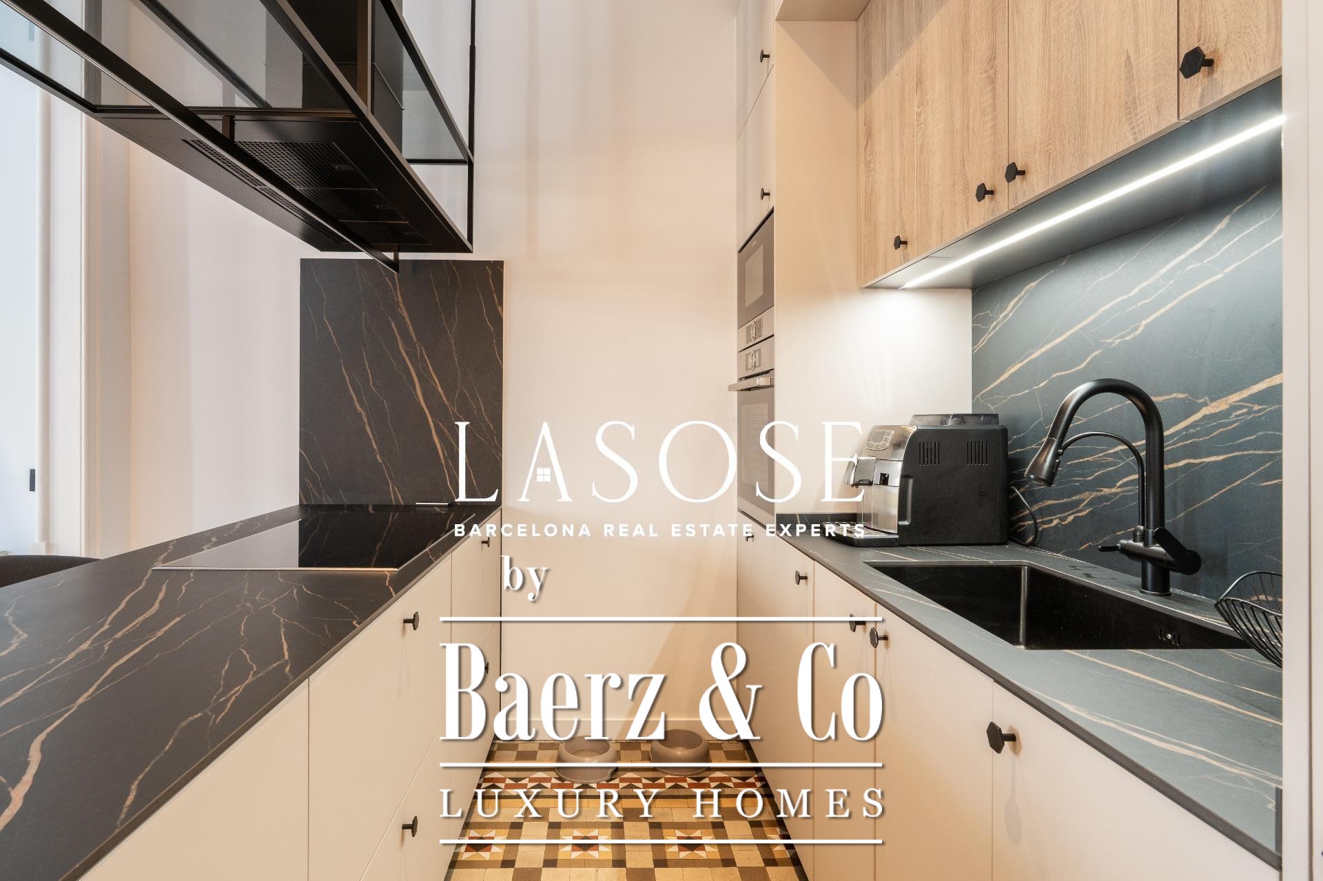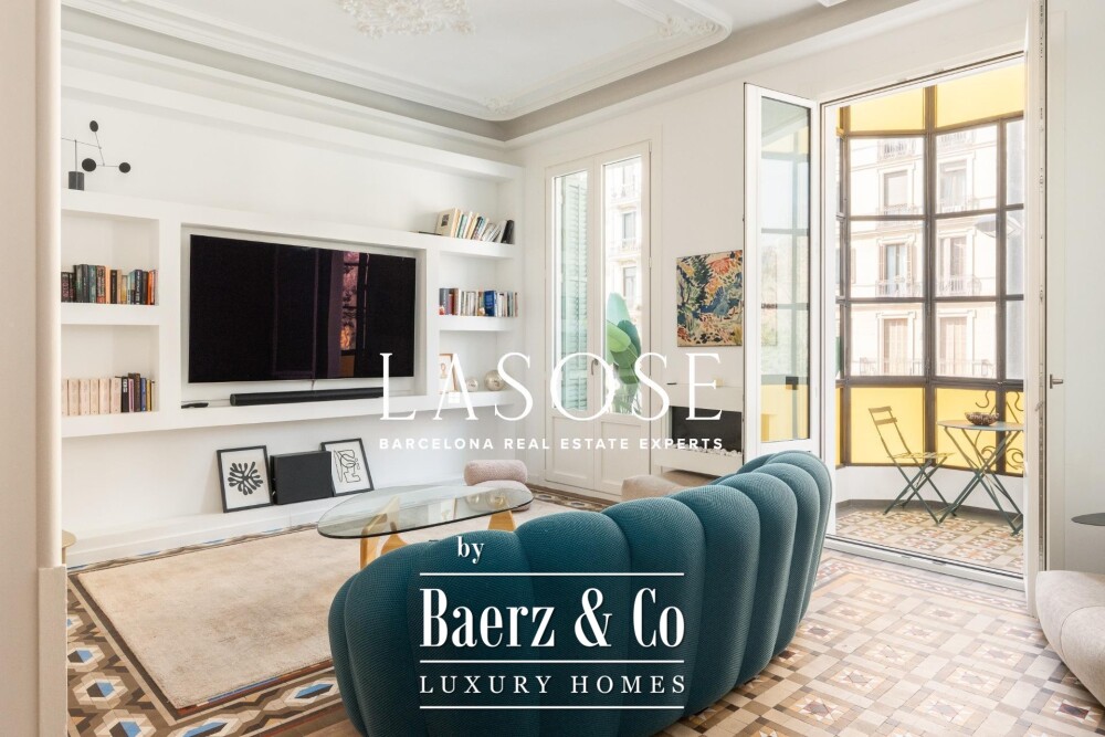 L'appartement Barcelona Eixample bénéficie d'un emplacement paisible au premier étage principal d'un immeuble moderniste protégé, à proximité du Passeig de Sant Joan. Achevée il y a seulement deux ans, la rénovation la plus récente marie subtilement luxe contemporain et charme d'origine, mettant en valeur les sols en mosaïque hydraulique Nolla, les hauts plafonds ornés de moulures décoratives et des détails architecturaux raffinés dans l'ensemble de l'espace.