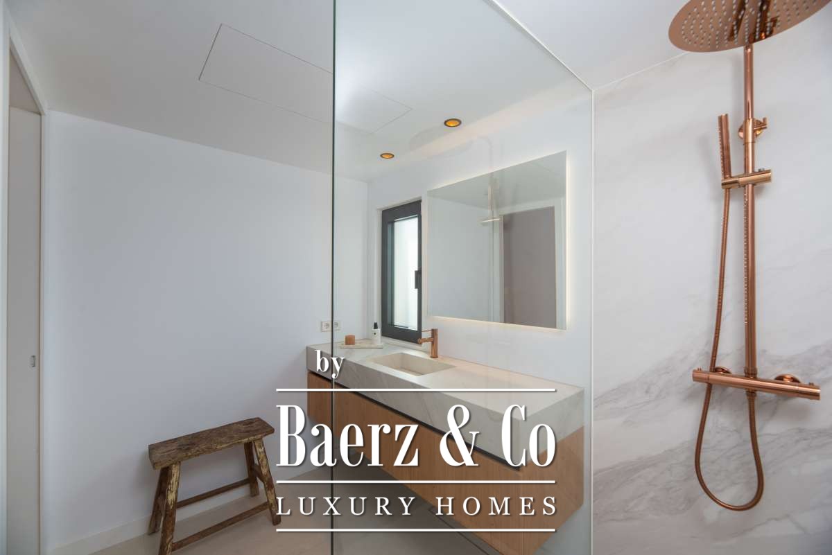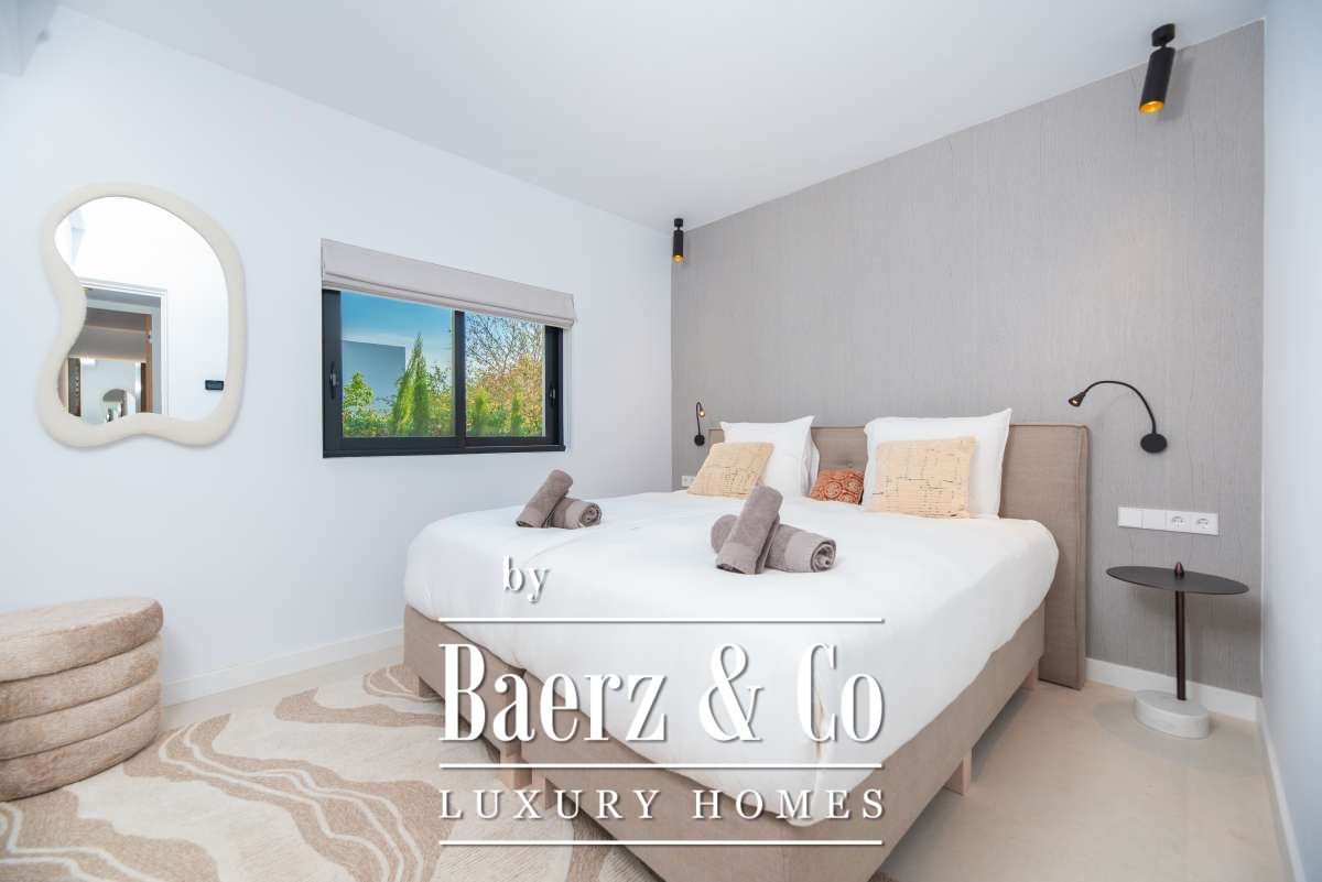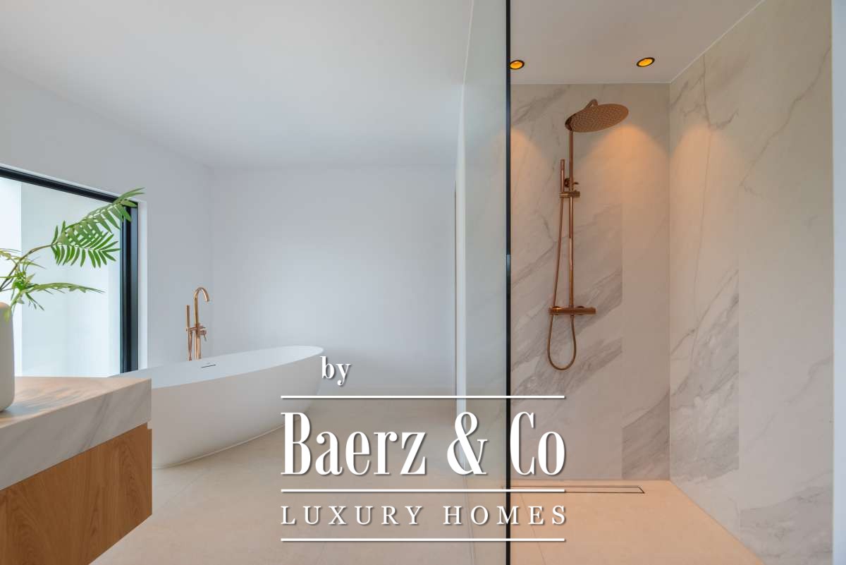 Chacune des cinq chambres spacieuses dispose de sa salle de bains attenante, agrémentée de finitions en marbre, de robinetterie dorée et de douches à l’italienne. La suite parentale bénéficie d’une baignoire indépendante et de vues sereines sur la campagne. Les espaces de vie ouverts sont sublimés par une cheminée moderne, un élégant bar en marbre dans la cuisine, un chauffage au sol et la climatisation pour un confort tout au long de l’année.