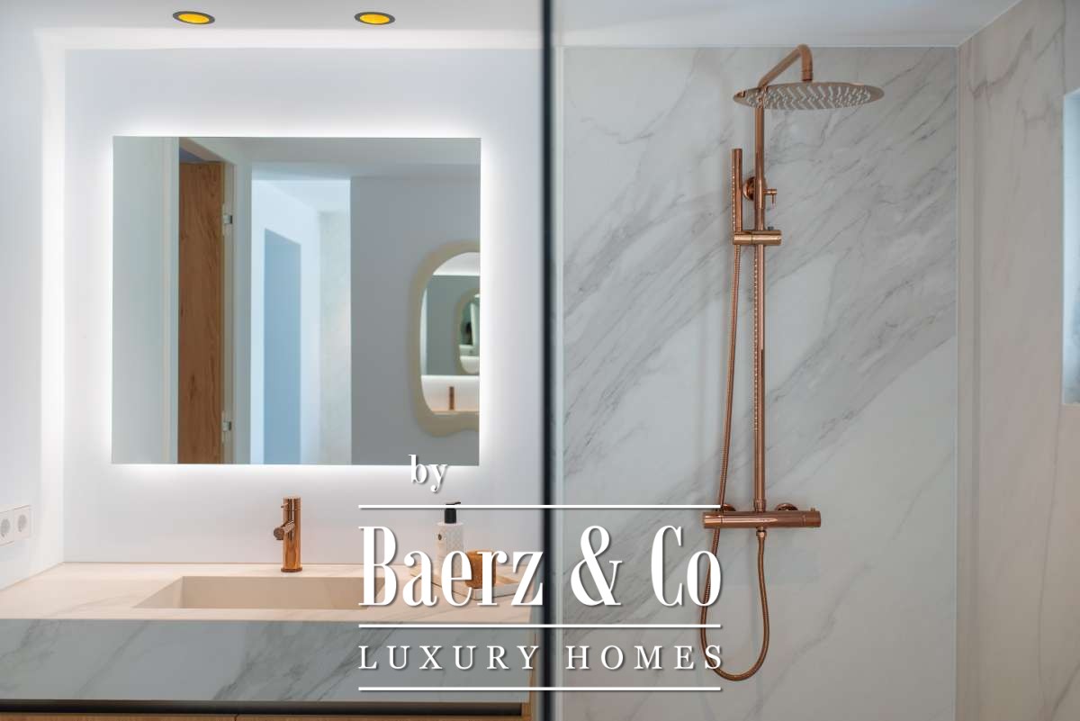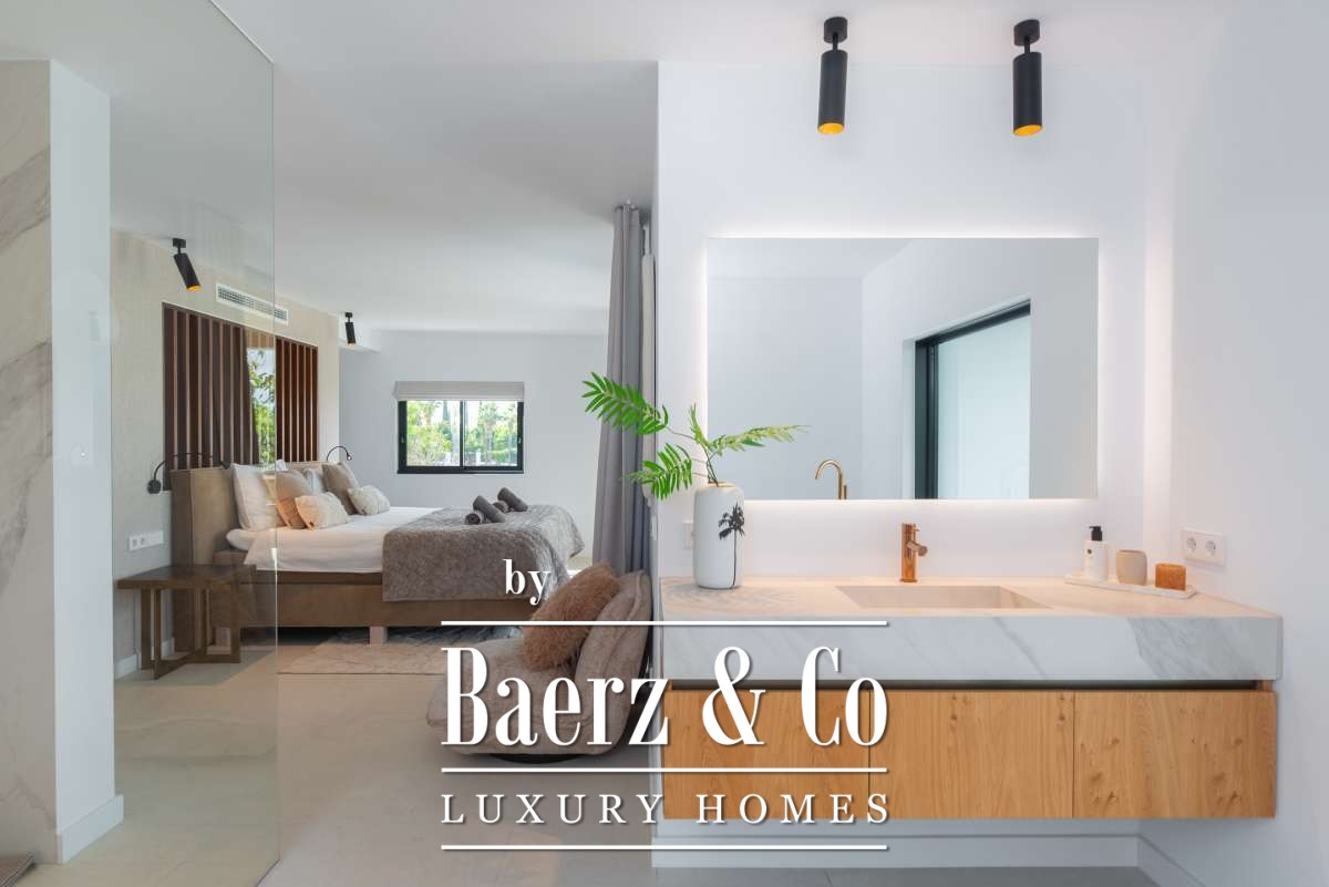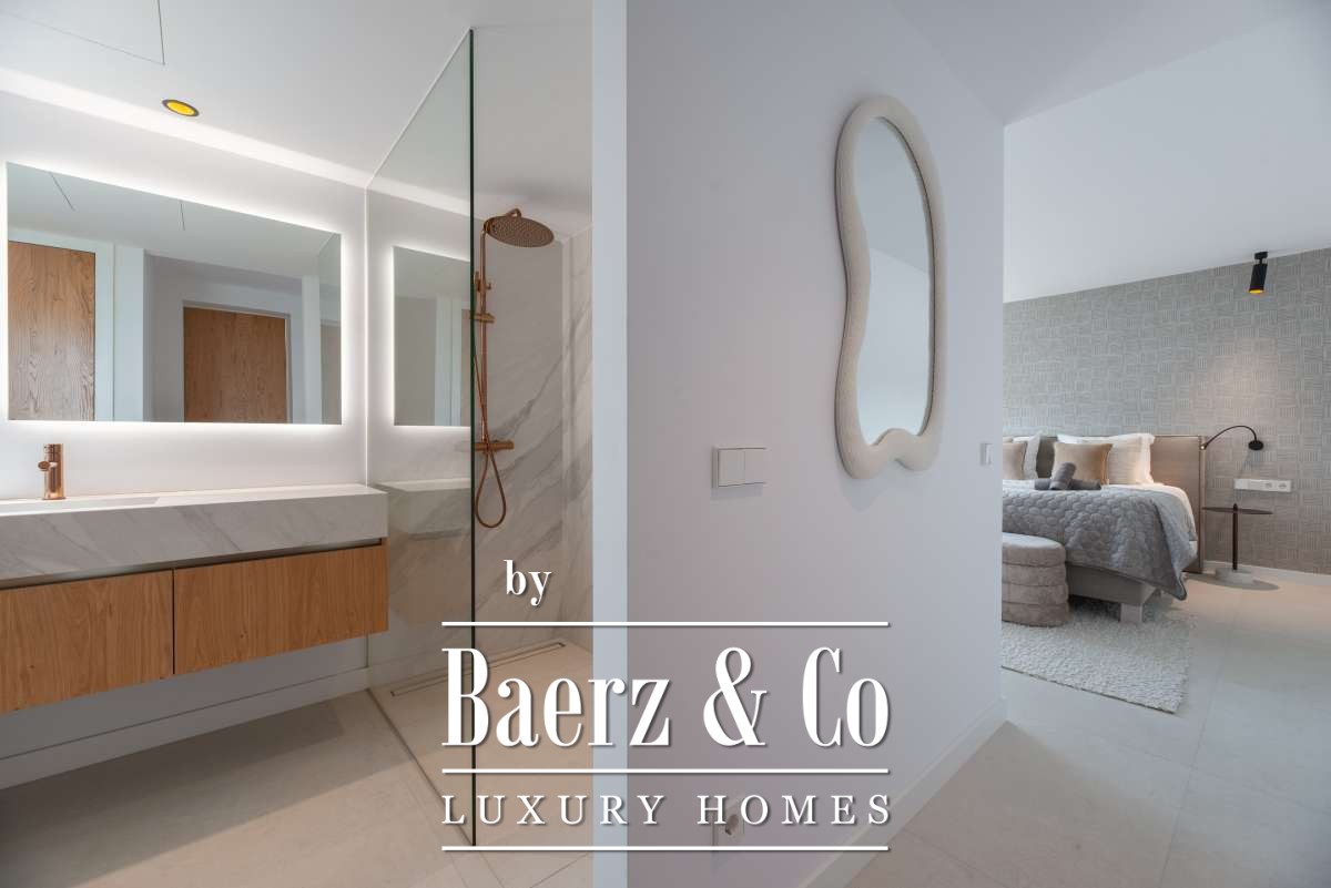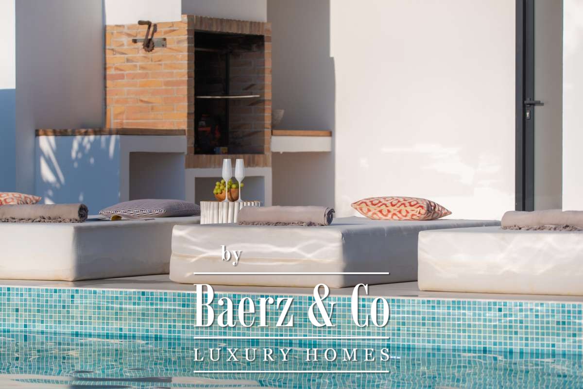 Chacune des cinq chambres spacieuses dispose de sa salle de bains attenante, agrémentée de finitions en marbre, de robinetterie dorée et de douches à l’italienne. La suite parentale bénéficie d’une baignoire indépendante et de vues sereines sur la campagne. Les espaces de vie ouverts sont sublimés par une cheminée moderne, un élégant bar en marbre dans la cuisine, un chauffage au sol et la climatisation pour un confort tout au long de l’année.