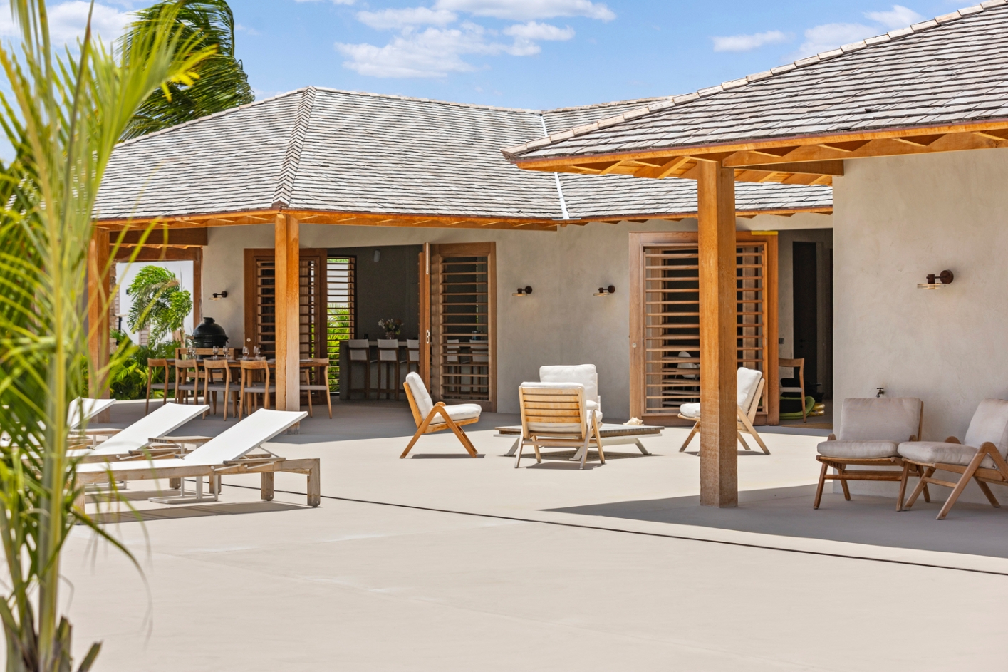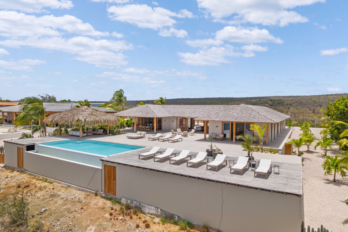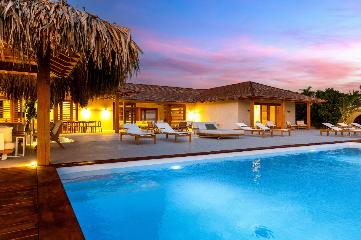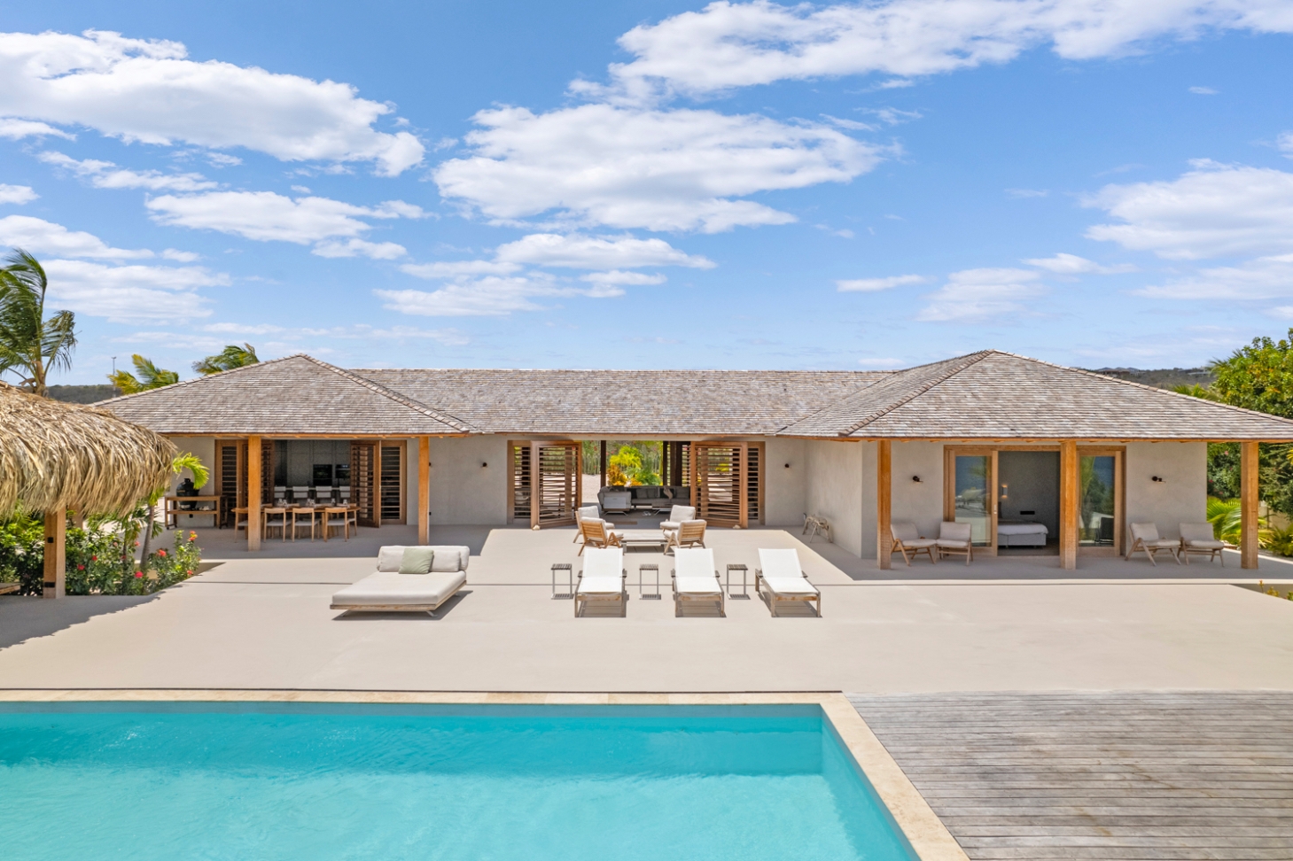 Le séjour, doté de hauts plafonds en bois et de vastes ouvertures, communique harmonieusement avec la terrasse de la piscine de 100 m² et la piscine au magnésium, agrémentées d’une palapa ombragée et d’un espace lounge pour une vie extérieure paisible. La cuisine ouverte se distingue par des appareils Miele haut de gamme, dont deux lave-vaisselle, une armoire à vin réfrigérée et une machine à glaçons, favorisant de longs moments conviviaux.