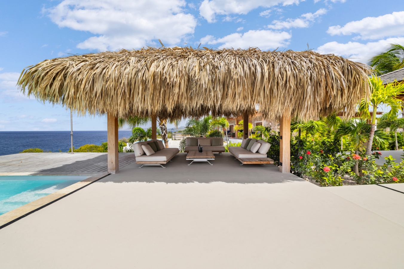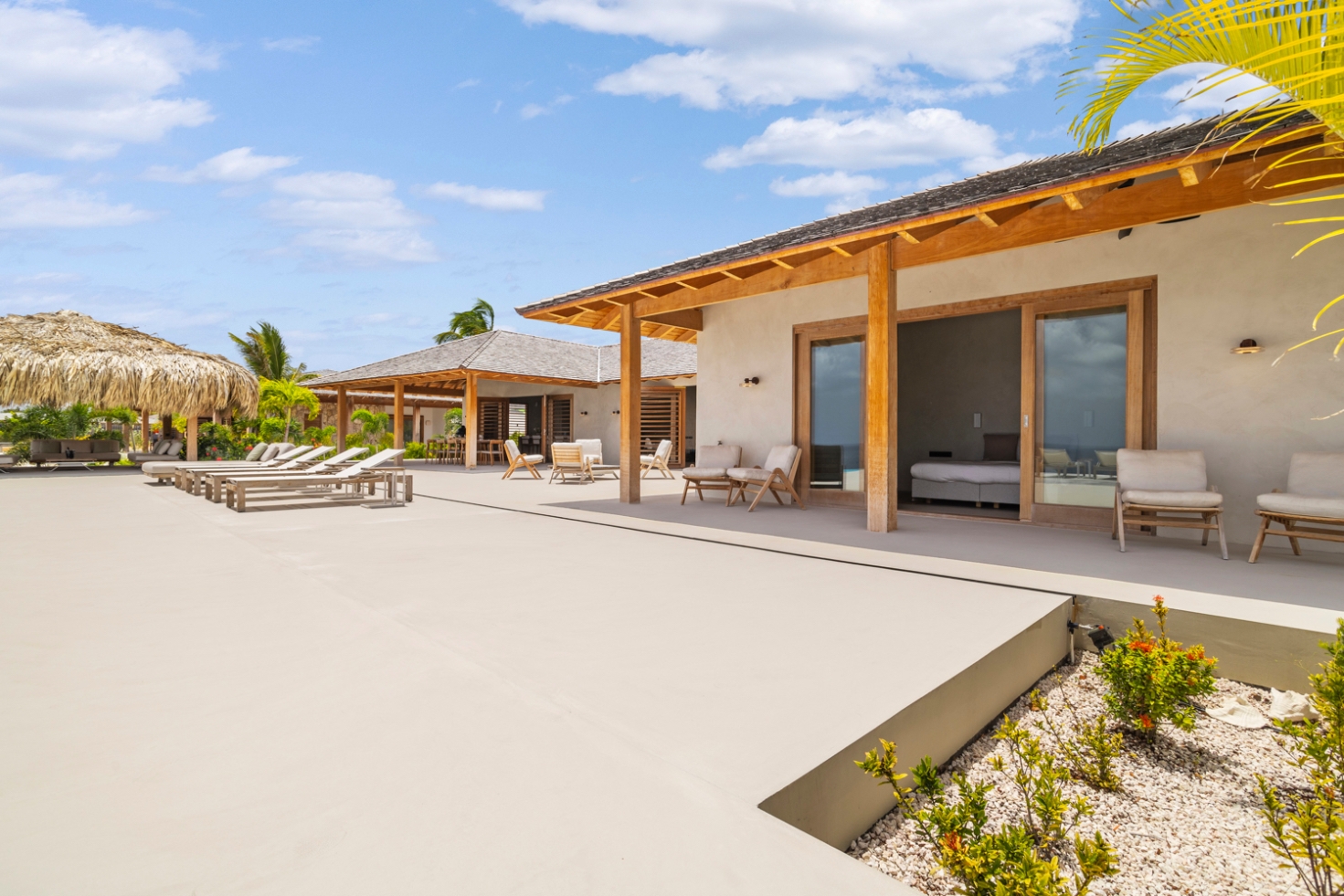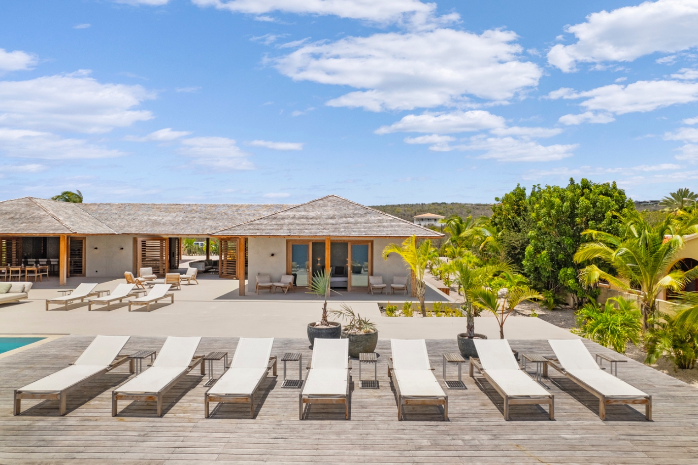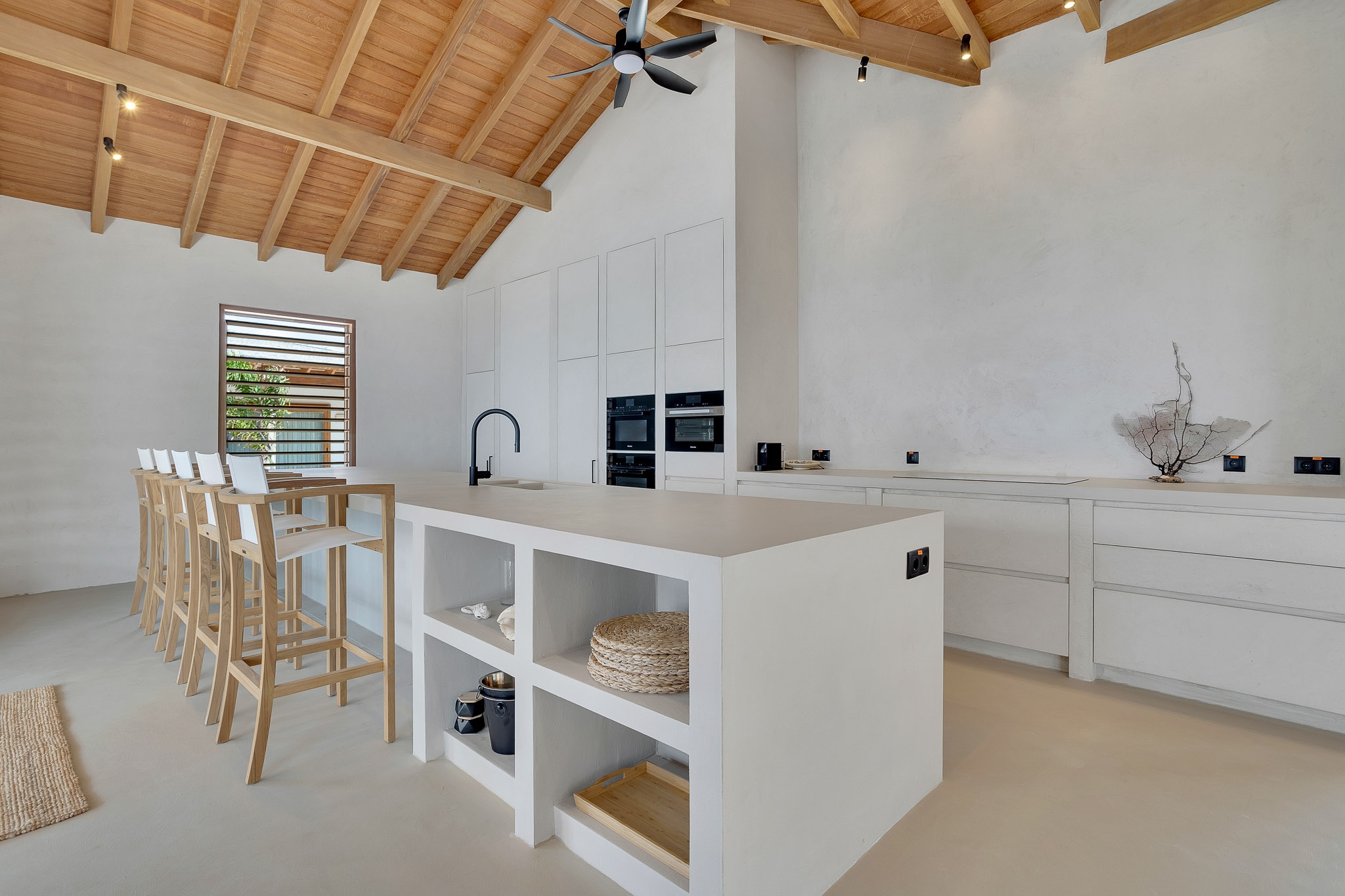 Le séjour, doté de hauts plafonds en bois et de vastes ouvertures, communique harmonieusement avec la terrasse de la piscine de 100 m² et la piscine au magnésium, agrémentées d’une palapa ombragée et d’un espace lounge pour une vie extérieure paisible. La cuisine ouverte se distingue par des appareils Miele haut de gamme, dont deux lave-vaisselle, une armoire à vin réfrigérée et une machine à glaçons, favorisant de longs moments conviviaux.