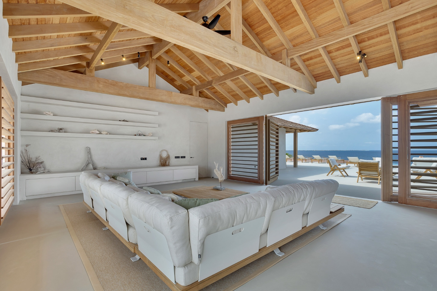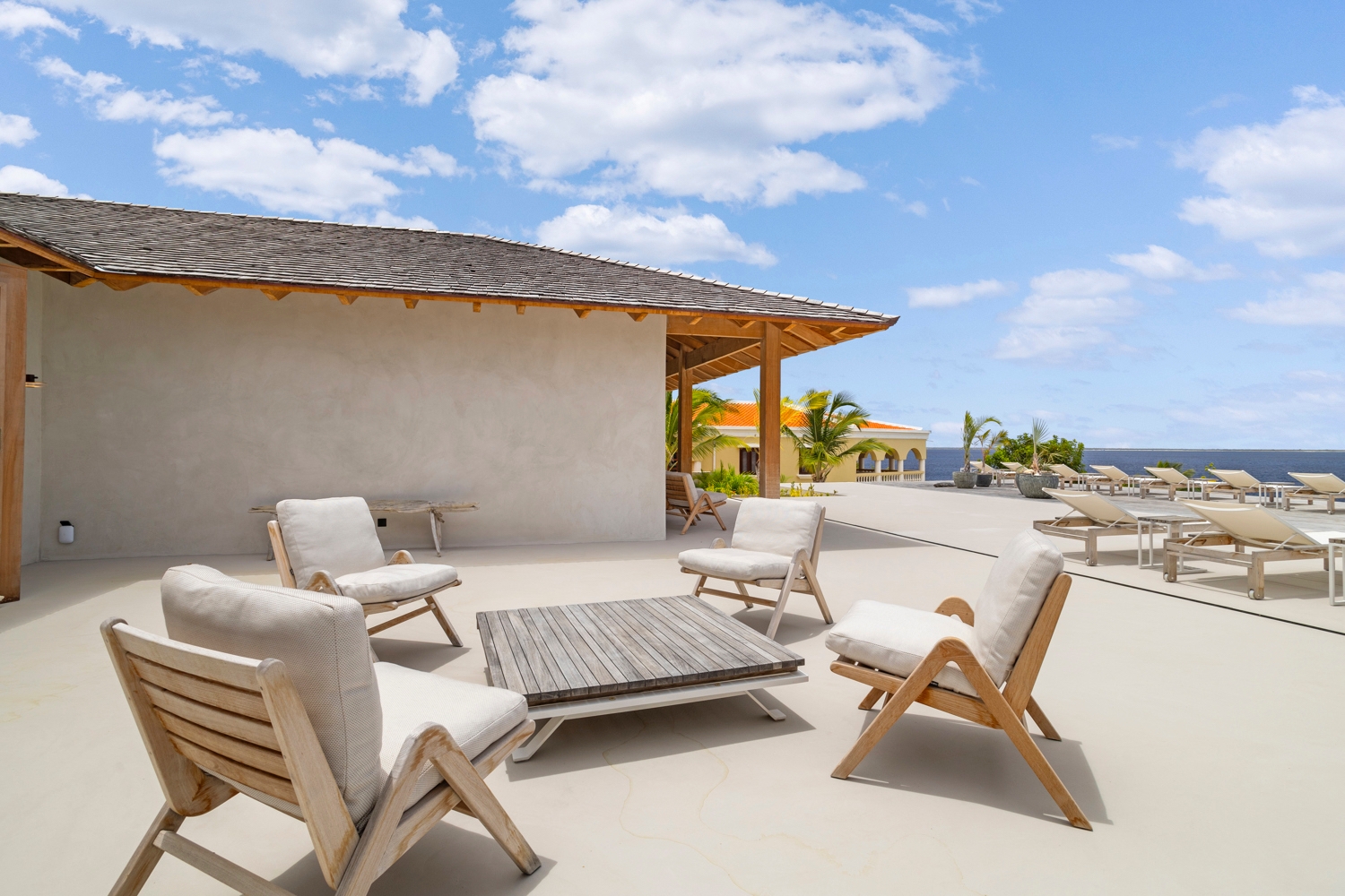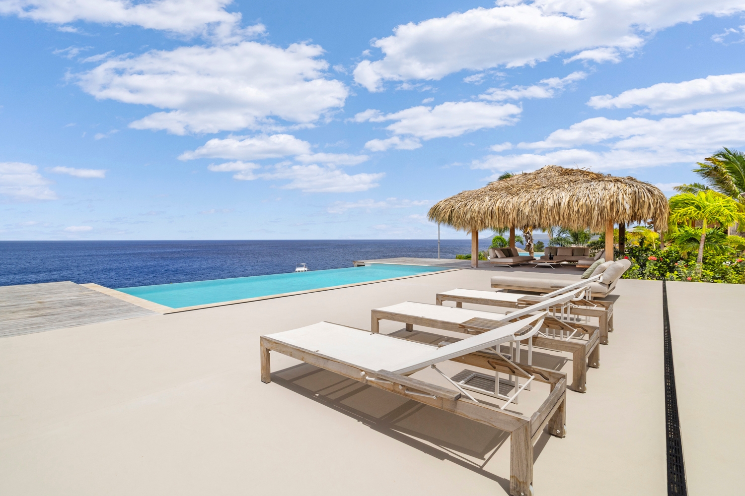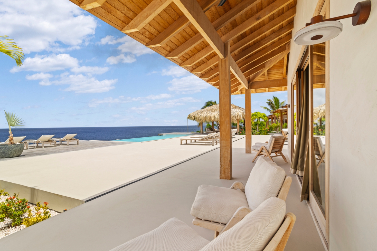 Le séjour, doté de hauts plafonds en bois et de vastes ouvertures, communique harmonieusement avec la terrasse de la piscine de 100 m² et la piscine au magnésium, agrémentées d’une palapa ombragée et d’un espace lounge pour une vie extérieure paisible. La cuisine ouverte se distingue par des appareils Miele haut de gamme, dont deux lave-vaisselle, une armoire à vin réfrigérée et une machine à glaçons, favorisant de longs moments conviviaux.