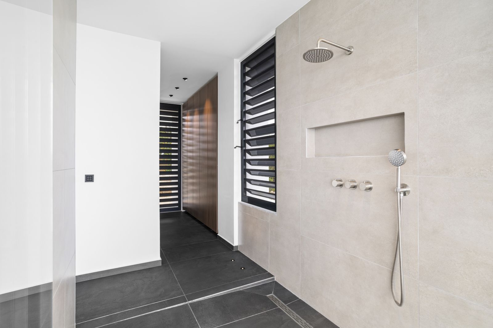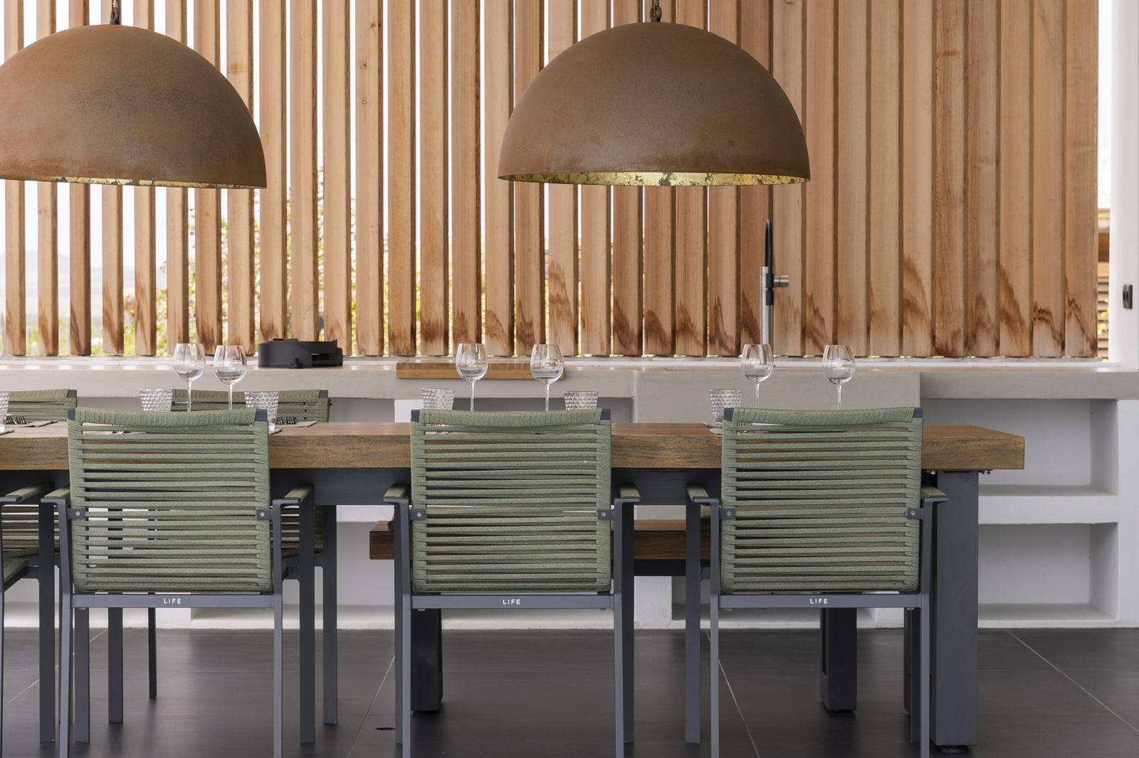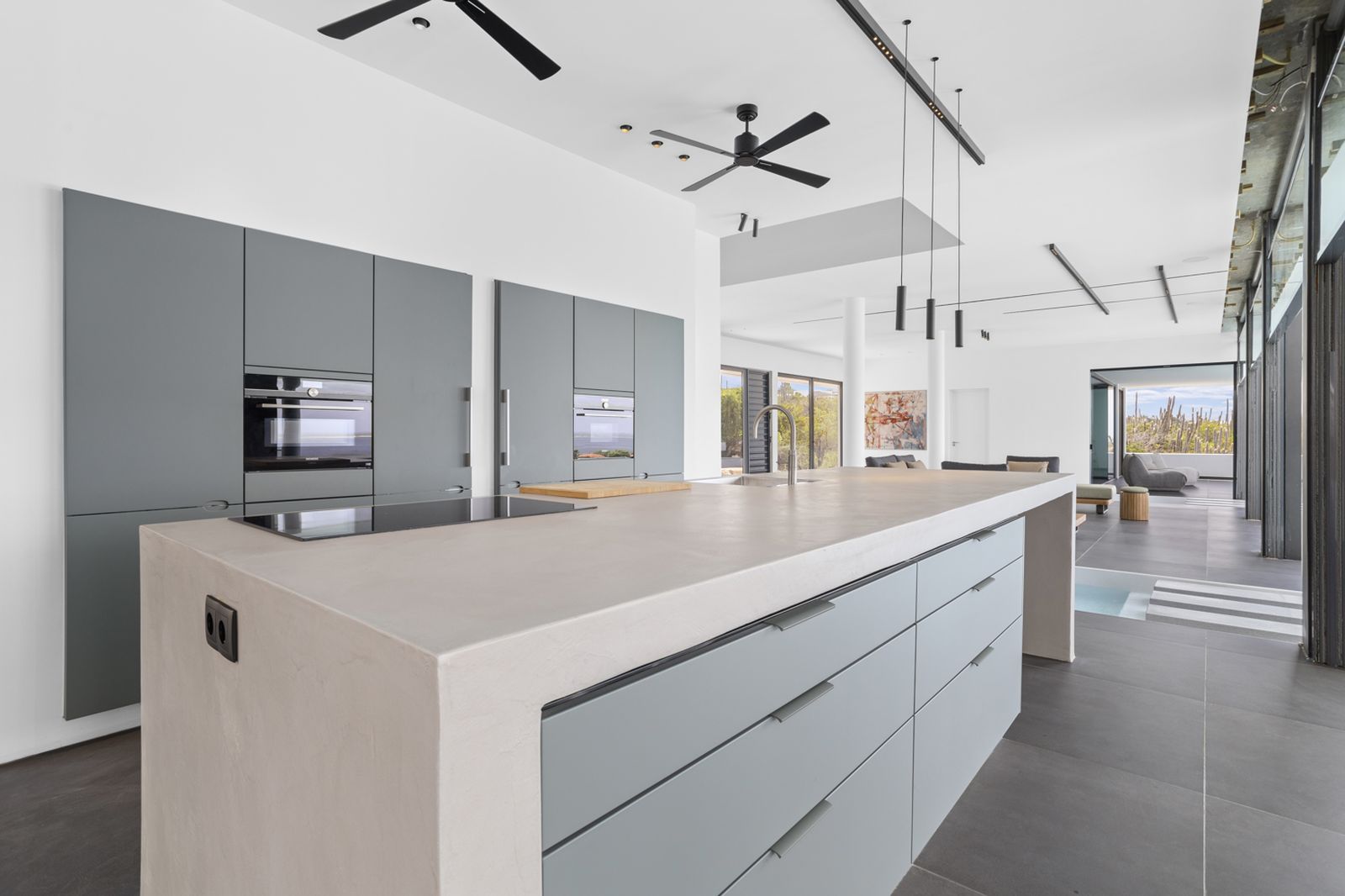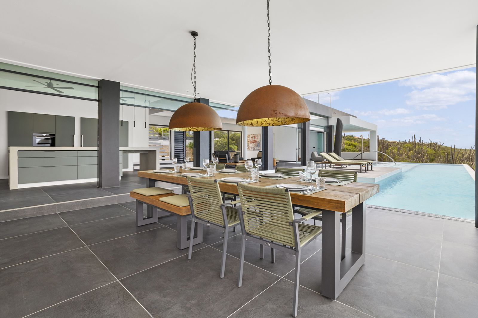 Exemple d’indépendance durable, la propriété fonctionne entièrement hors réseau, alimentée par 36 panneaux solaires et un système complet de batteries Victron. À l’extérieur, la prestation est tout aussi remarquable : une piscine à débordement de près de 19 mètres, offrant 116 m² de surface, l’une des plus grandes piscines privées de Bonaire. Nombreuses terrasses, cuisine extérieure équipée Green Egg et brûleur wok, espace réfrigéré, installation dédiée à l’équipement de plongée, tout est pensé pour le loisir et la convivialité.